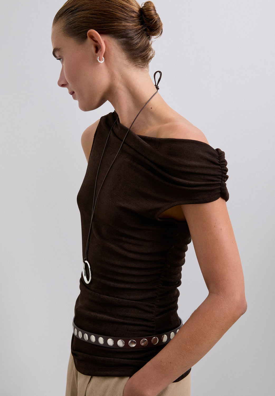 Top Asimétrico Frunces de Scalpers para mujer. Pertenece a la categoría Poleras / Poleras Manga Corta. Temporada AW26. Color: BROWN. Top confeccionado en tejido ligeramente elástico. Corte slim fit, Off The Shoulder, escote asimétrico con frunces en laterales.