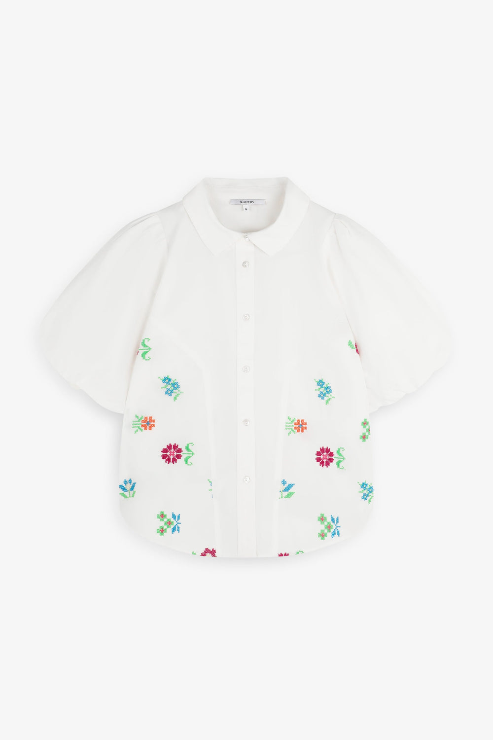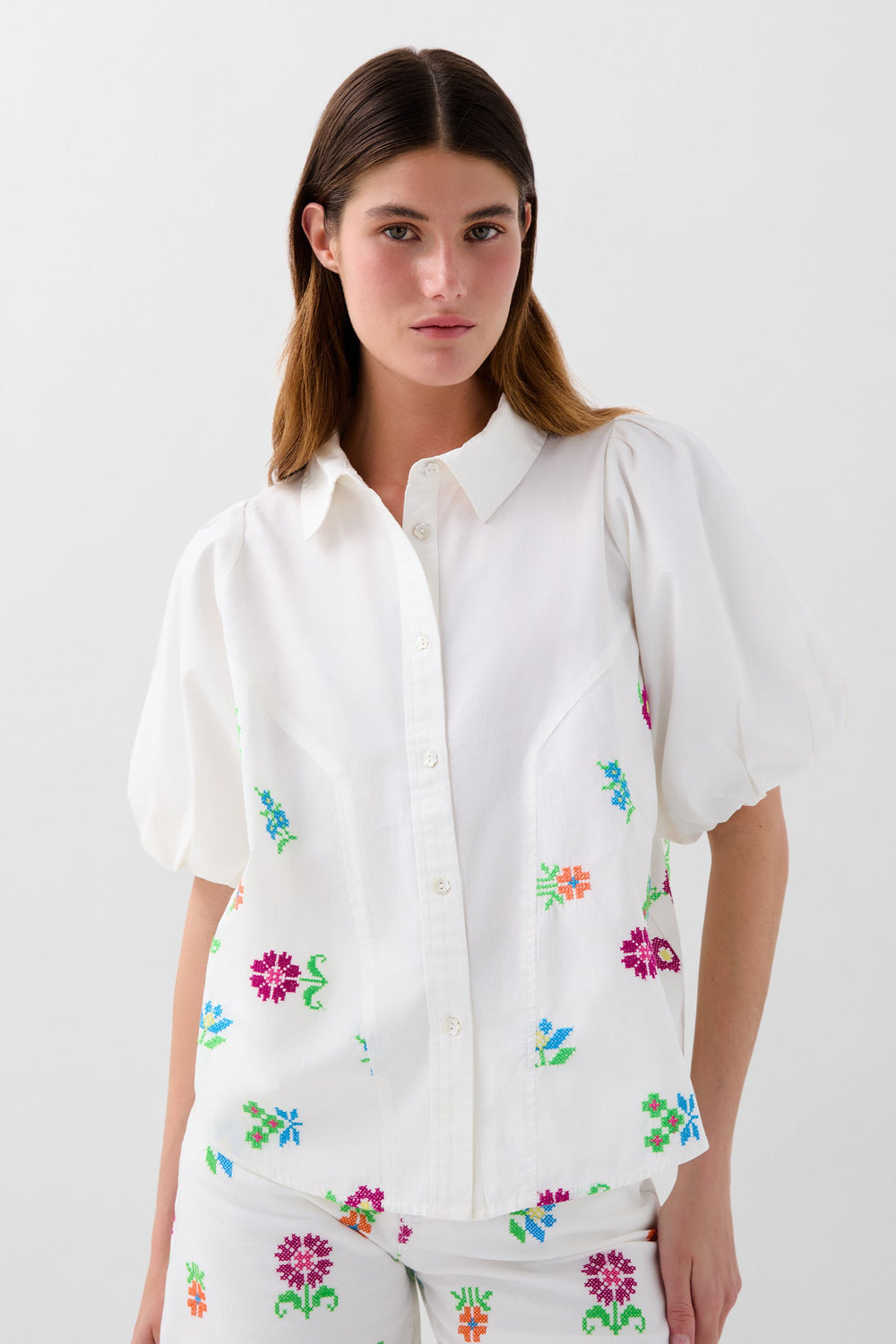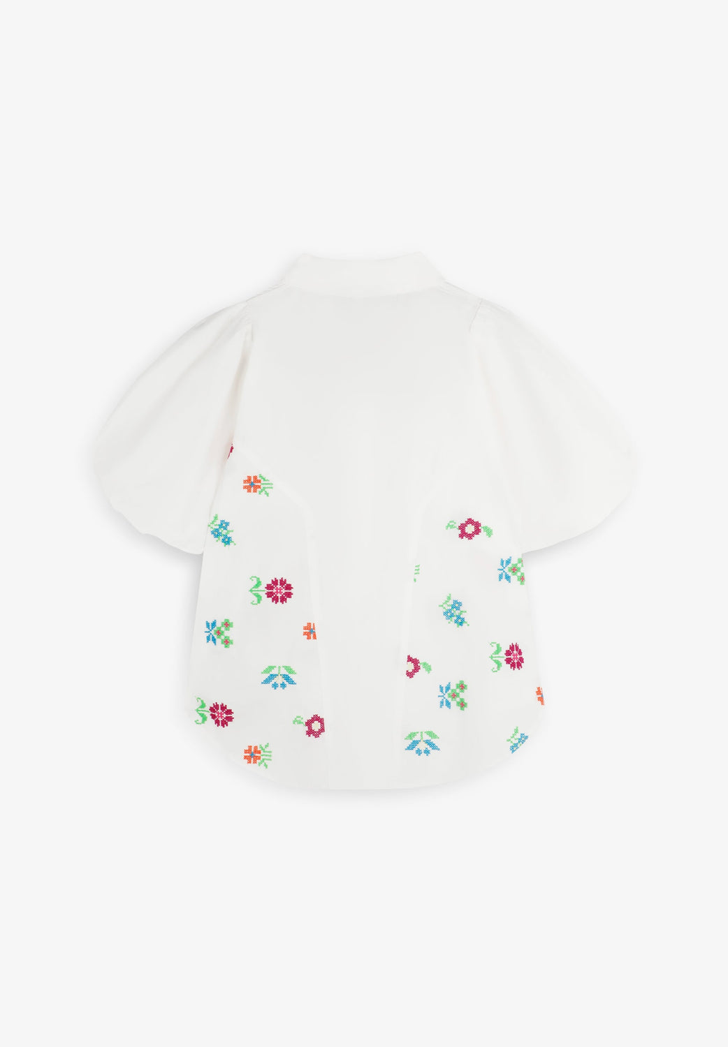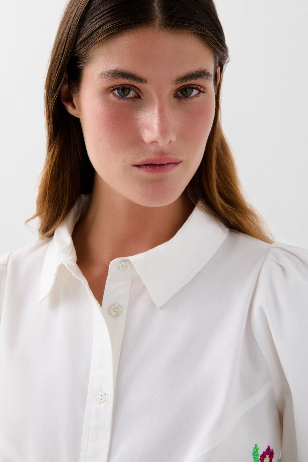 Camisa confeccionada en algodón 100% con detalles bordados. Corte regular fit, manga corta abullonada, cuello camisero y cierre con botones.