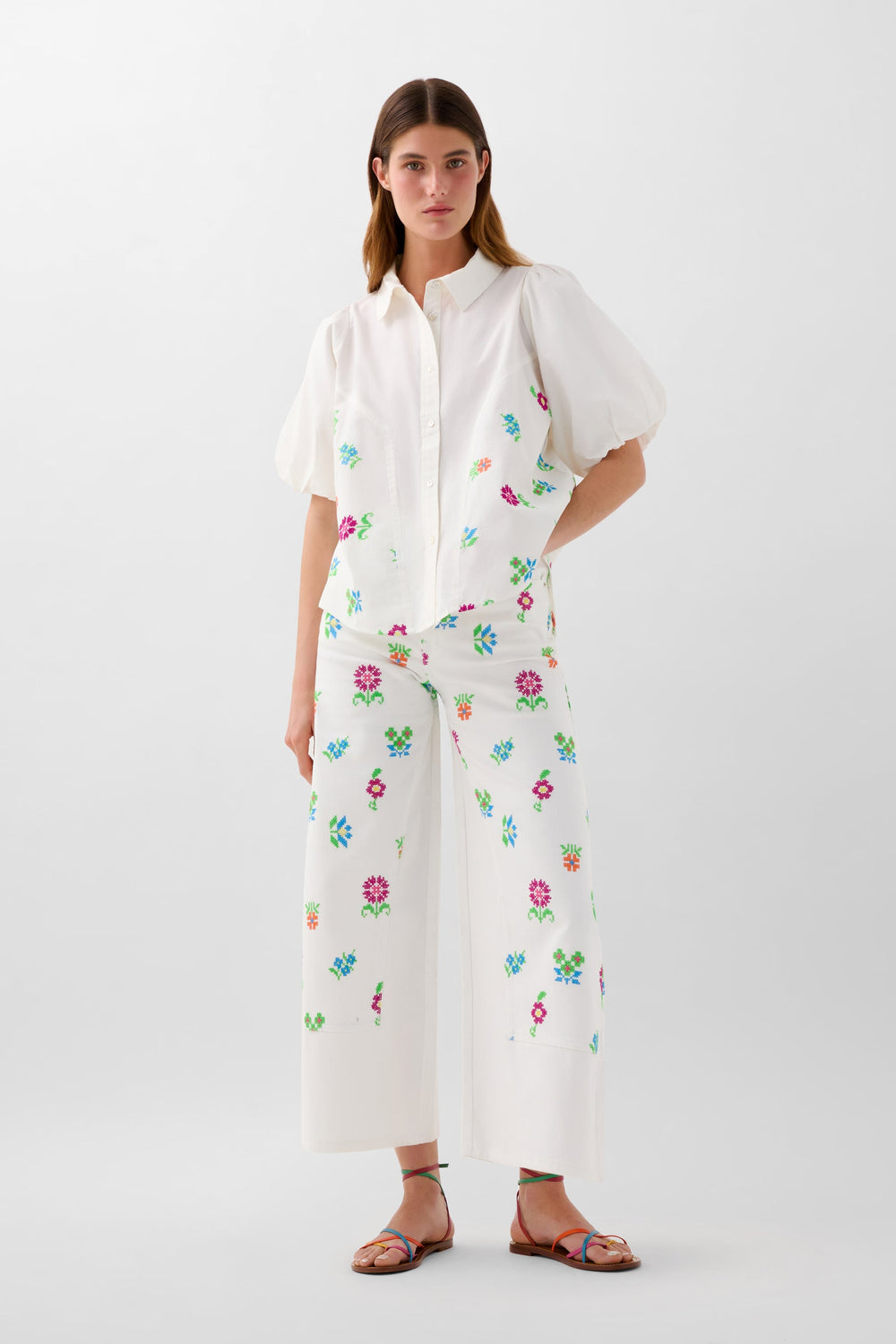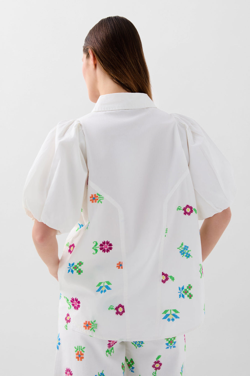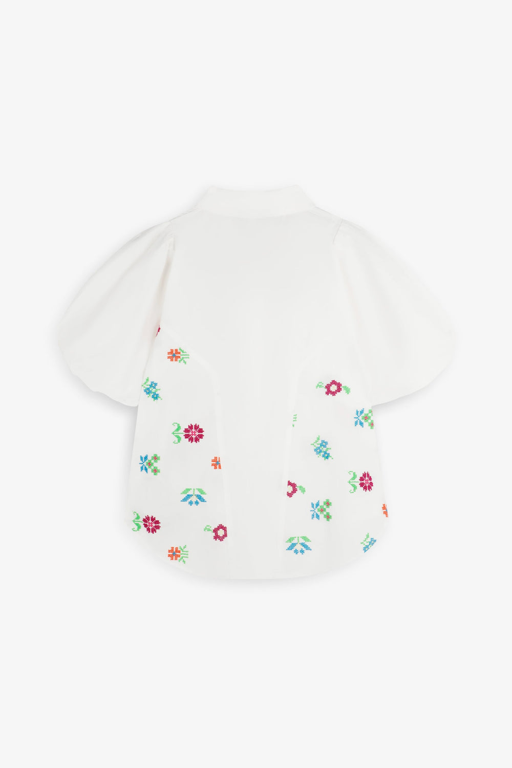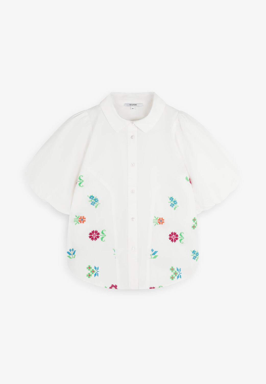 Camisa confeccionada en algodón 100% con detalles bordados. Corte regular fit, manga corta abullonada, cuello camisero y cierre con botones.