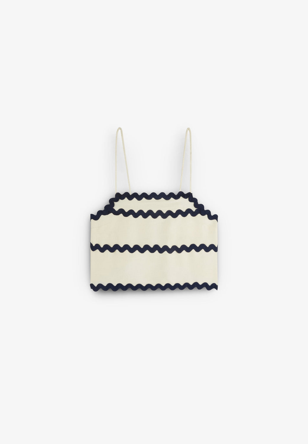 Top de tirantes finos y escote recto. Detalle de ondas a contraste. Corte cropped.