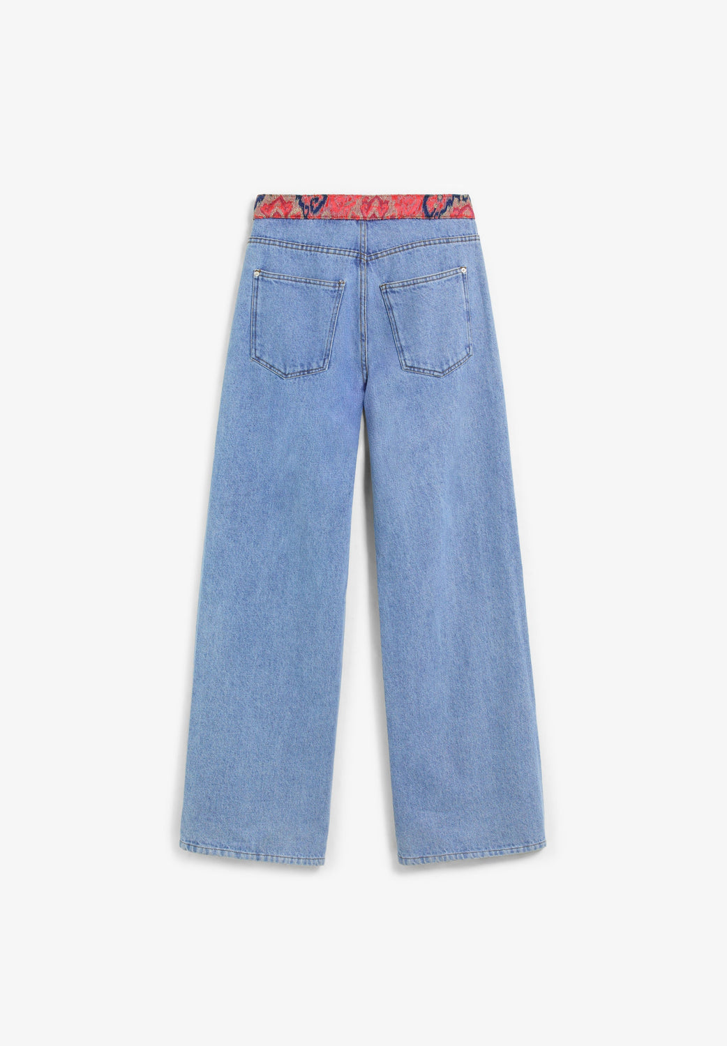 Pantalón denim largo, de tiro medio. Tejido de contraste en la cintura. Cierre mediante botón. Bolsillos delanteros y traseros.