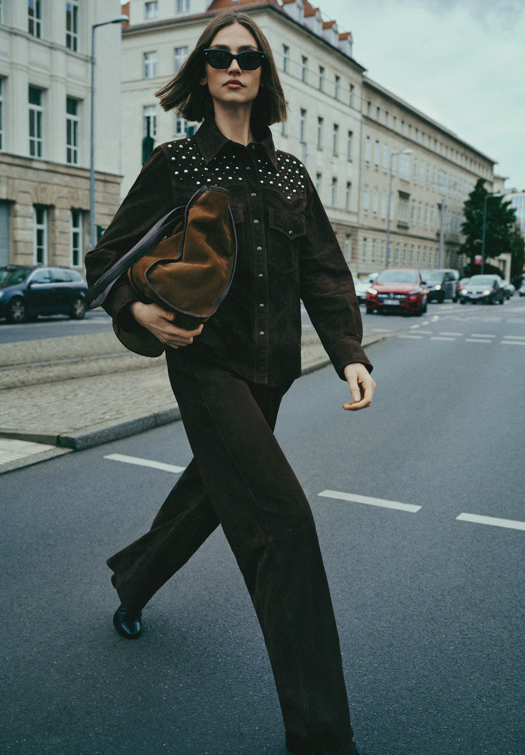 Camisa confeccionada 100% en ante. Manga larga y cierre con botones en la parte frontal y en las mangas. Detalle de costuras en la espalda. Detalle de tachuelas al rededor del cuello.