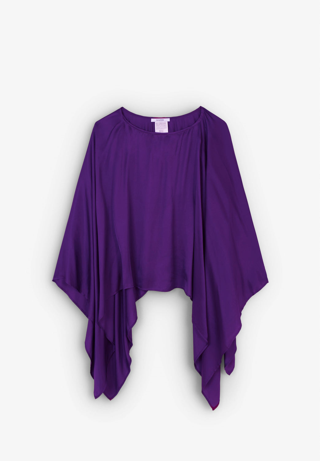 Capa amplia y ligera. Mangas integradas. Cuello redondo. Bajo asimétrico, con picos en los lados.