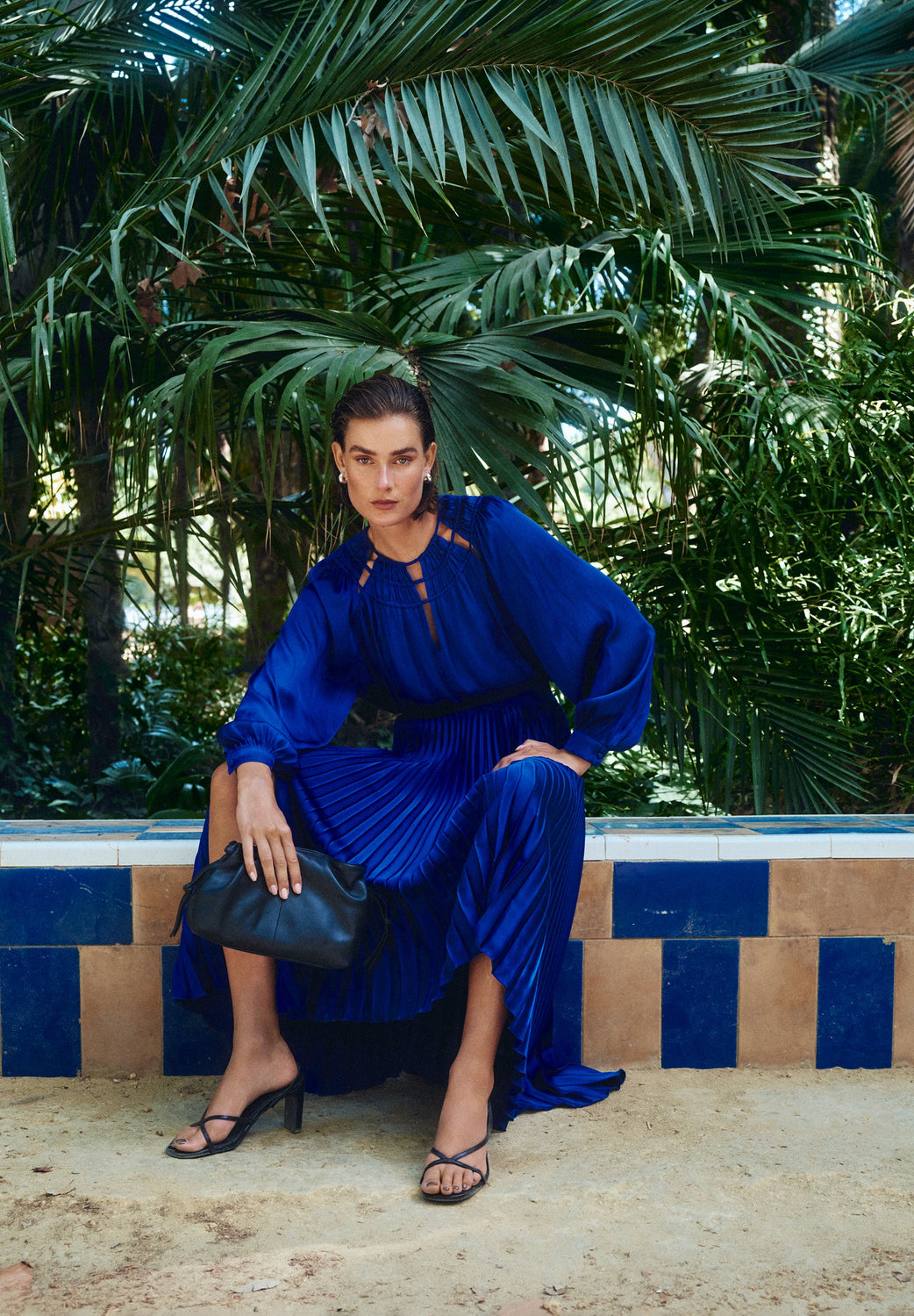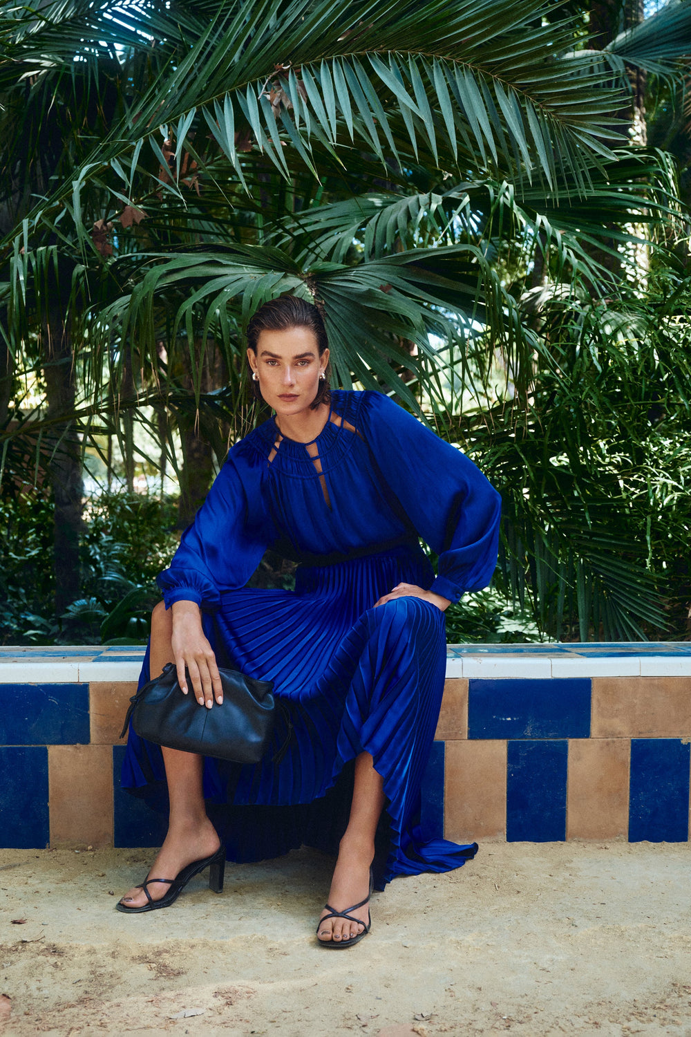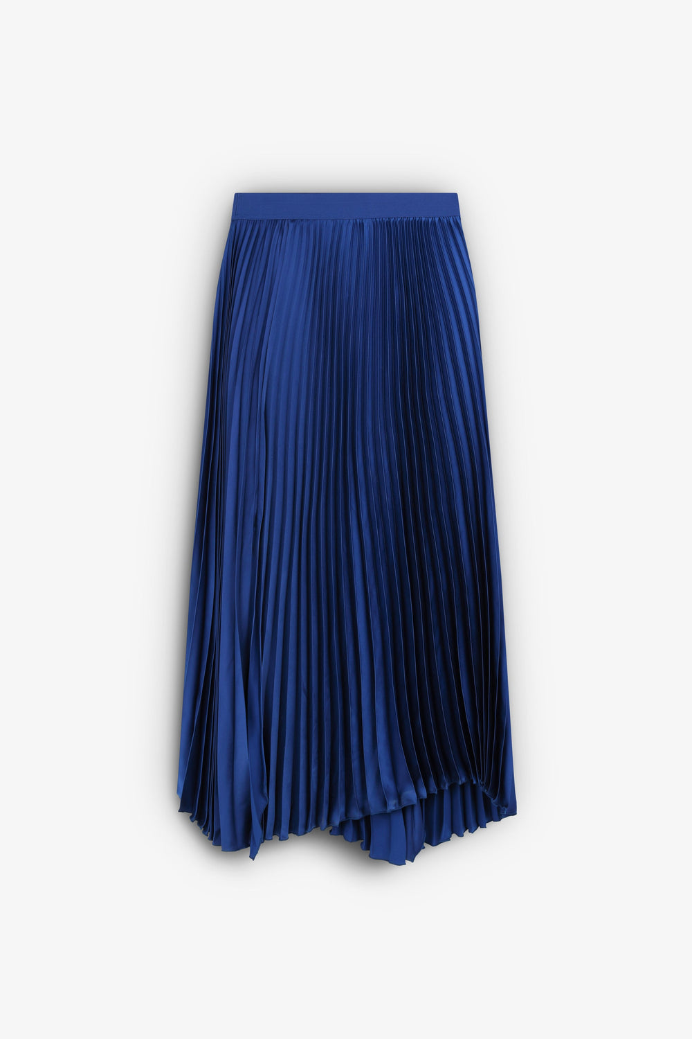 Falda midi con tablas confeccionada en tejido fluido. Regular fit, cierre con cremallera y bajo asimétrico.