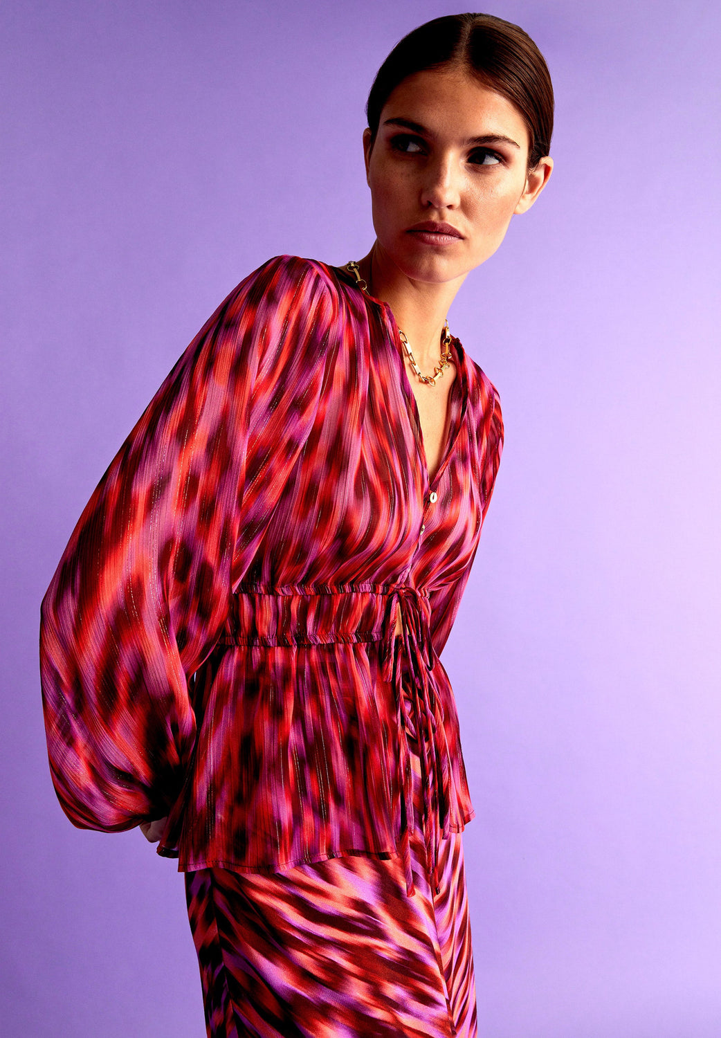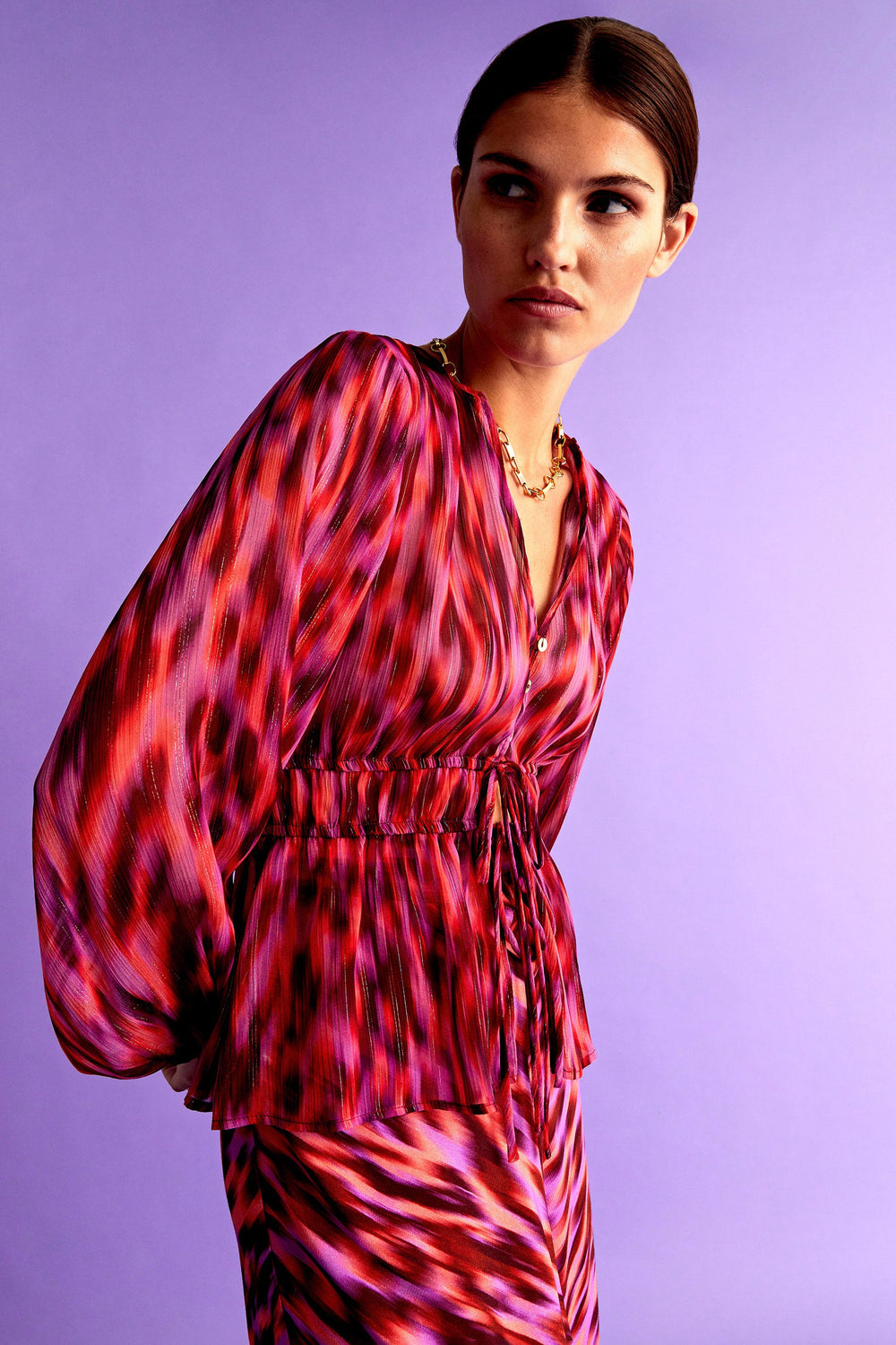- Confeccionada en tejido fluido con detalle de hilatura metalizada