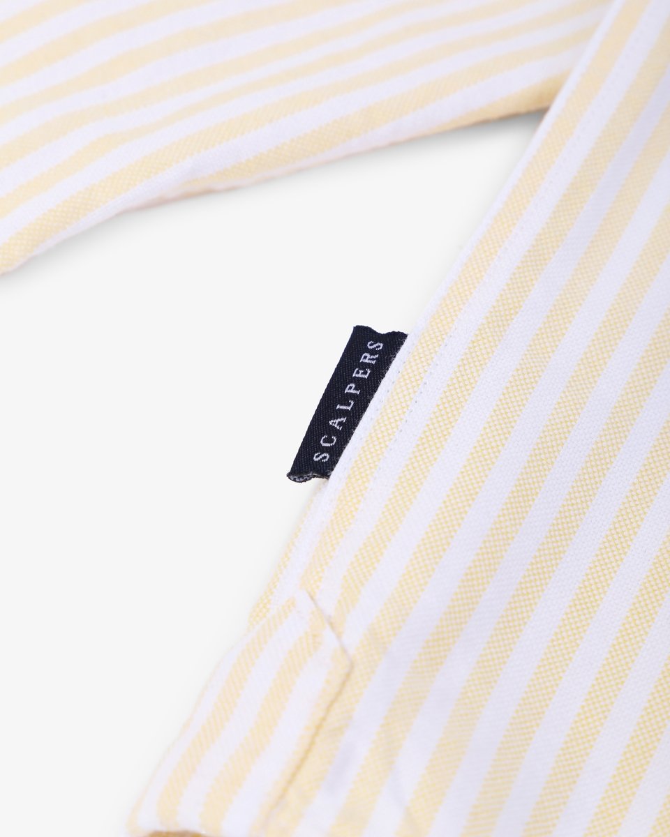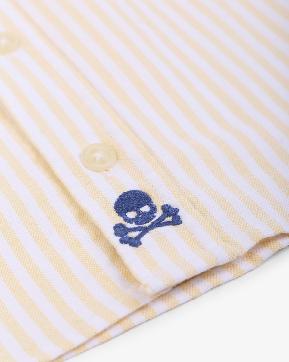 Camisa con rayas verticales, confeccionada en tejido oxford. Corte recto, cuello button down y cierre con botones. Bolsillo de ojal a la altura del pecho cerrado con botón con detalle de vivos y manga larga terminada en puño. Disponible en dos colores.