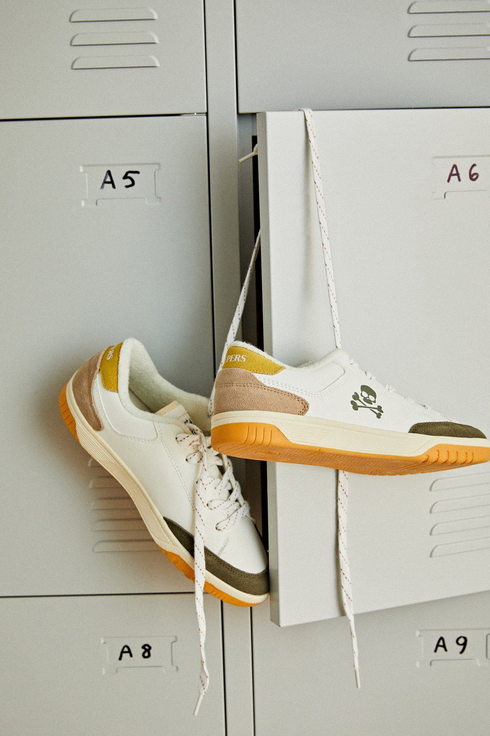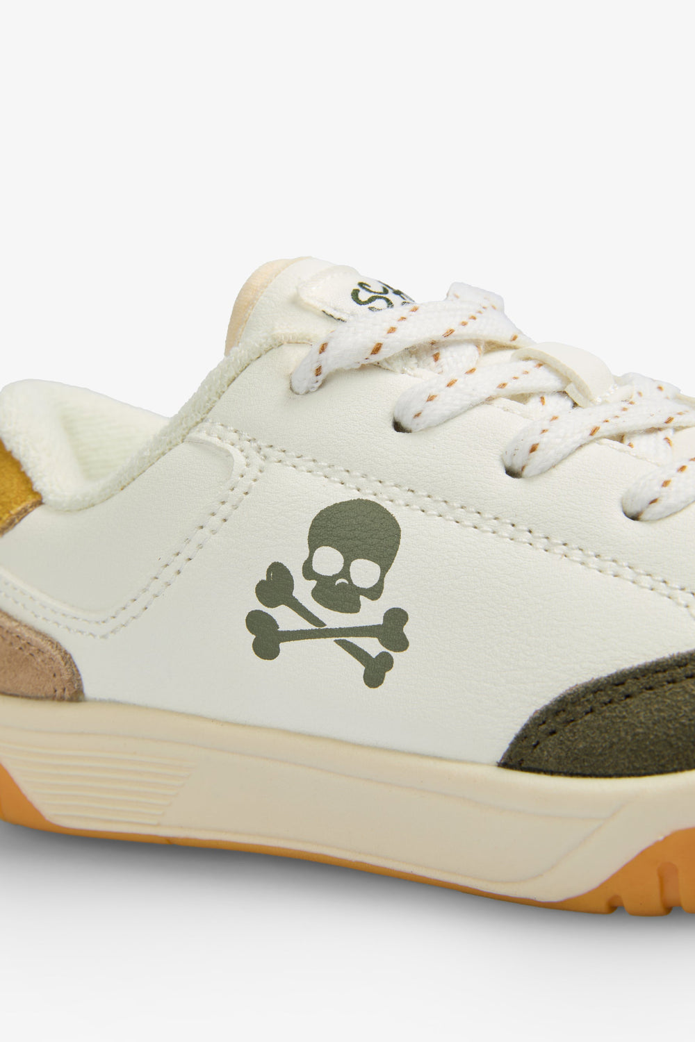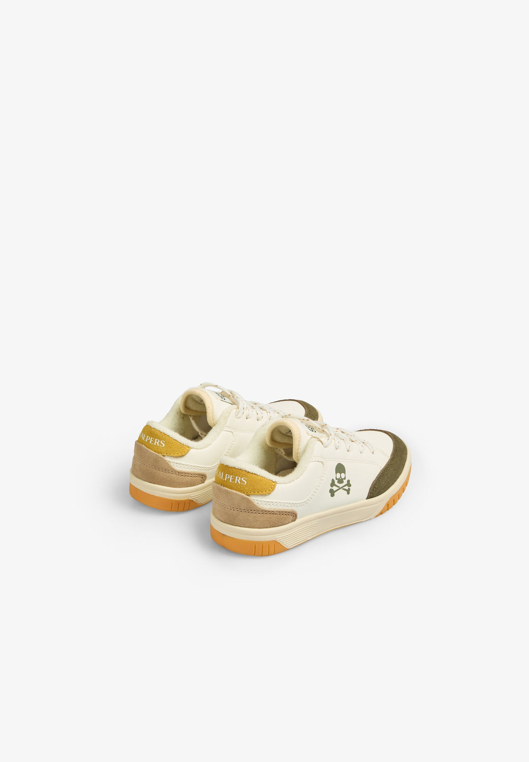 Sneakers confeccionadas en piel con detalles en serraje. Cierre con cordones a tono, suela de goma y talón a contraste. Calavera lateral.