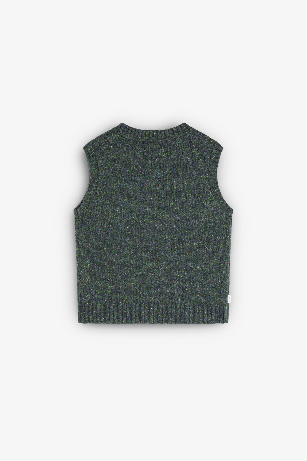 Chaleco de punto confeccionado en tejido reciclados. Regular fit, cuello redondo y manga en sisa.