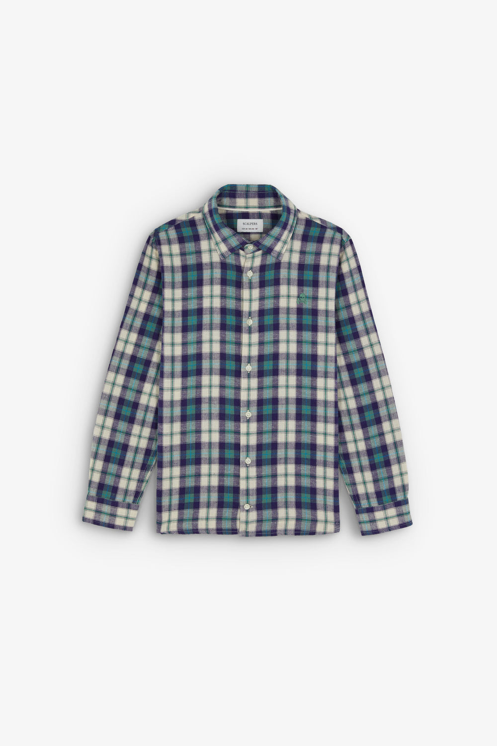 Camisa de cuadros confeccionada en mezcla de algodón BCI y lino. Regular fit, cuello clásico y cierre con botones. Manga larga terminada en puño y calavera bordada con botones.
