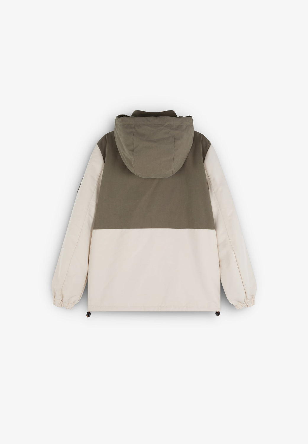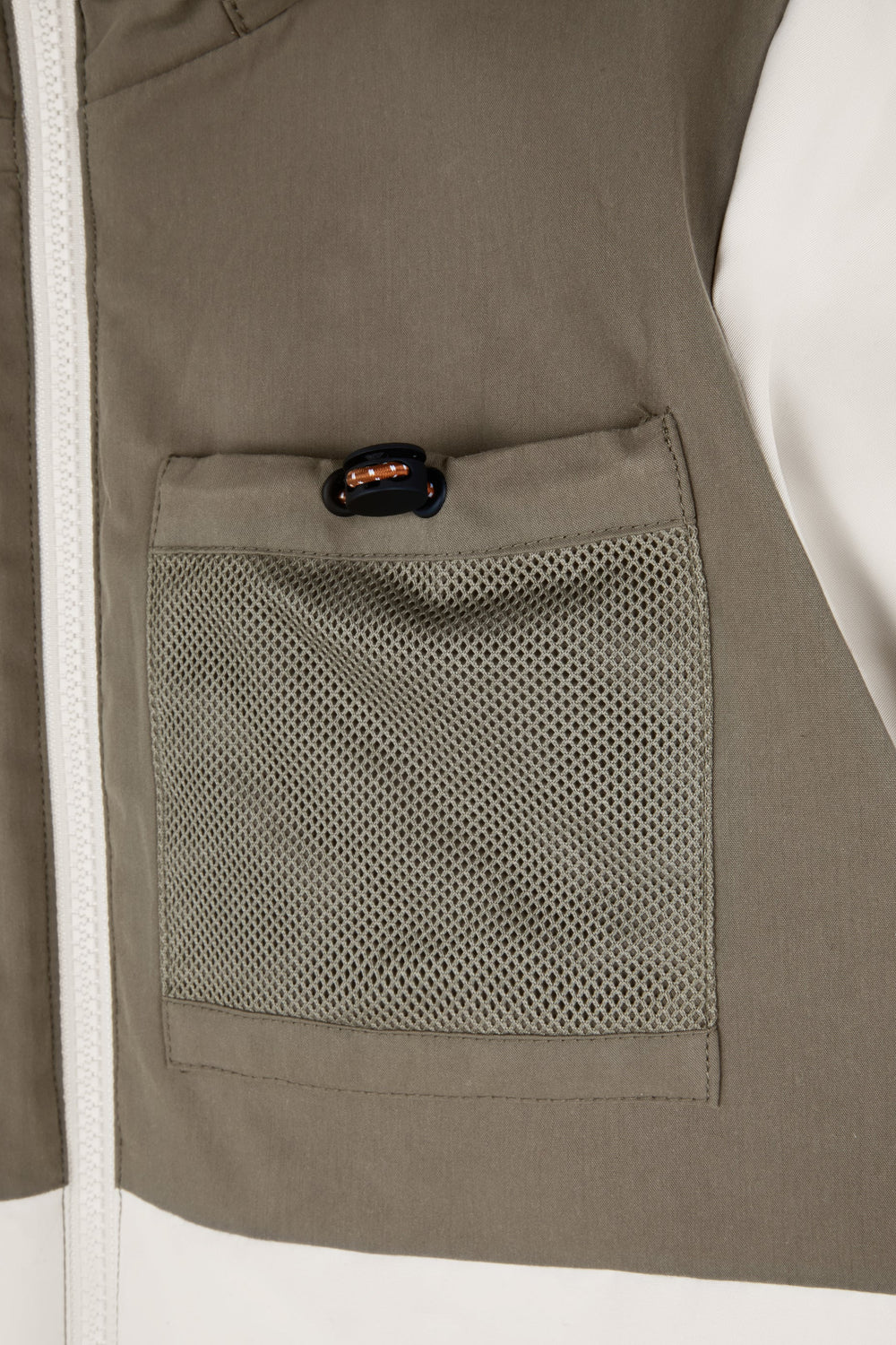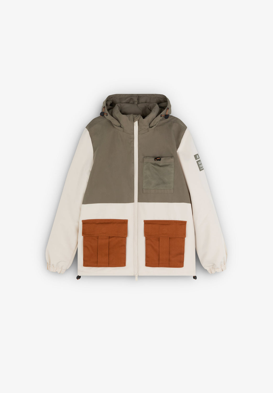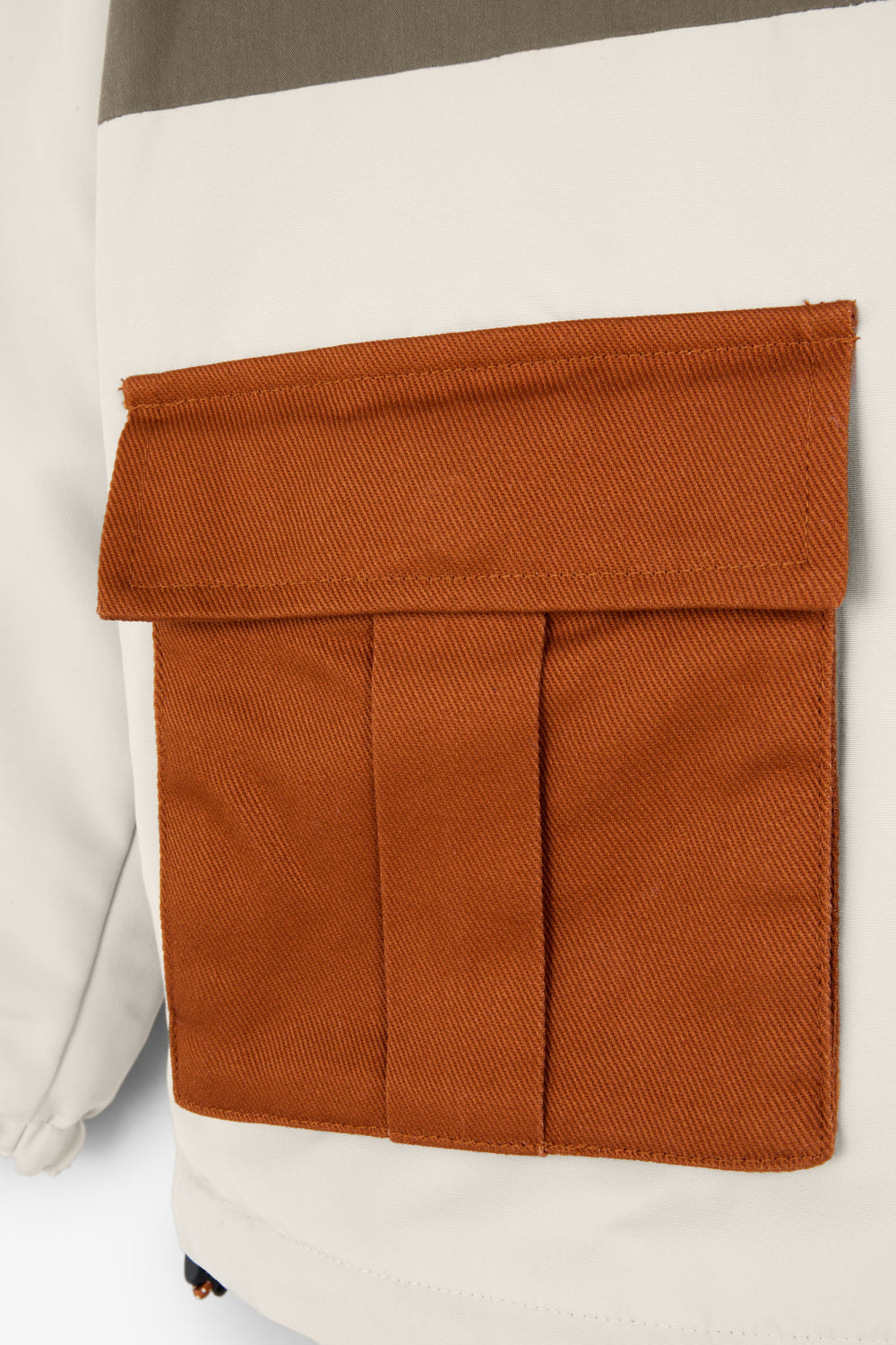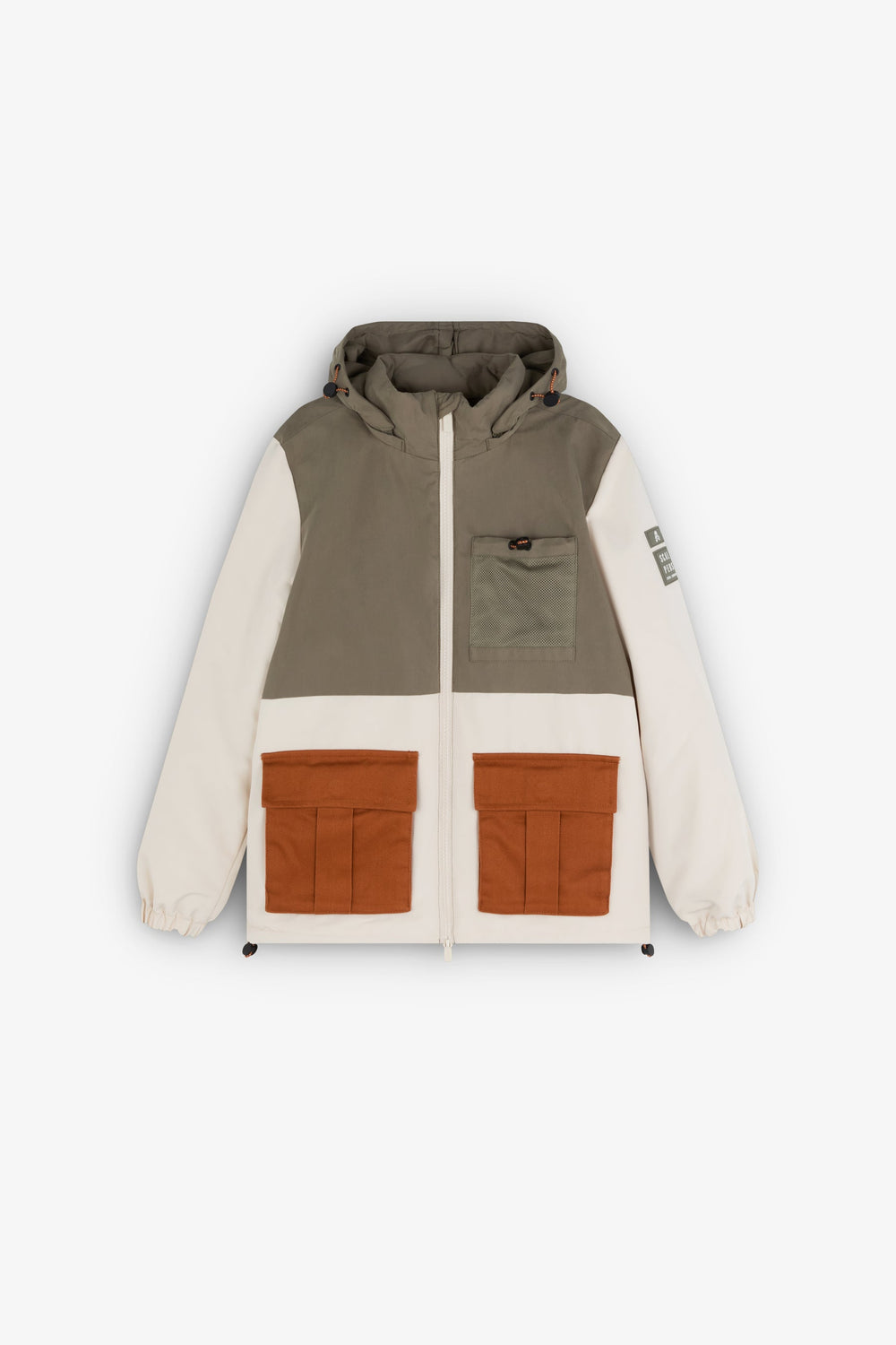 Chaqueta confeccionada en algodón y tejido reciclado. Regular Fit, cuello con capucha ajustable y cierre con cremallera. Manga larga terminada en puño y parche lateral. Bolsillos frontales y en el pecho y ajustable en el bajo. Forro de borrego.