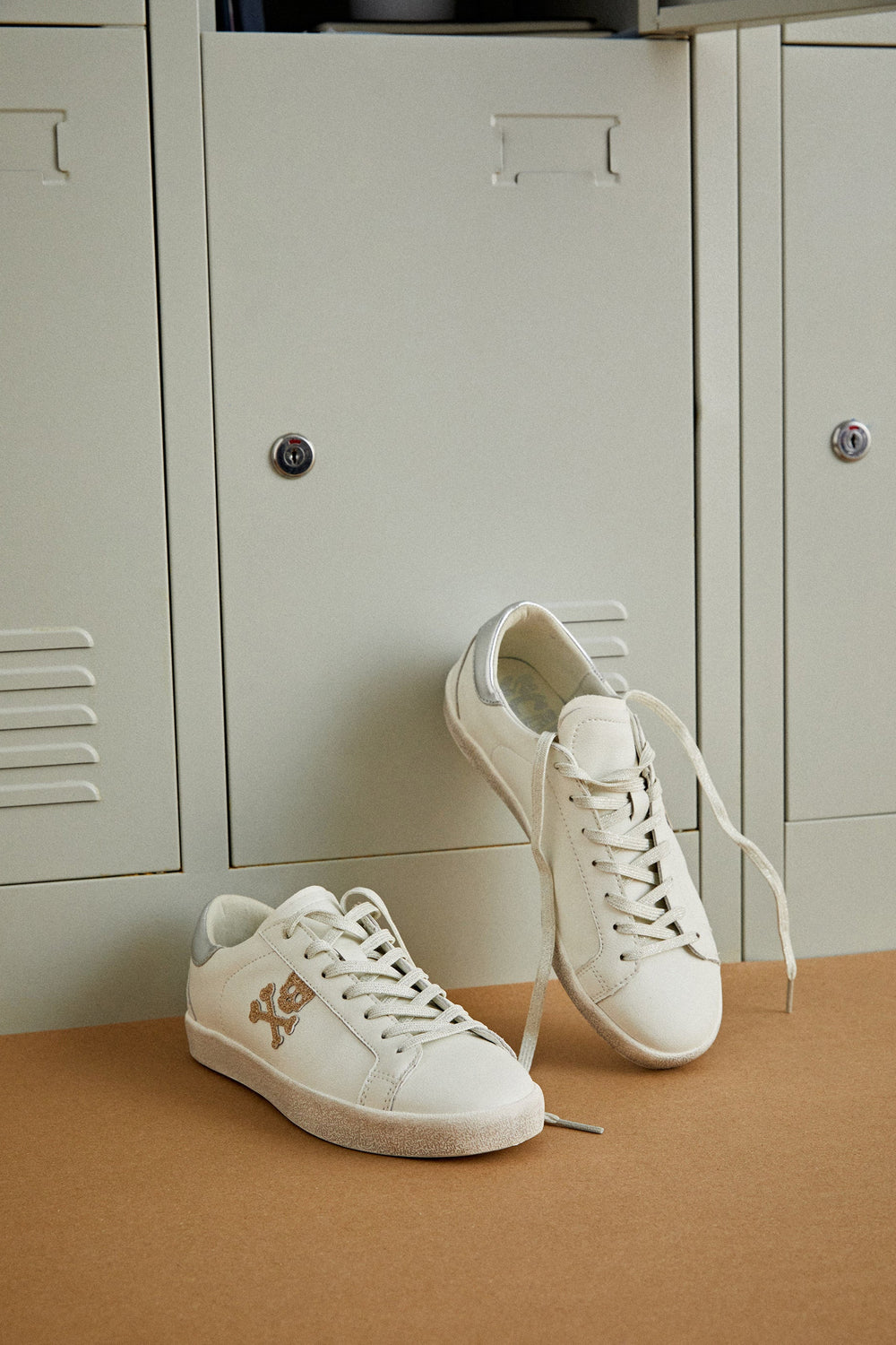 Sneakers bajas en glitter confeccionadas en 100% piel. Cierre con cordones, suela de caucho y calavera lateral.