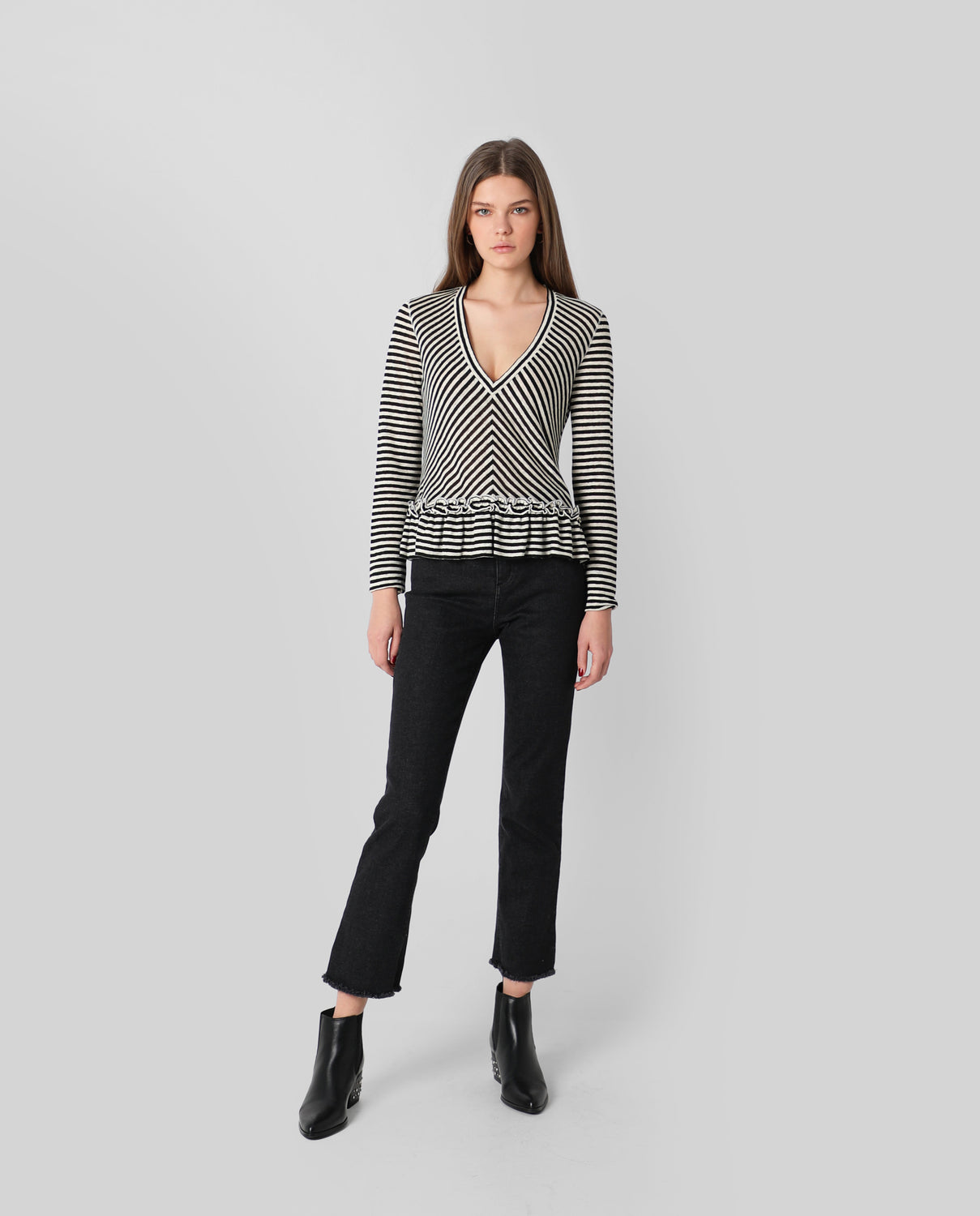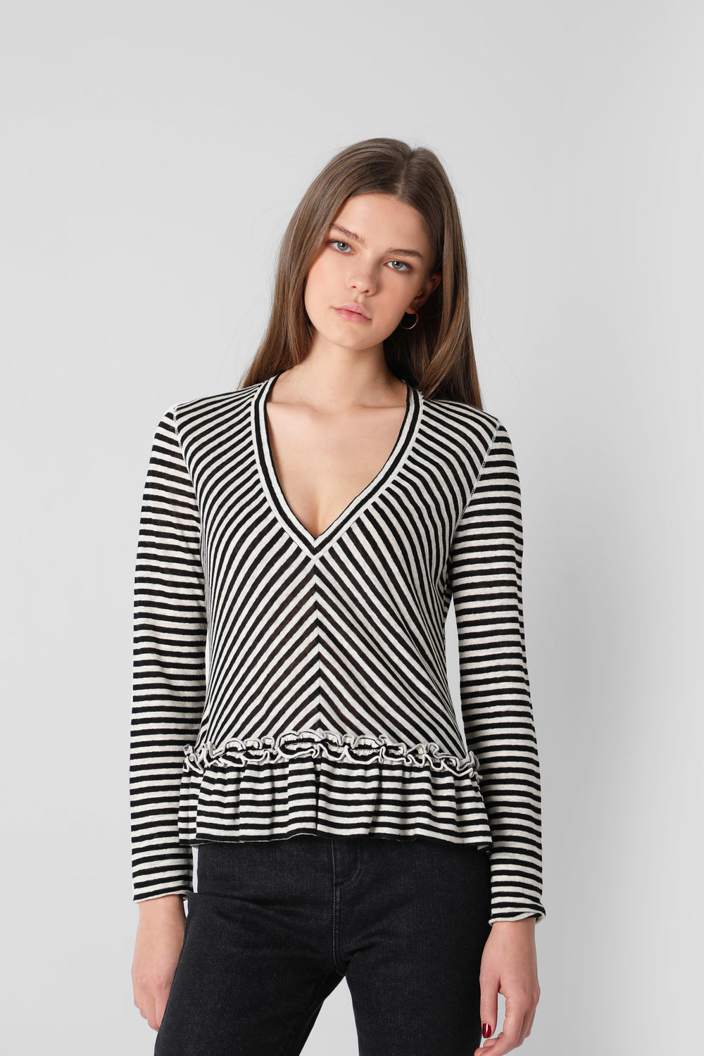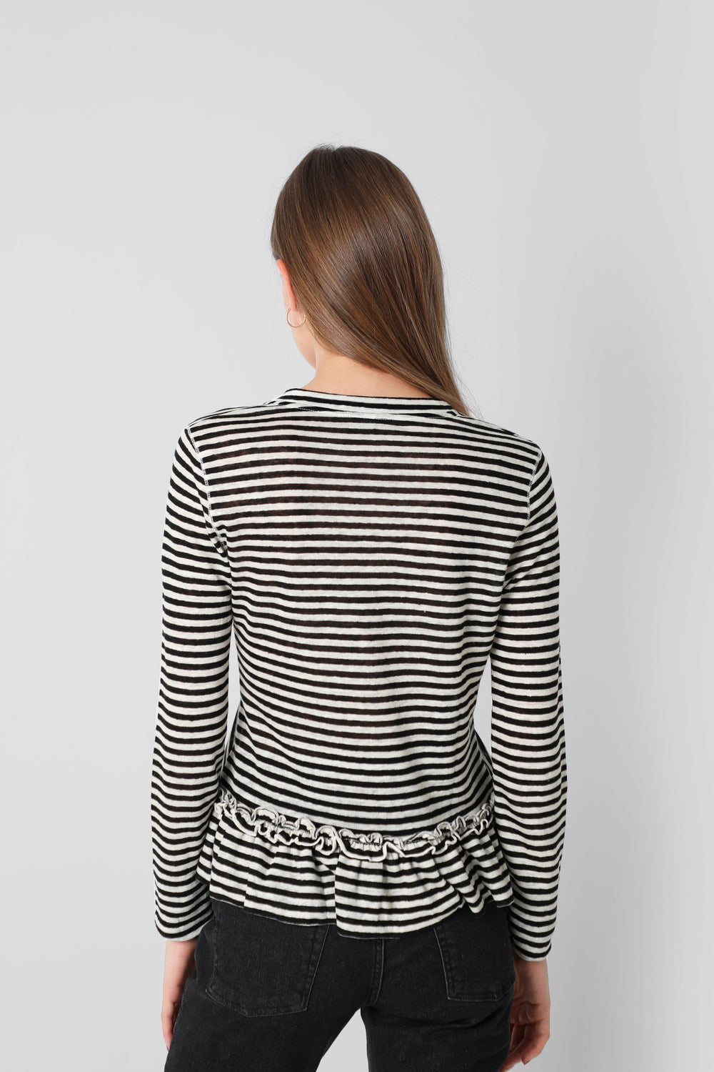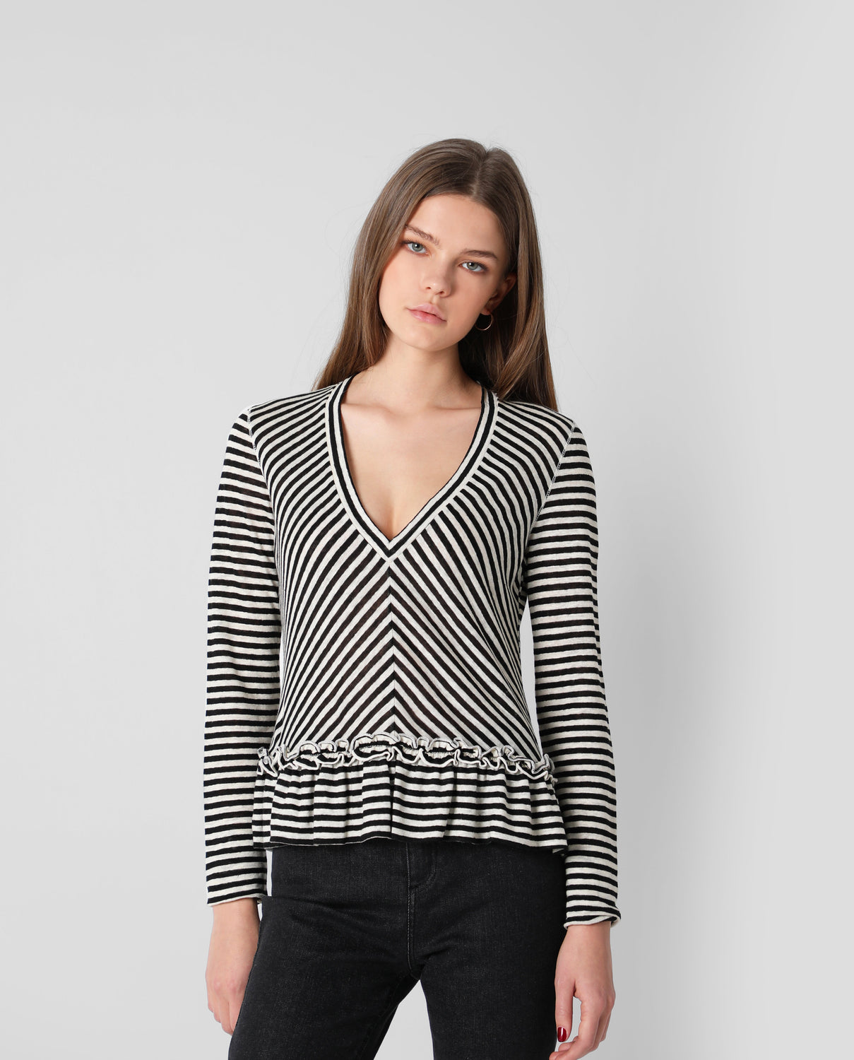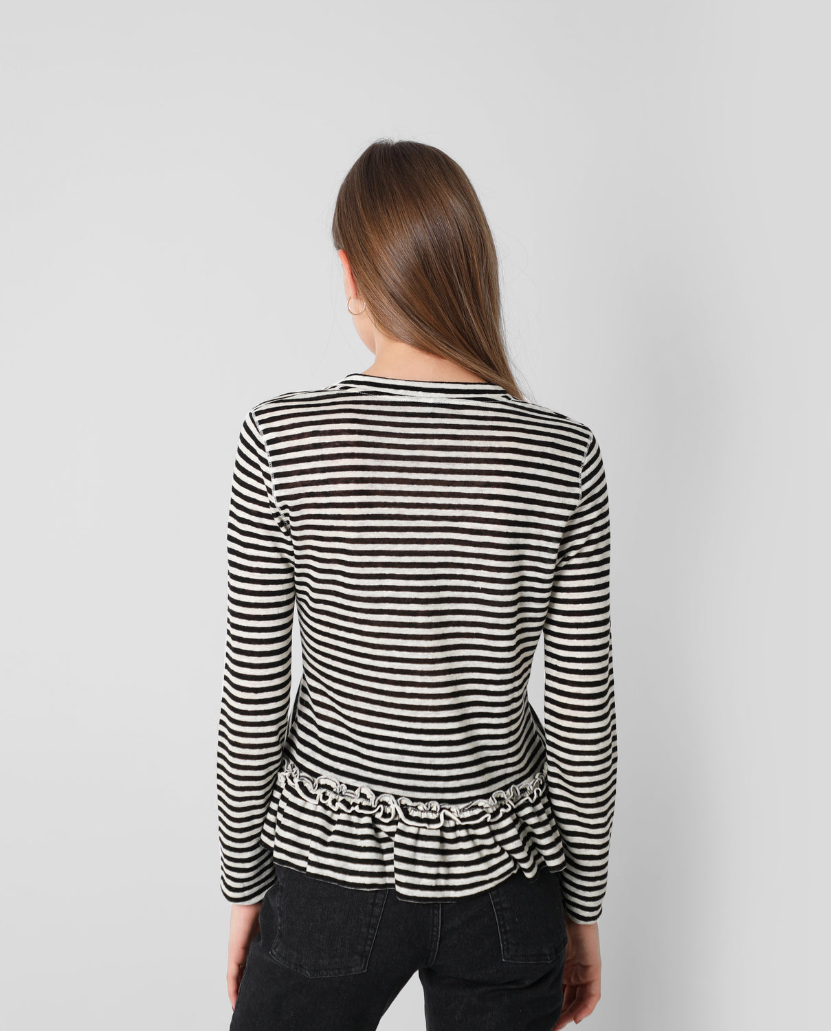 Camiseta de rayas confeccionada en tejido 100% lino. Corte slim fit, cuello de pico y manga larga. Presenta como detalle los volantes en el bajo.
