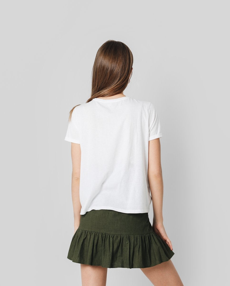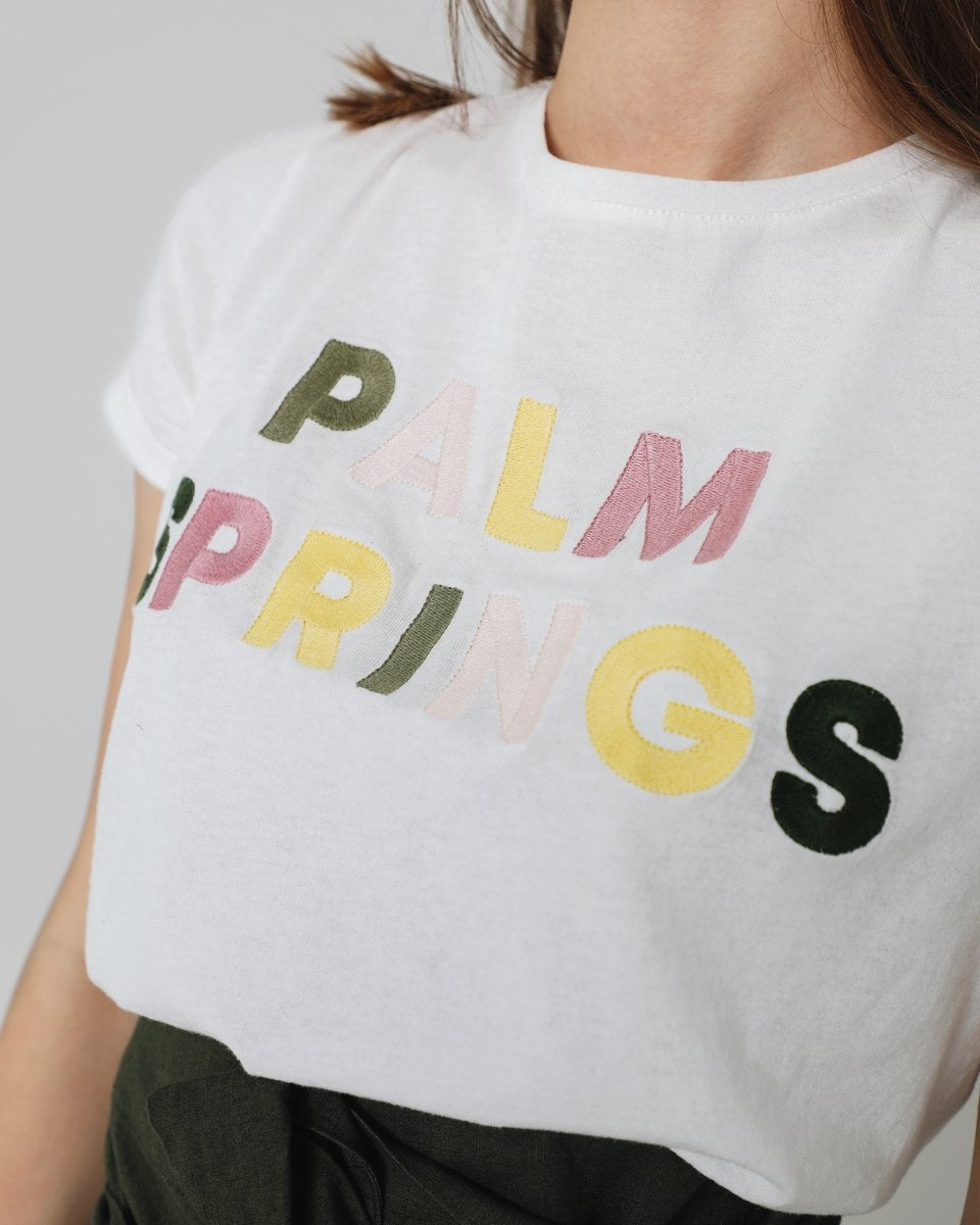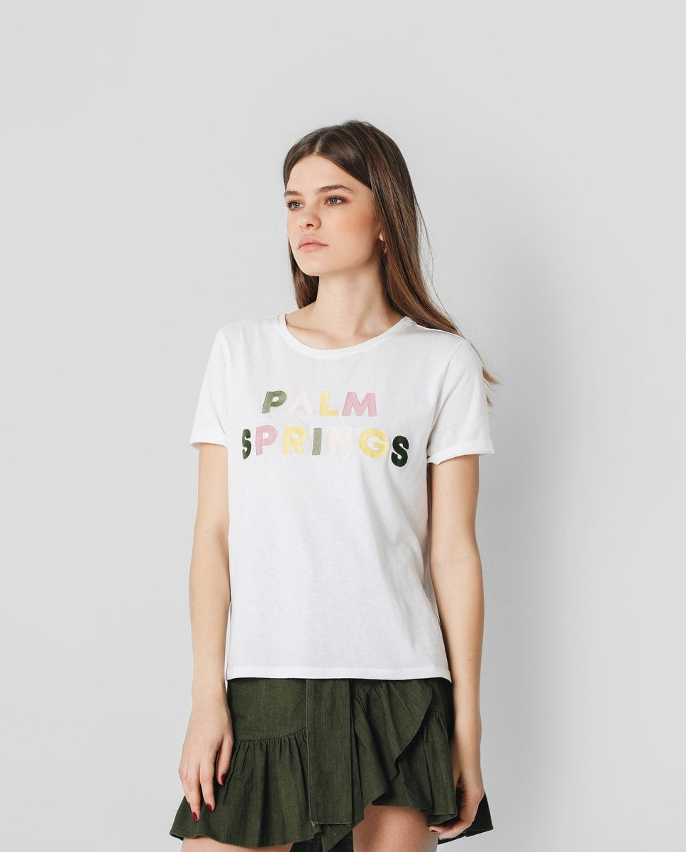 Camiseta con texto de colores bordado, confeccionada en tejido 100% algodón. Corte recto, cuello redondo y manga corta.