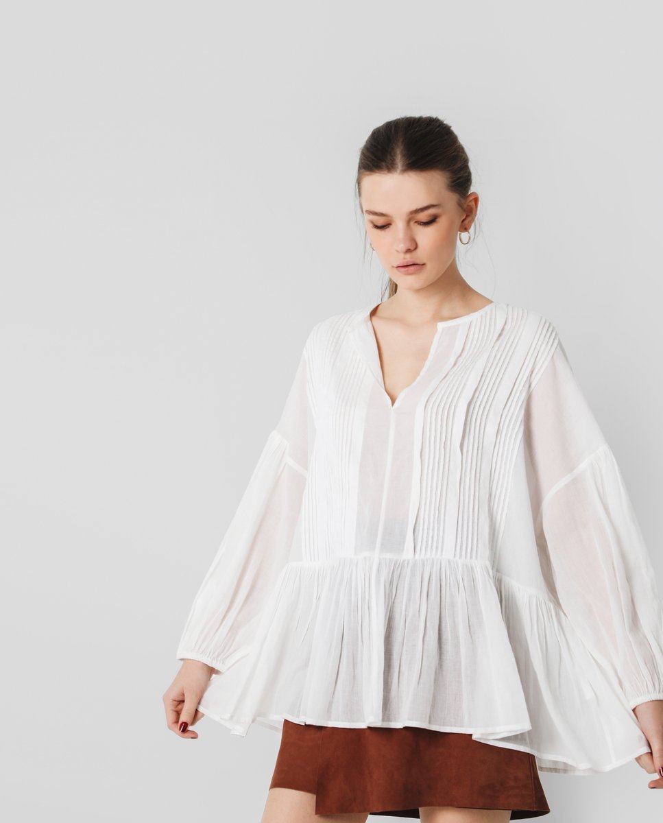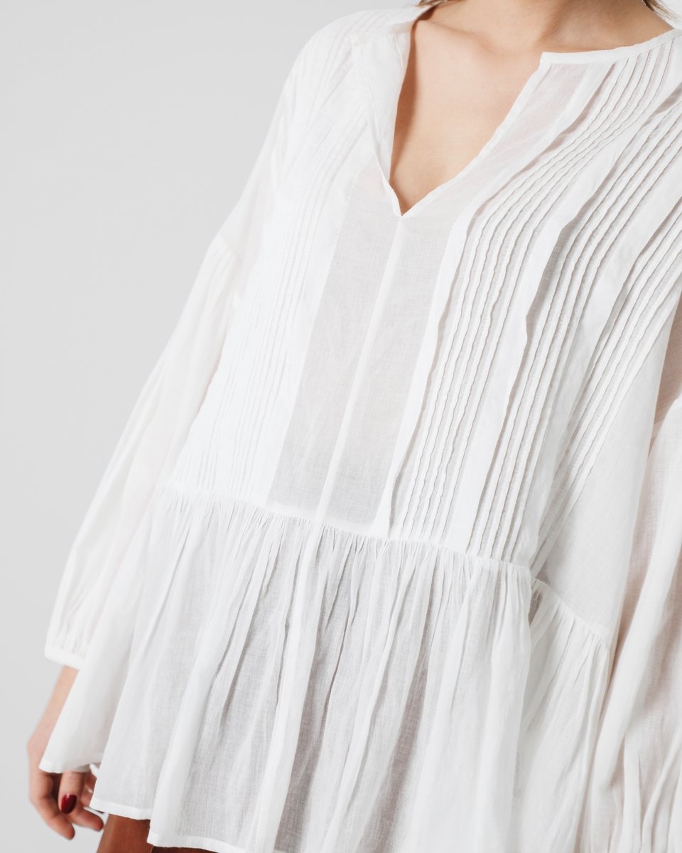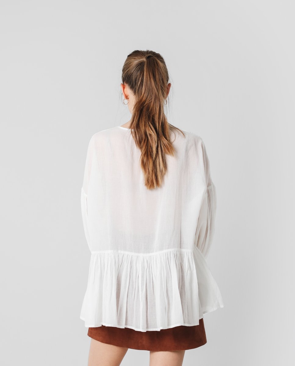 Camisa confeccionada en tejido 100% algodón. Corte con vuelo y cuello redondo con escote de pico. Manga larga abullonada terminada en elástico.Presenta como detalle el volante grande en el bajo y los pliegues en la parte delantera.