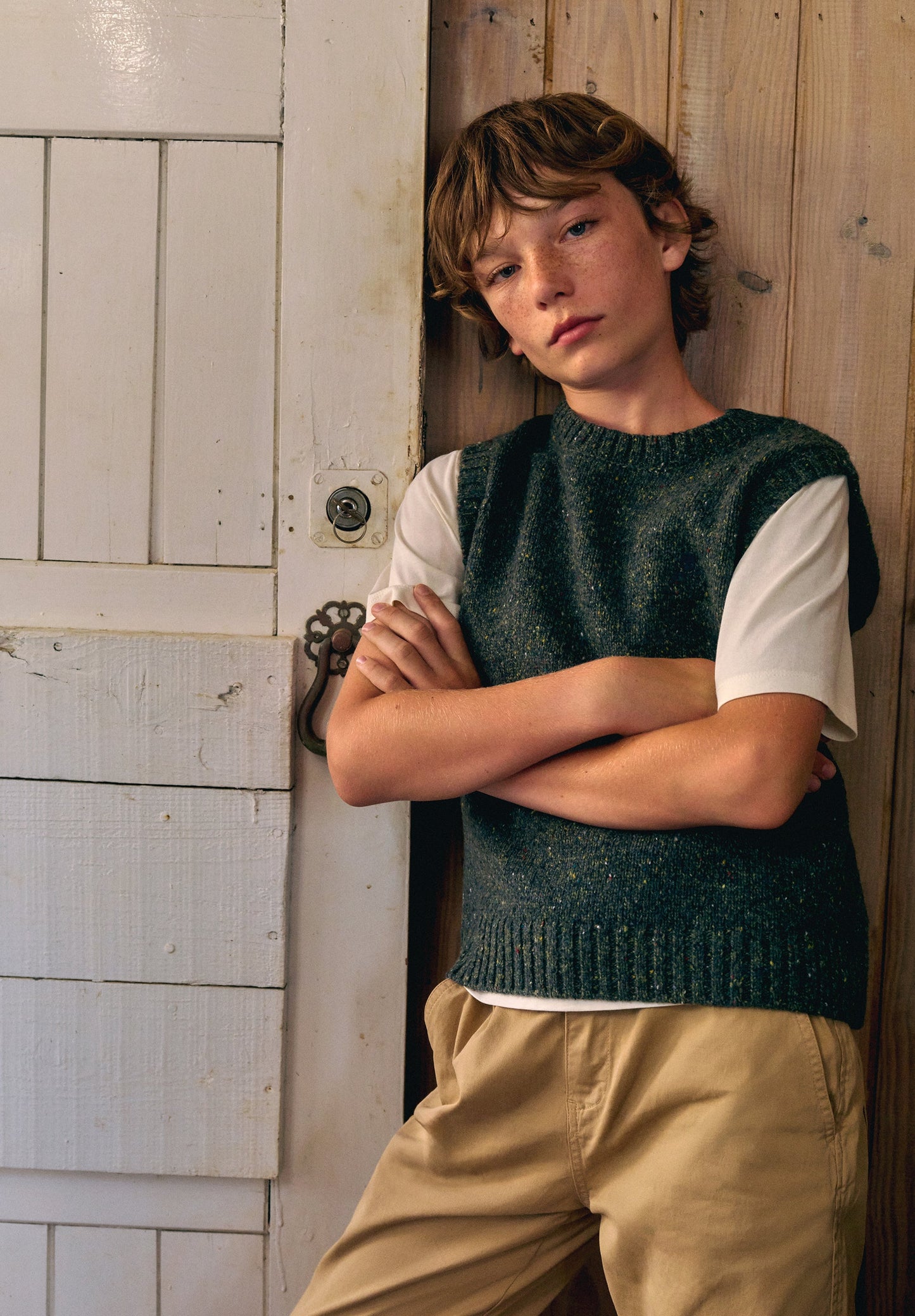 Chaleco de punto confeccionado en tejido reciclados. Regular fit, cuello redondo y manga en sisa.