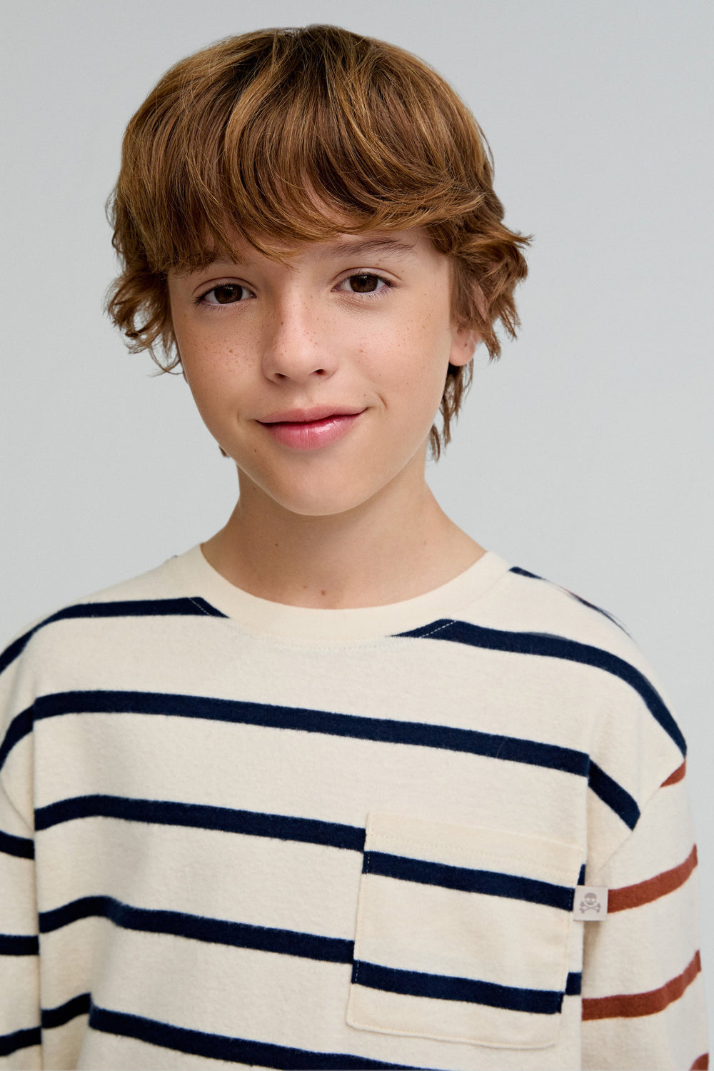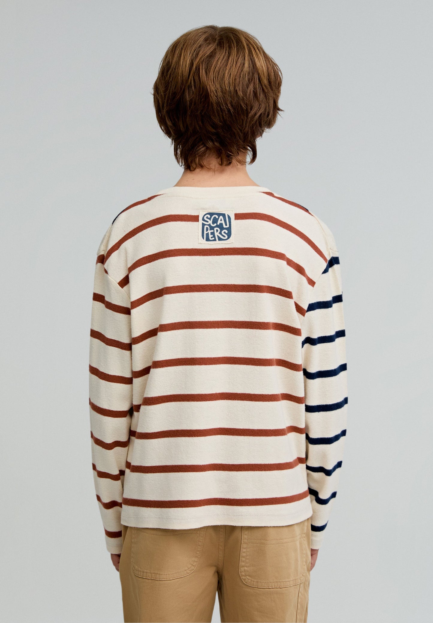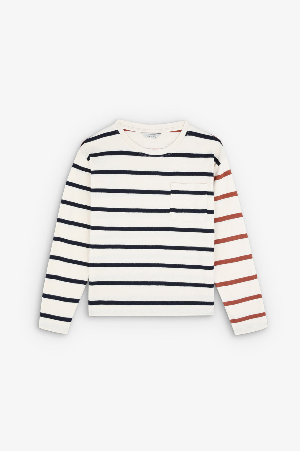 Camiseta de rayas confeccionada en 100% algodón BCI. Regular fit, cuello redondo y manga larga.
