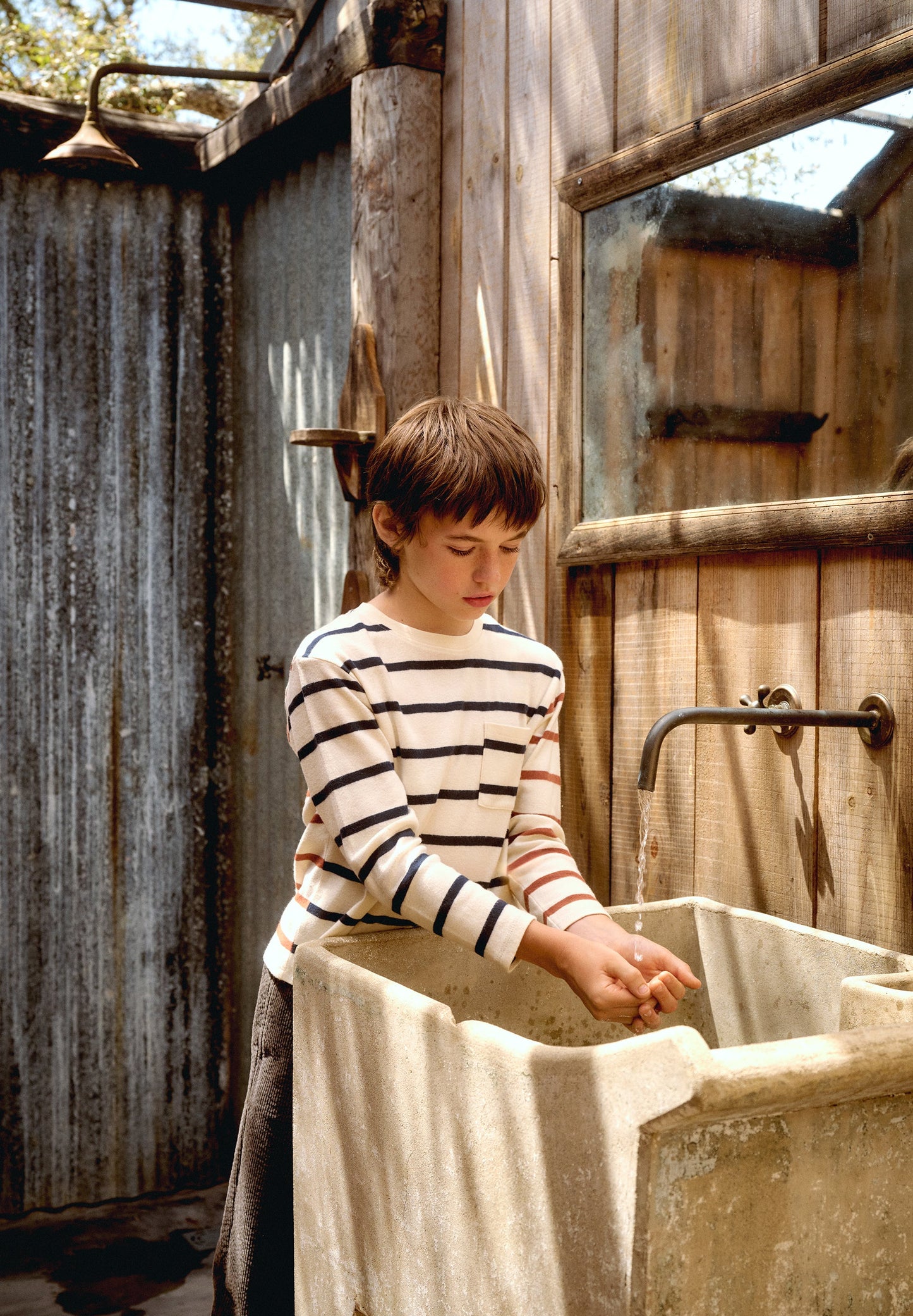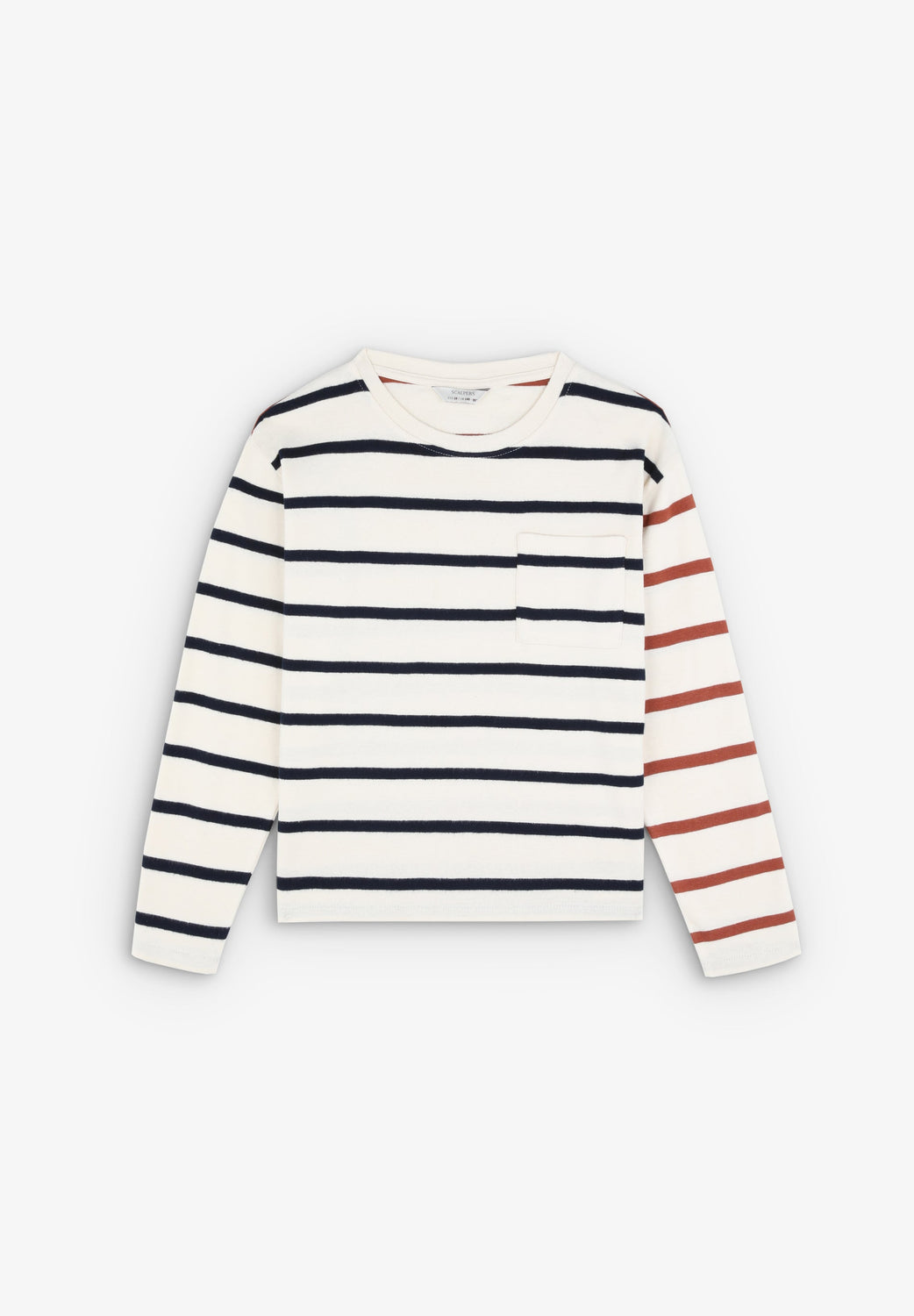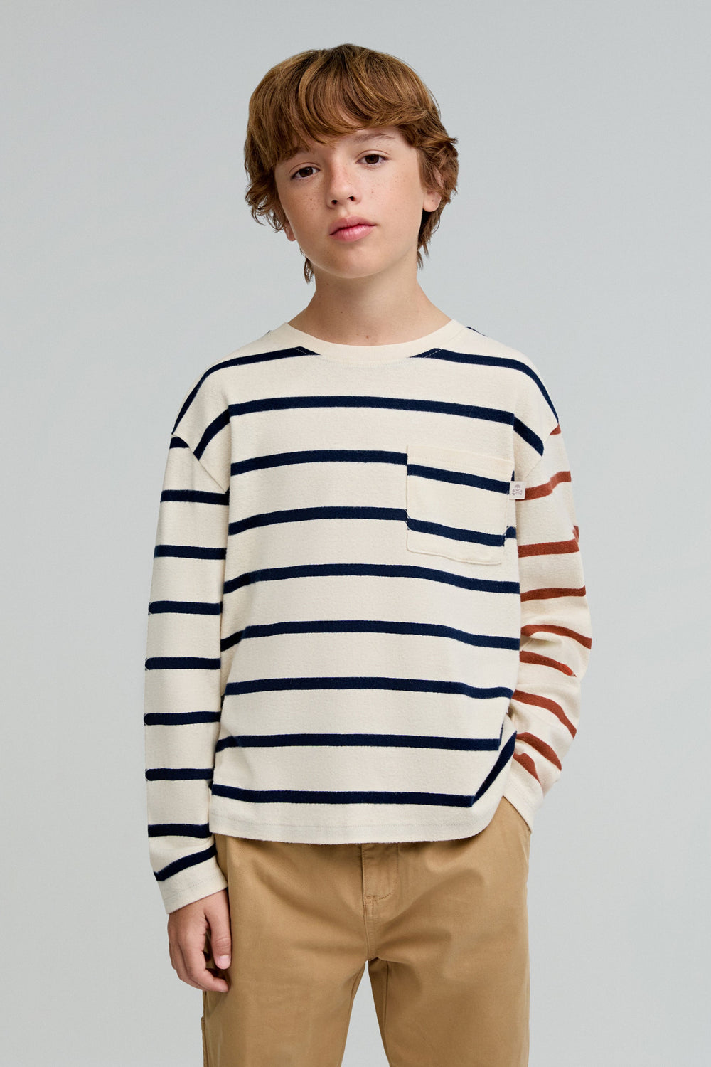 Camiseta de rayas confeccionada en 100% algodón BCI. Regular fit, cuello redondo y manga larga.