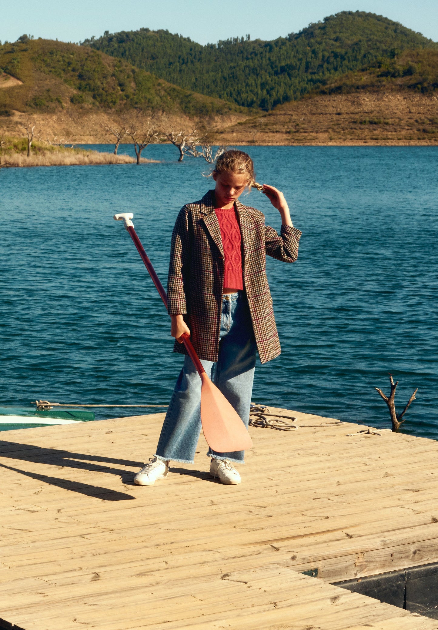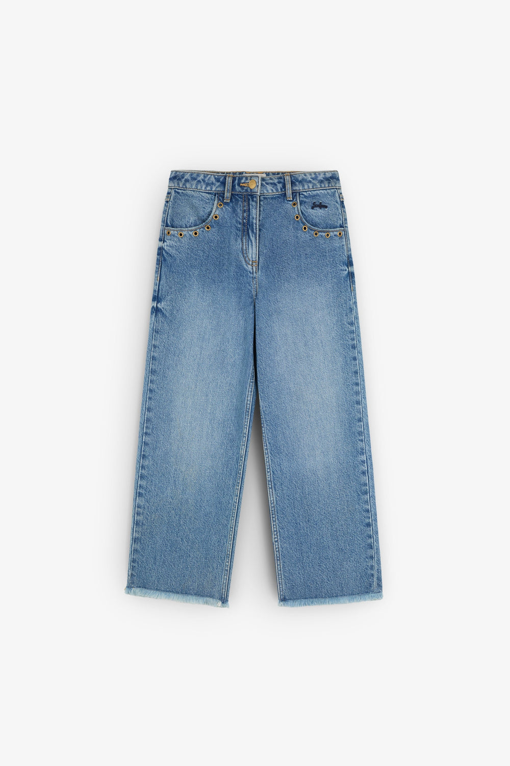 Jeans confeccionados en 100% algodón BCI. Corte culotte con tiro alto, cierre con botón y cremallera y bolsillos laterales y traseros.