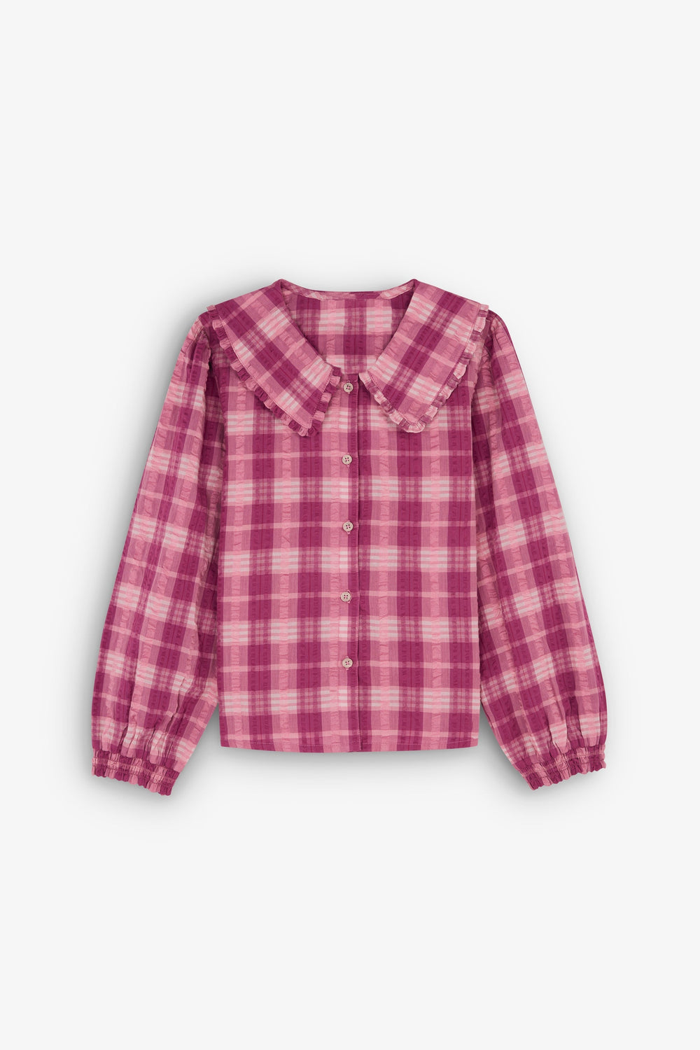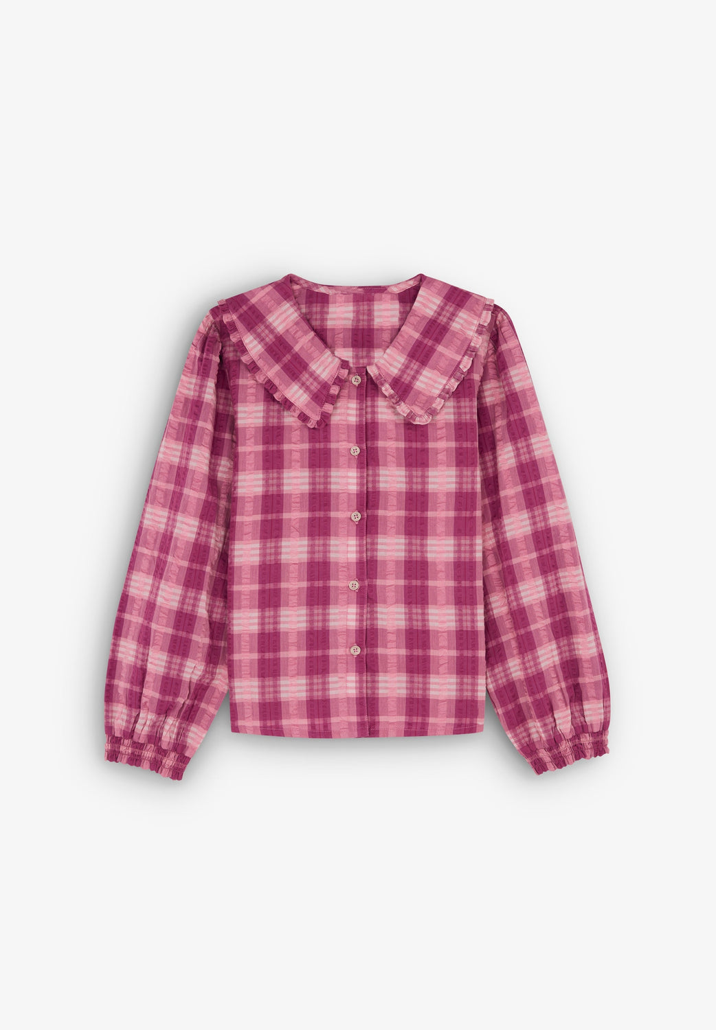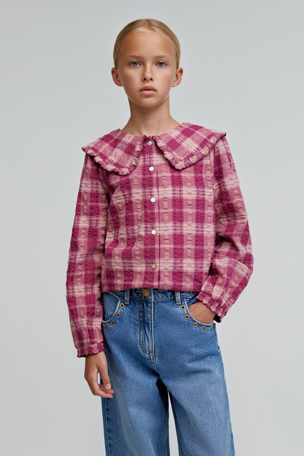 Blusa de cuadros vichy confeccionada en 100% algodón BCI. Regular fit. Cierre con botones. Cuello bobo con detalle de volantes. Manga larga acaba en puño con con frunces.