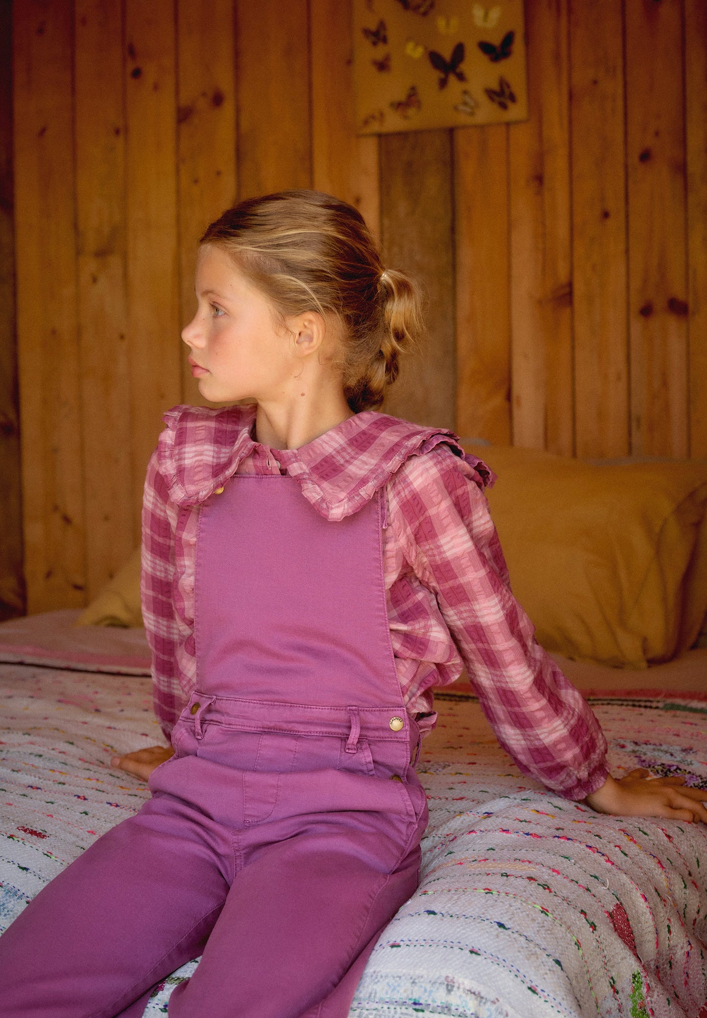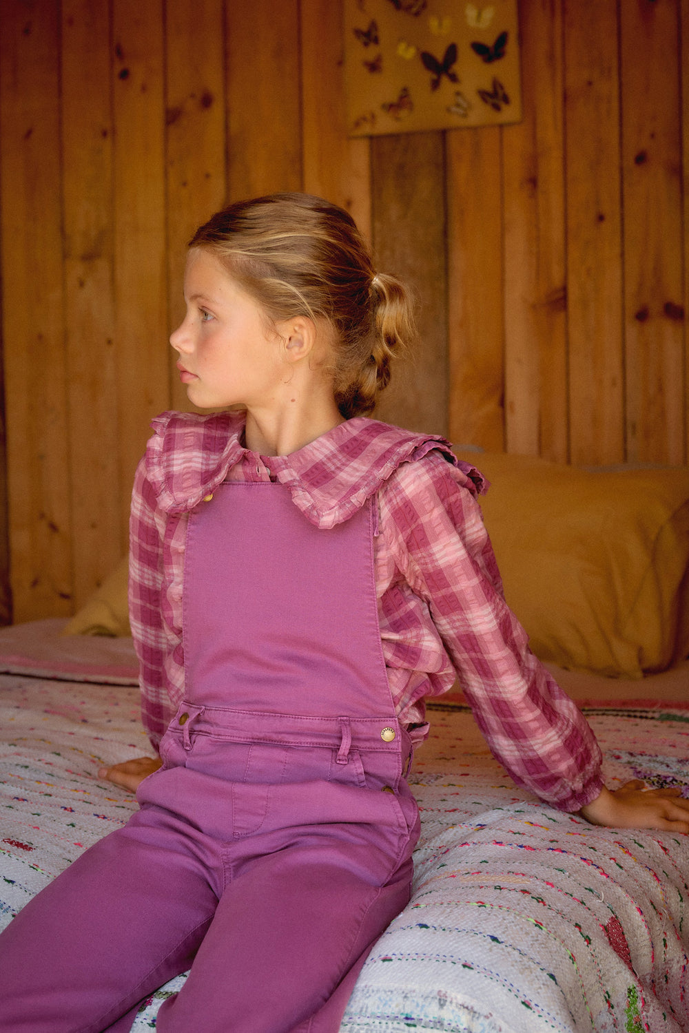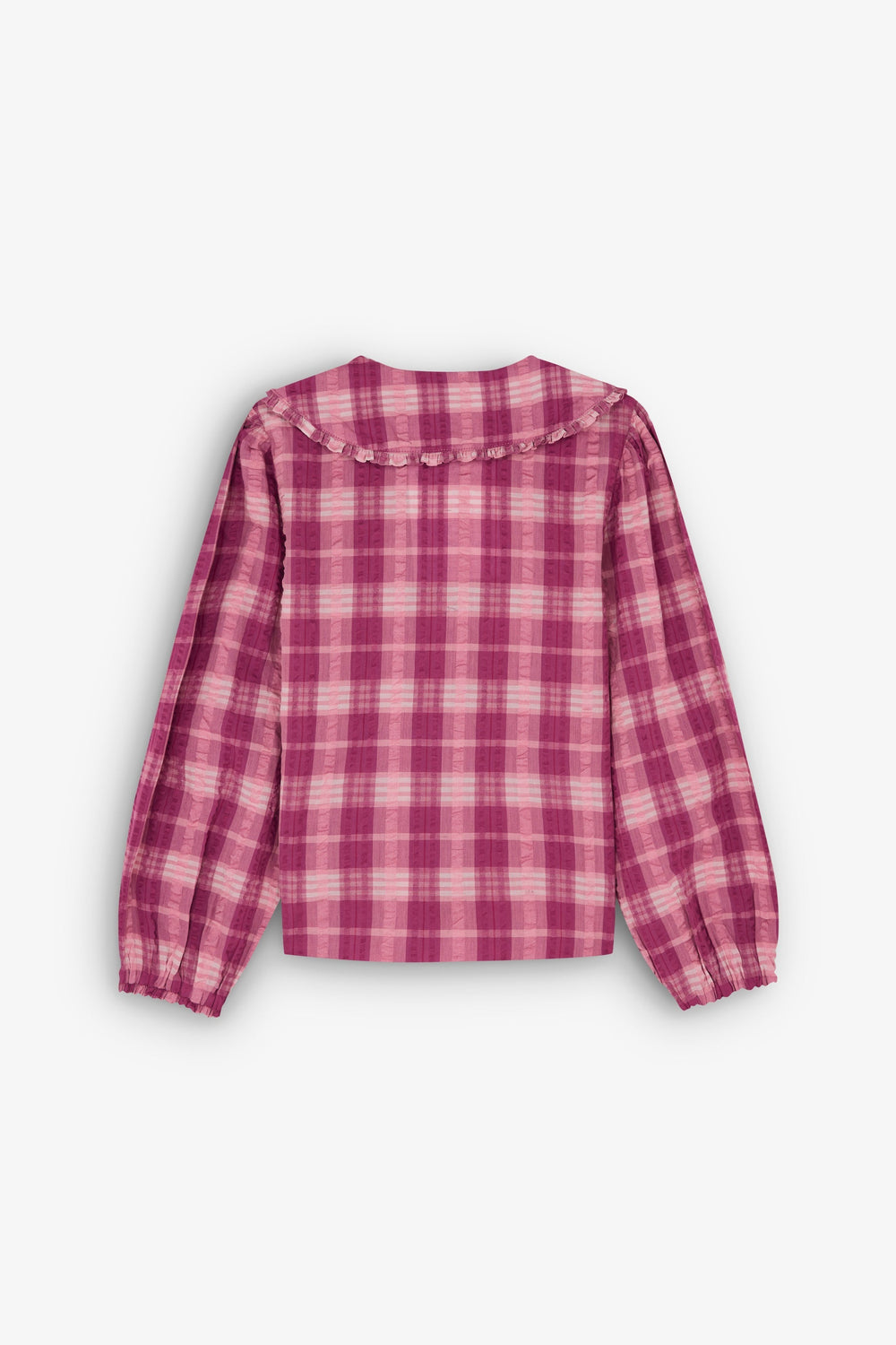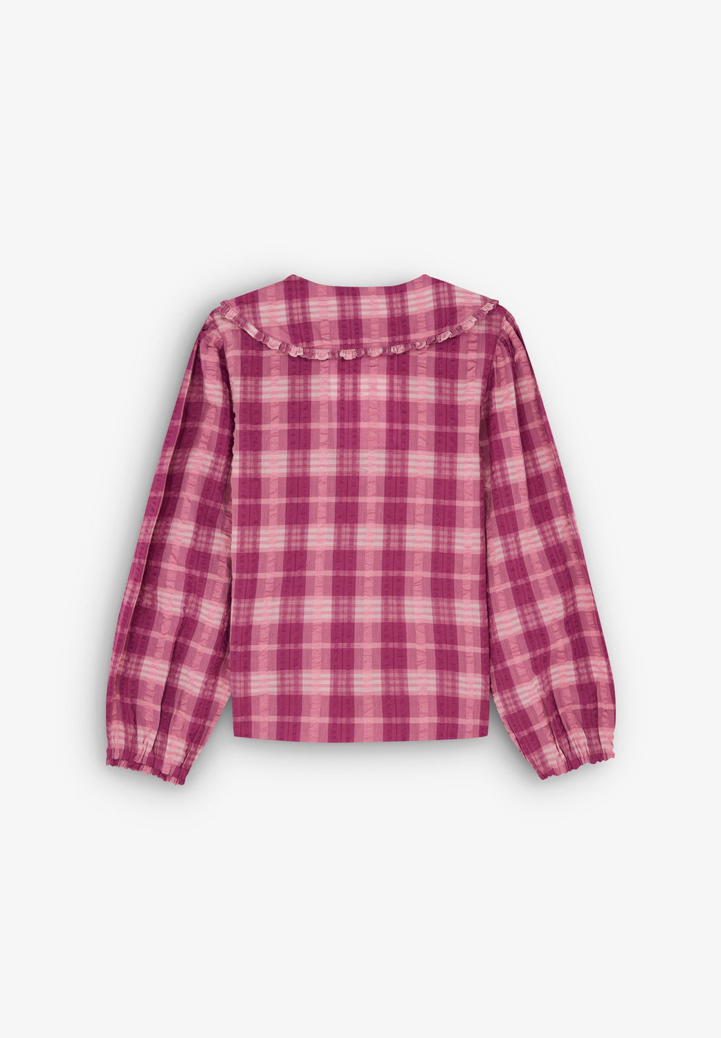 Blusa de cuadros vichy confeccionada en 100% algodón BCI. Regular fit. Cierre con botones. Cuello bobo con detalle de volantes. Manga larga acaba en puño con con frunces.