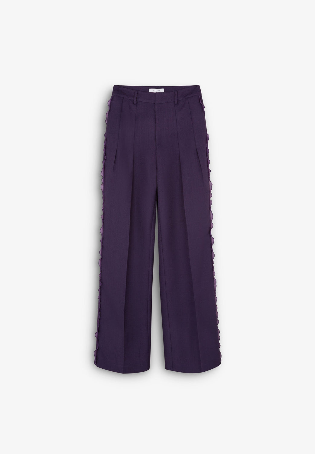 Pantalón con detalle de organza. Full length con tiro alto y pinzas, cierre con cremallera y botón. Bolsillos y trabillas en cintura.