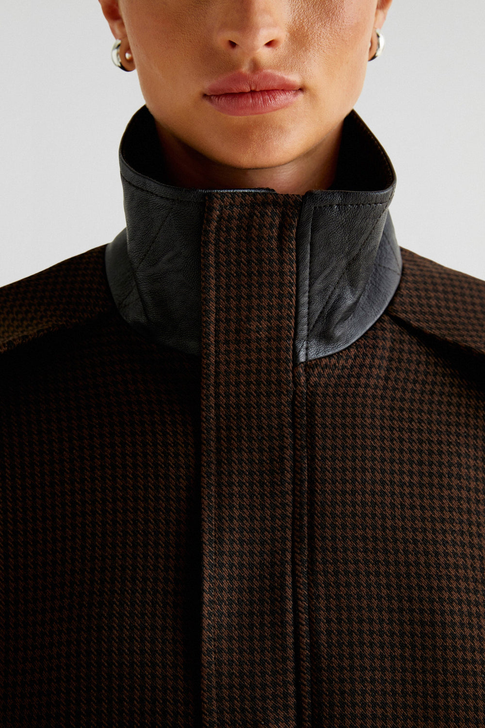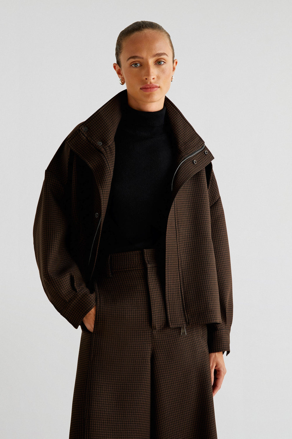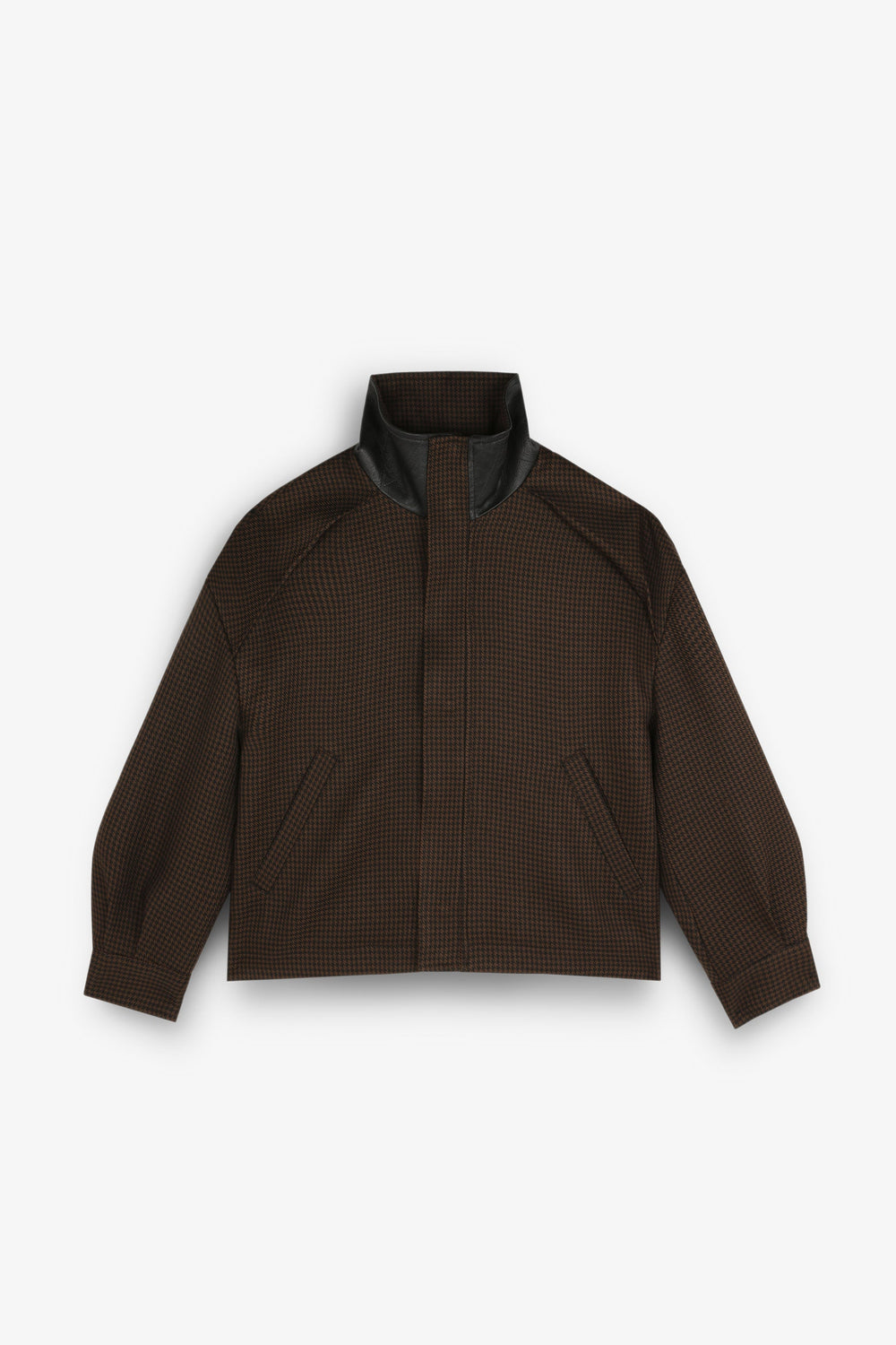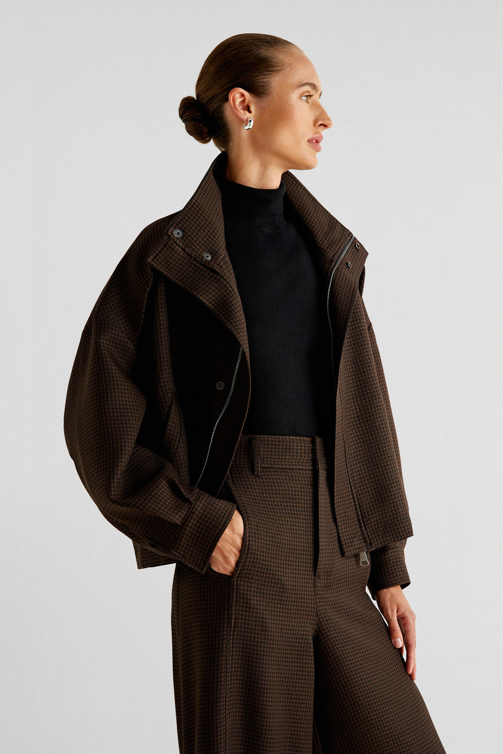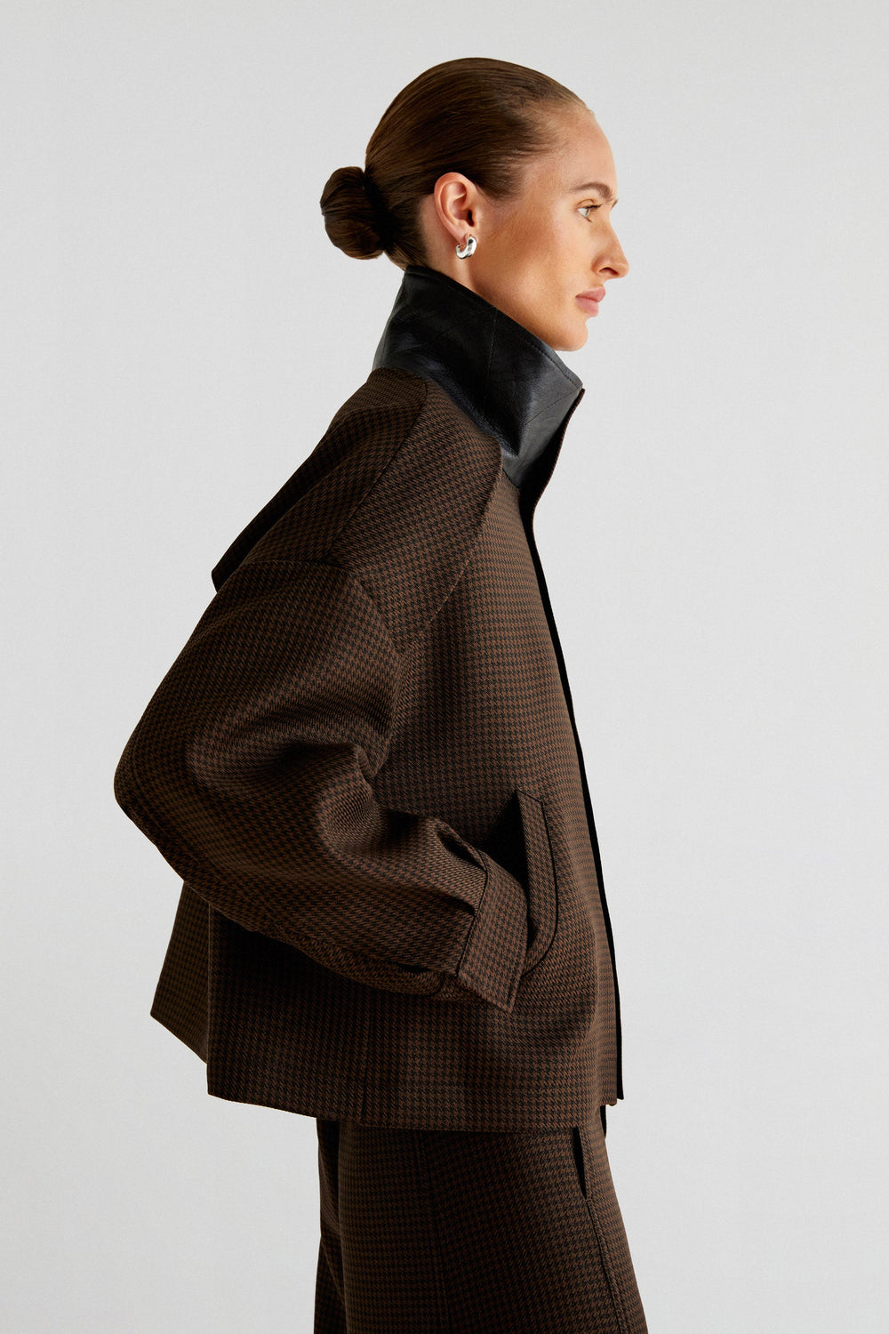 Chaqueta tipo bomber confeccionada en tejido pata de gallo. Ligeramente oversize, cierre con cremallera y cuello subido con detalle en piel. Manga larga ranglan terminada en puño con botón y bolsillos laterales.