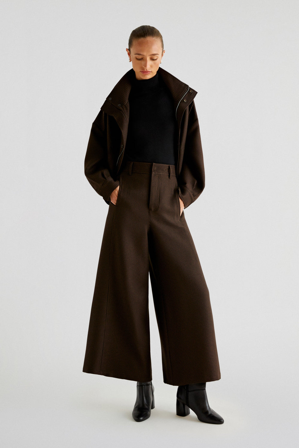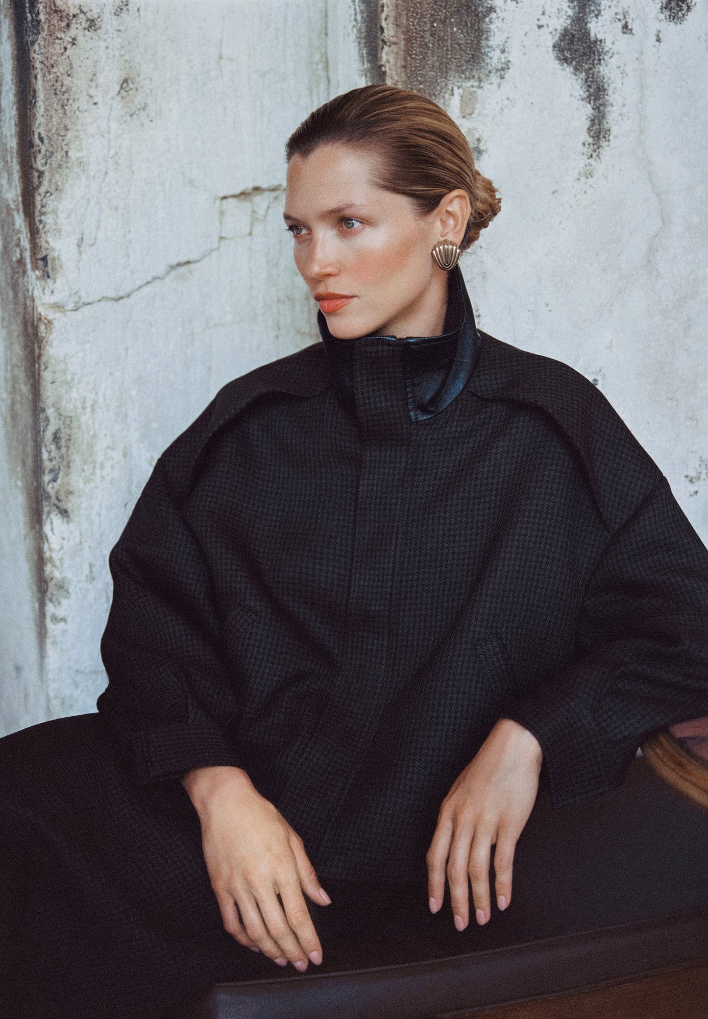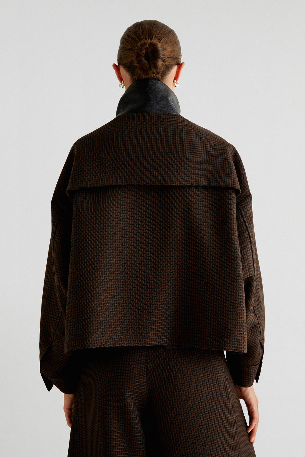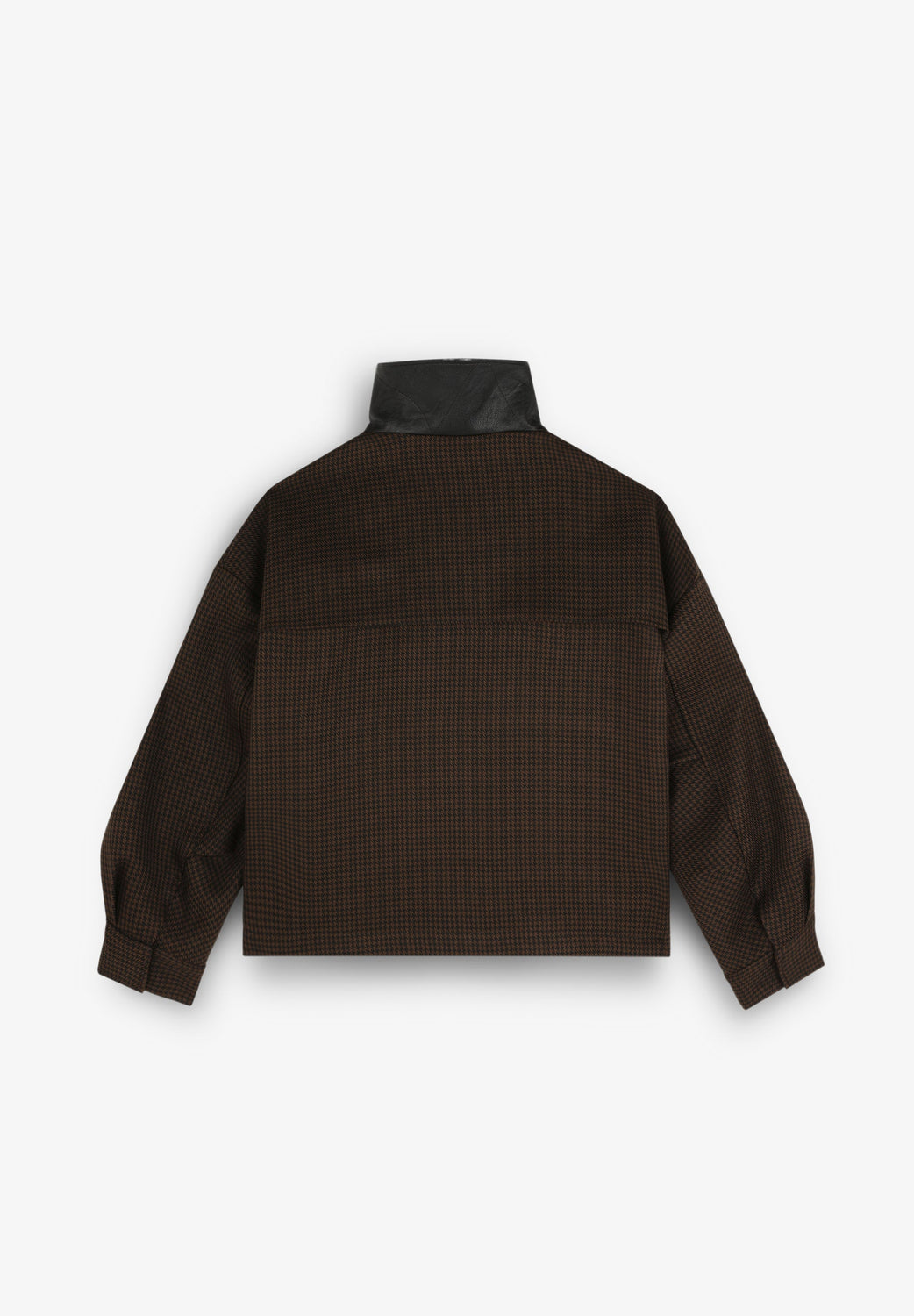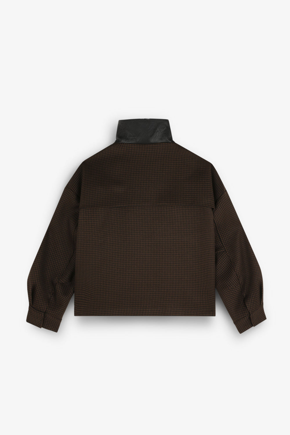Chaqueta tipo bomber confeccionada en tejido pata de gallo. Ligeramente oversize, cierre con cremallera y cuello subido con detalle en piel. Manga larga ranglan terminada en puño con botón y bolsillos laterales.