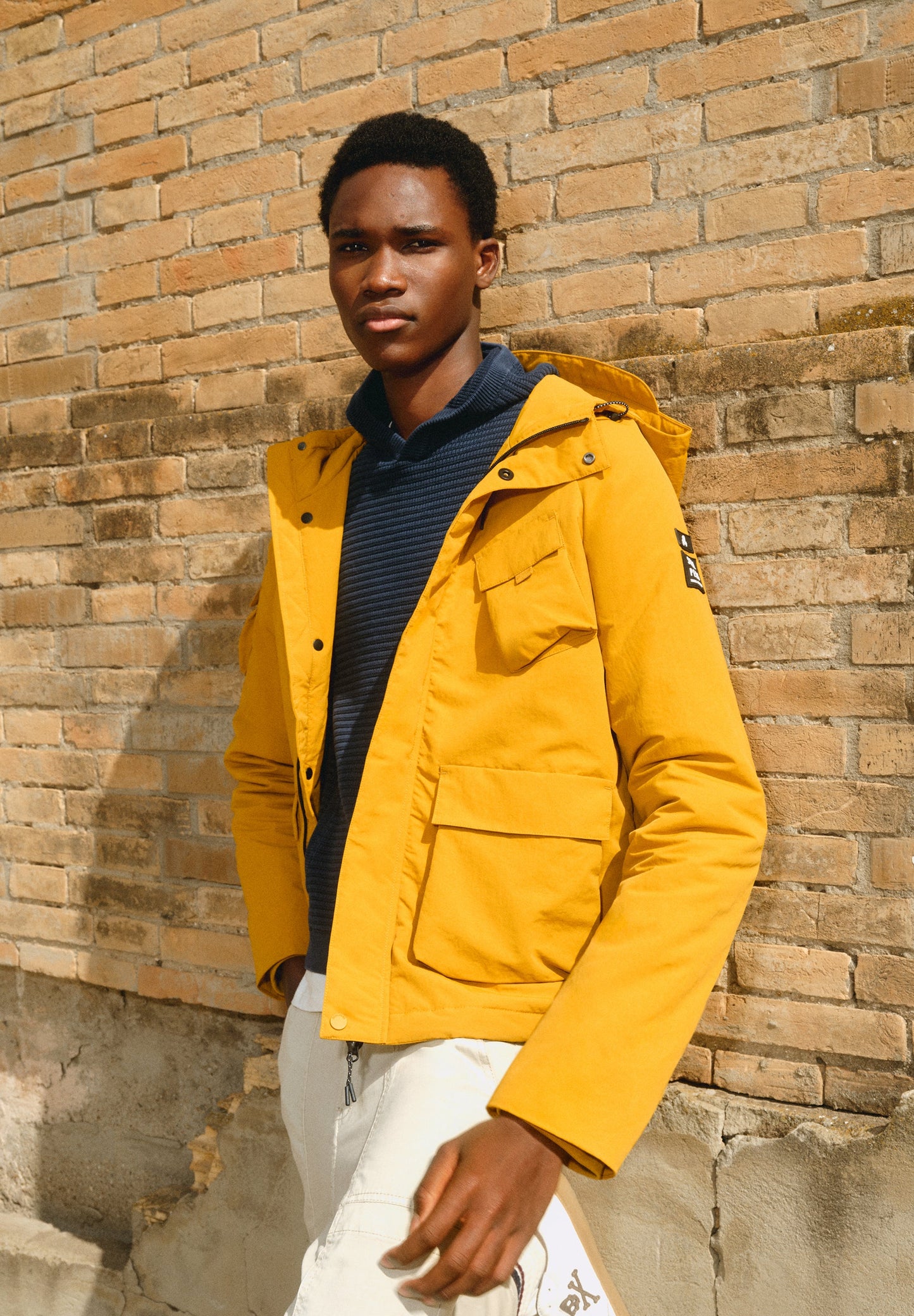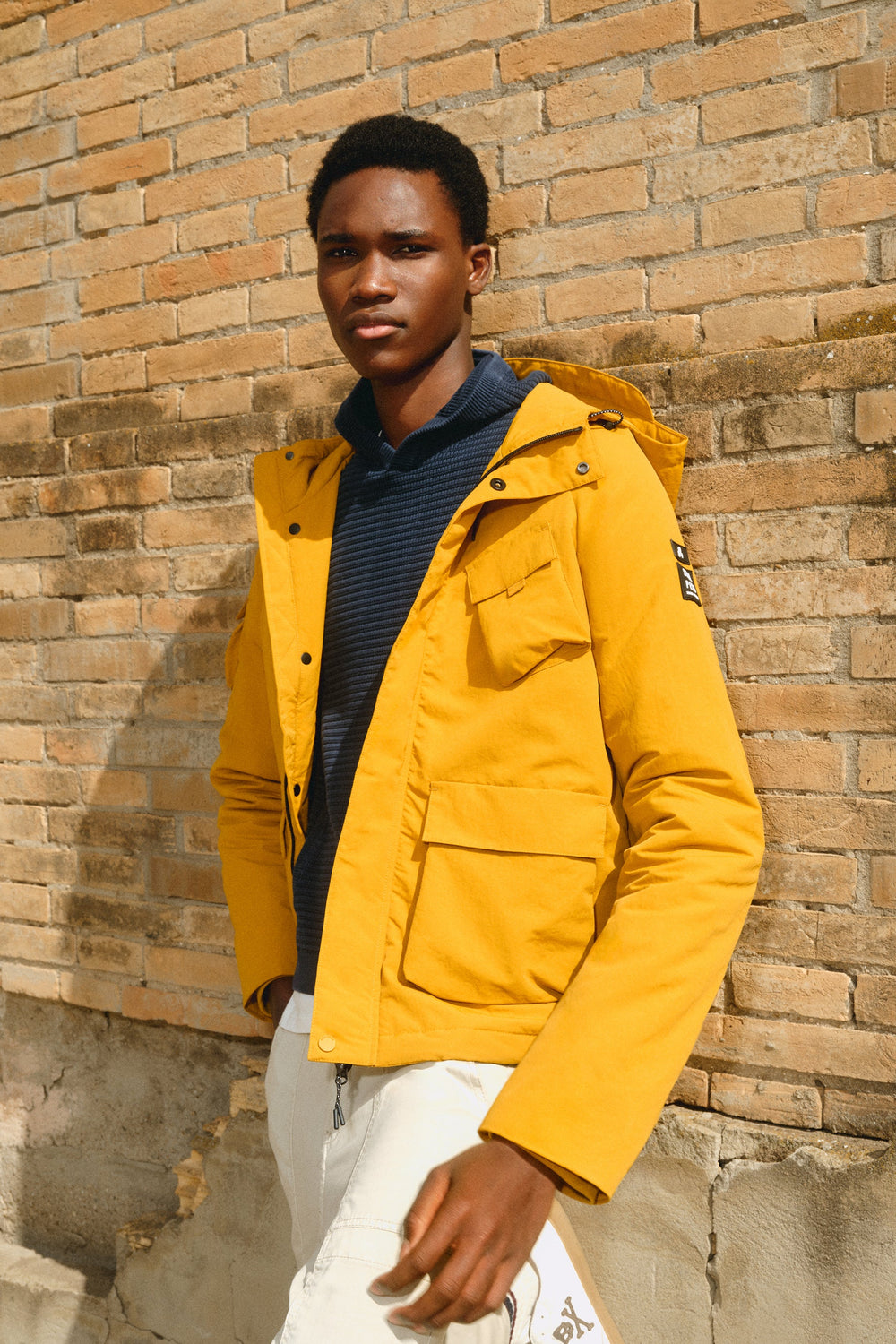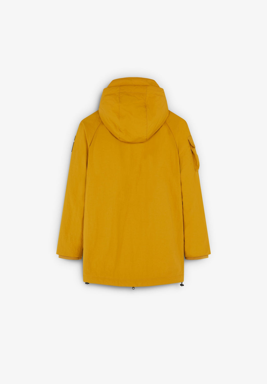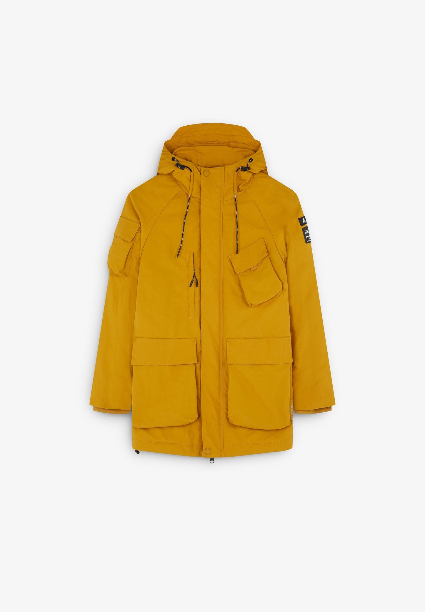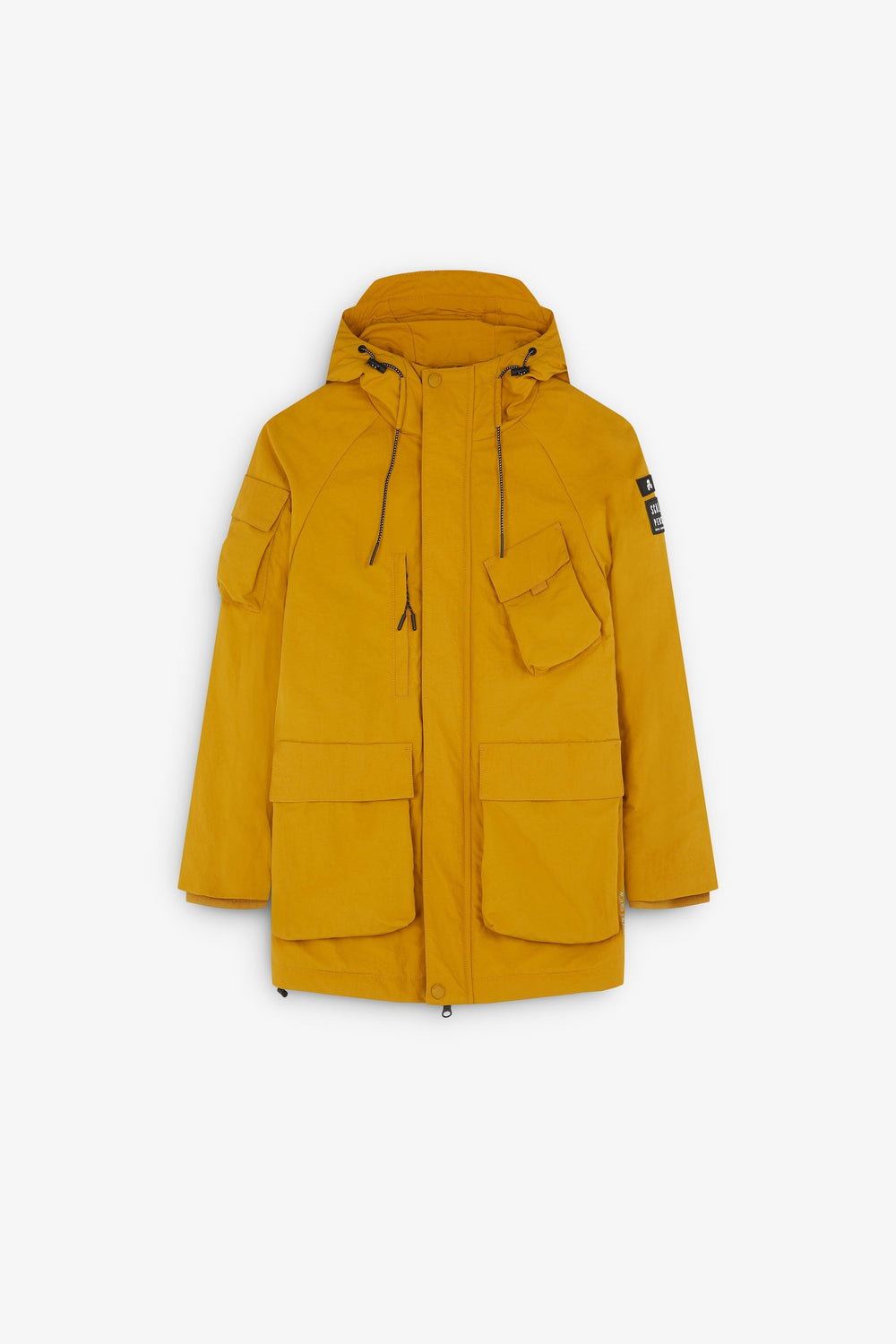 Parka larga confeccionada en 100% nylon reciclado. Regular fit, cuello con capucha ajustable y cierre con cremallera termosellada y tapeta con snaps. Manga larga terminada en puño con ribs y bolsillos con imán. Forro tipo polar en interior.