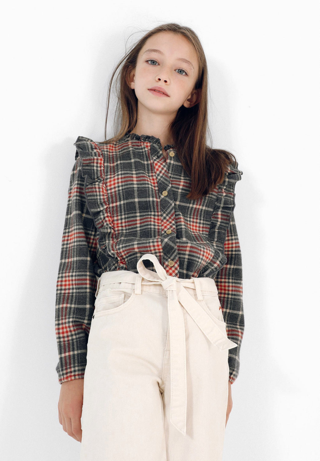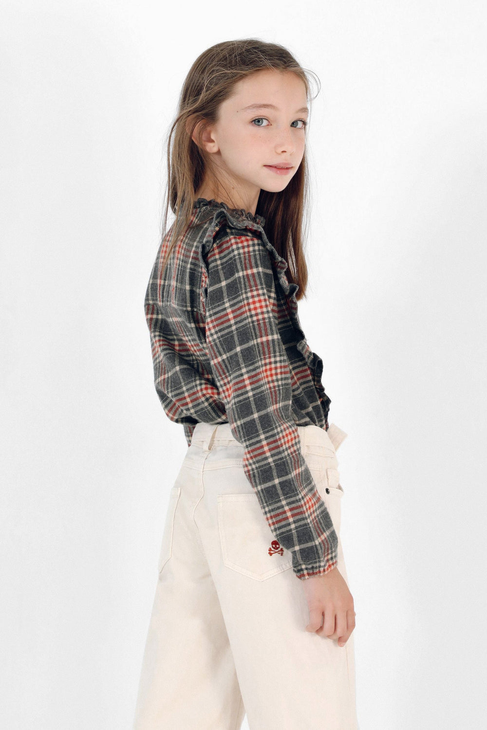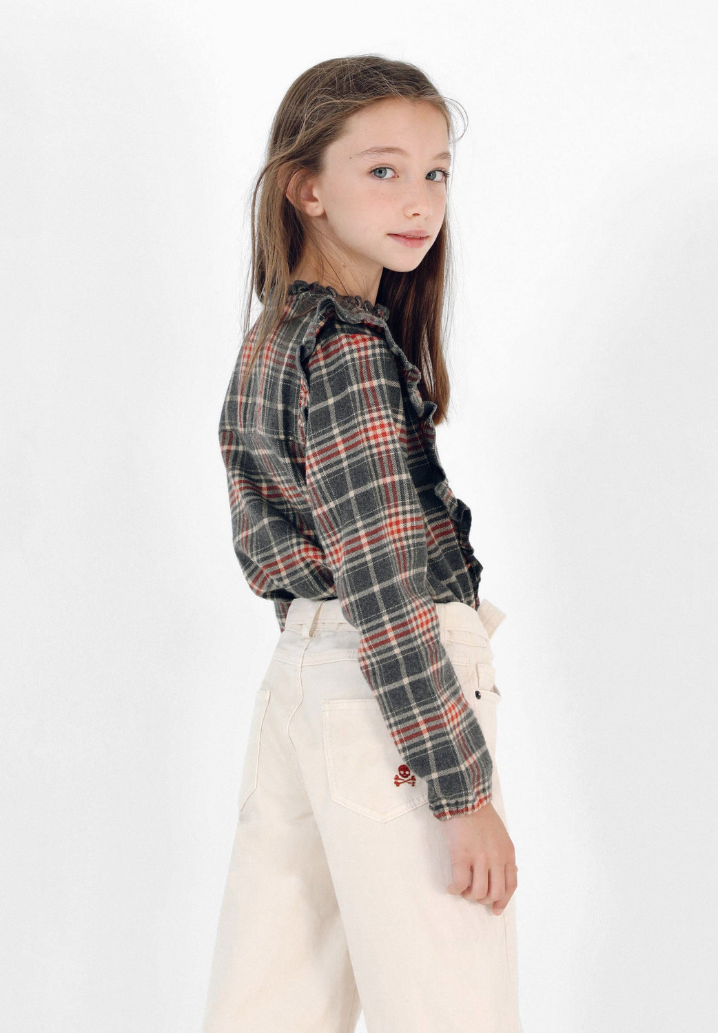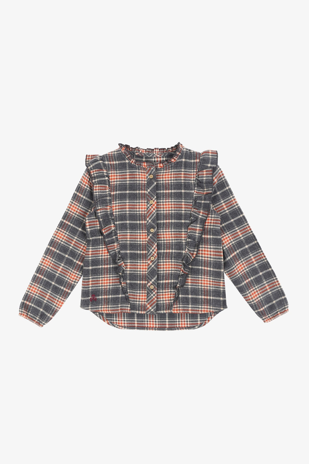 Blusa de cuadros confeccionada en tejido 100% algodón. Corte Regular Fit, cuello con volante y cierre con botones en tapeta. Manga larga terminada en elástico y detalle de volantes a los lados.