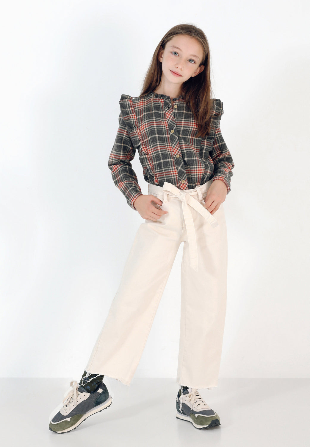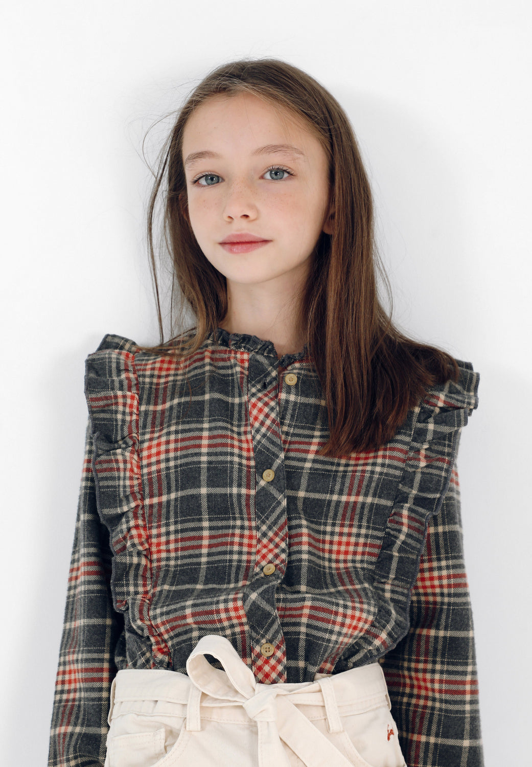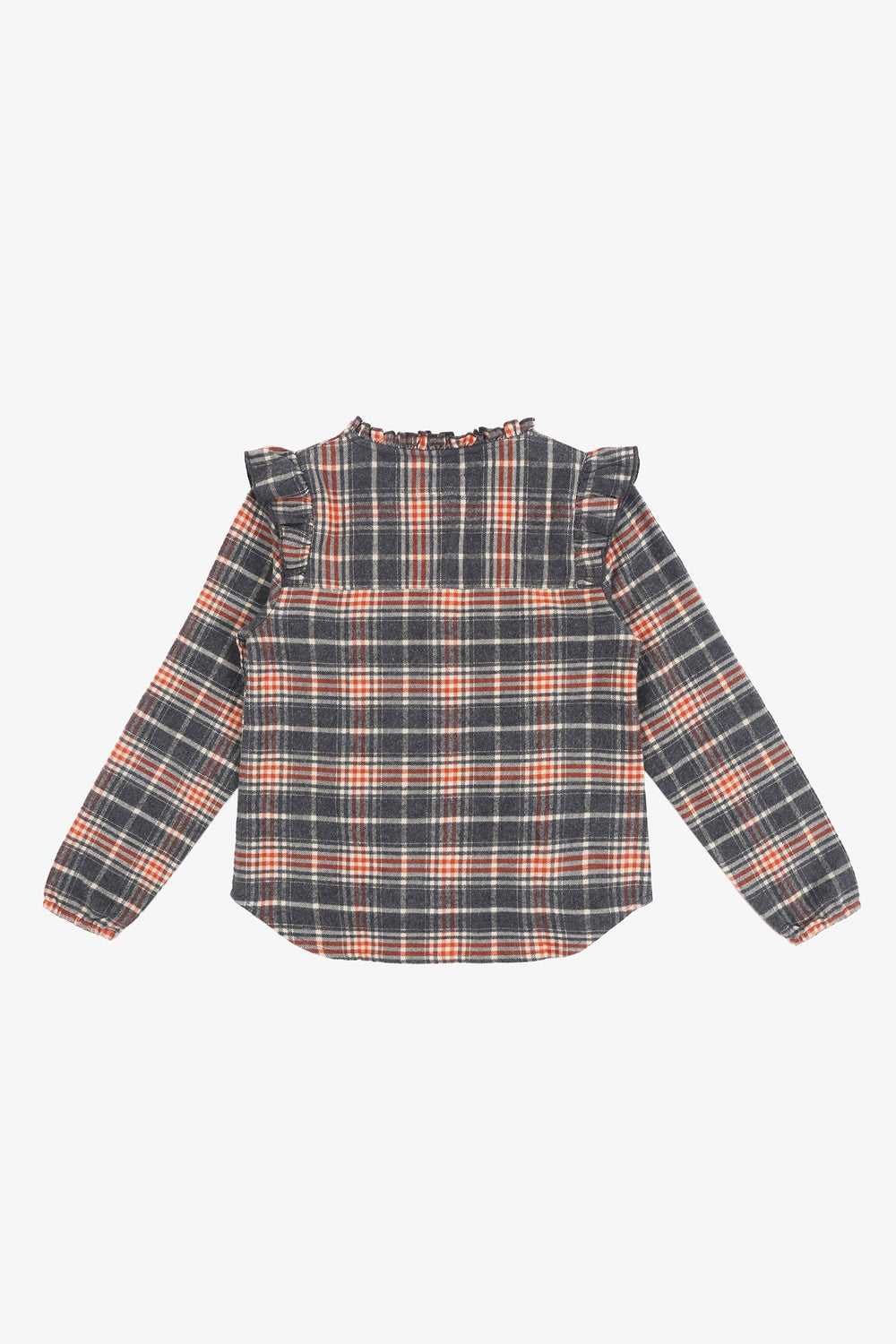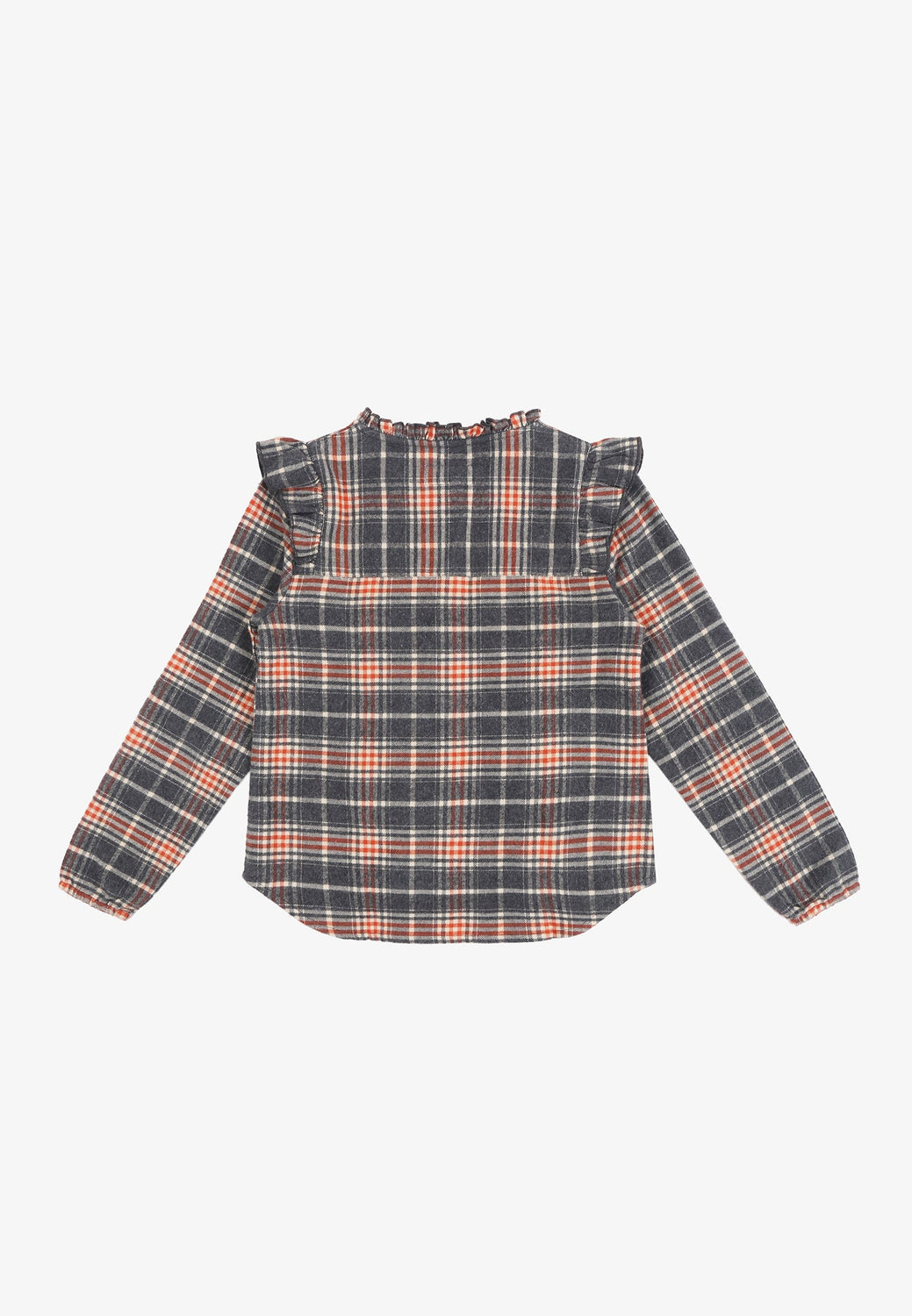Blusa de cuadros confeccionada en tejido 100% algodón. Corte Regular Fit, cuello con volante y cierre con botones en tapeta. Manga larga terminada en elástico y detalle de volantes a los lados.