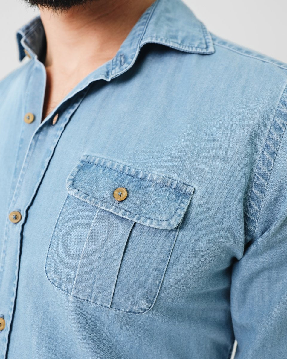 Camisa confeccionada en tejido denim. Corte Regular Fit, cuello konika con ballena y cierre con botones haciendo contraste. Tiene un bolsillo de plastrón con tapeta a la altura del pecho y manga larga terminada en puño simple. Como detalle tiene la etiqueta bordada con botón. Disponible en dos colores.