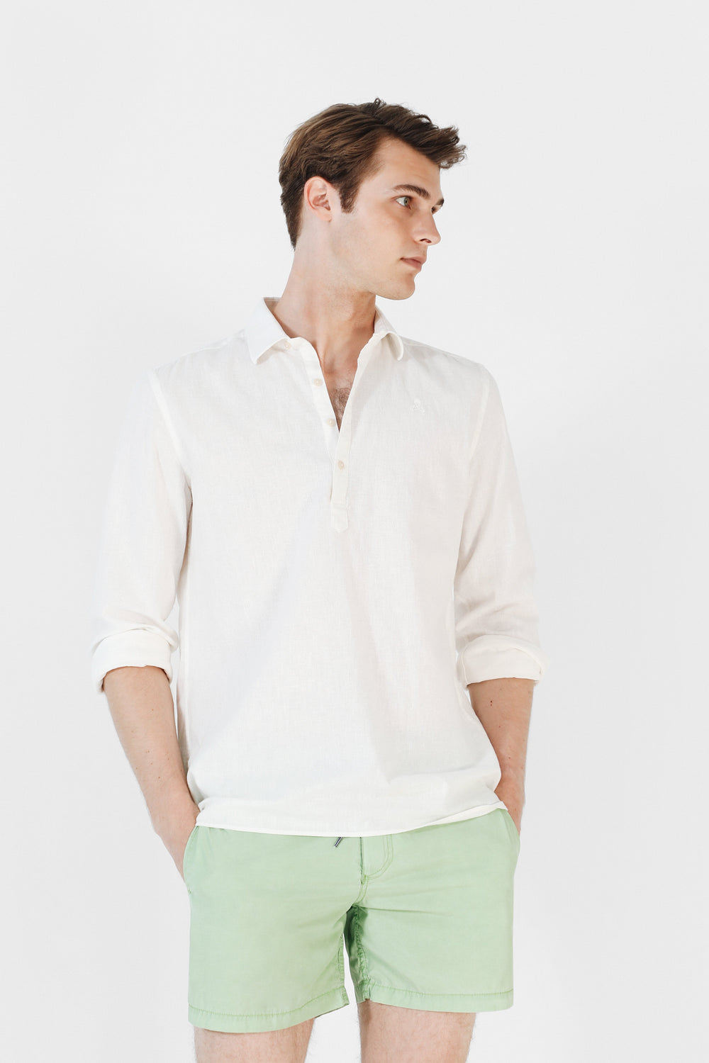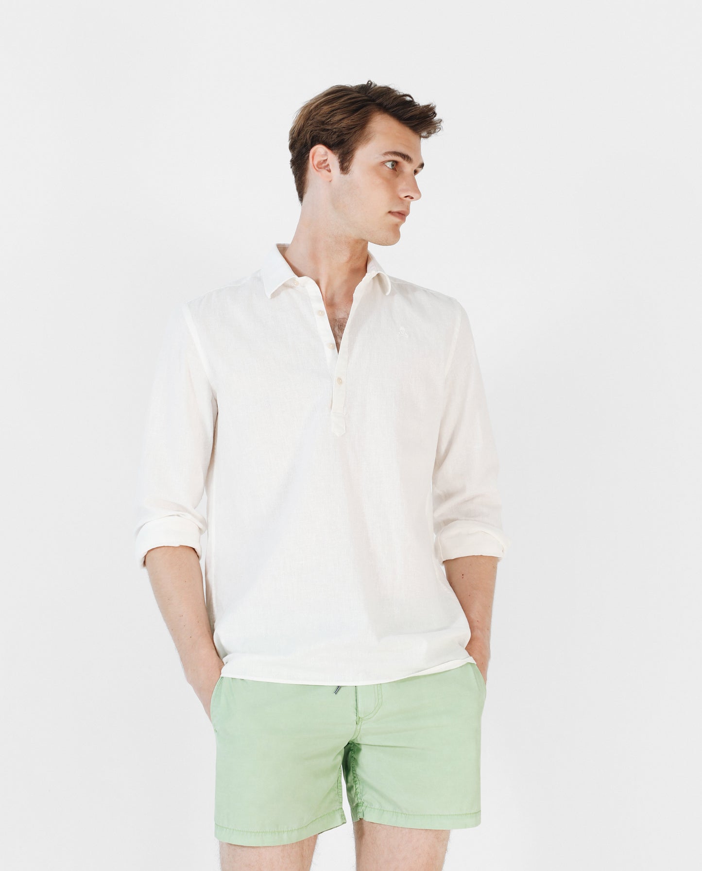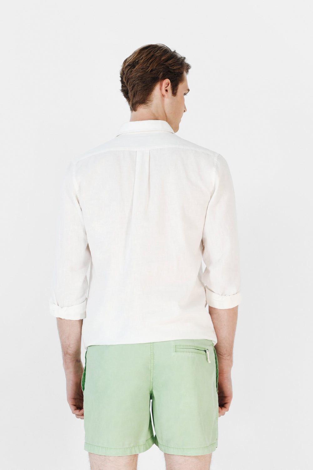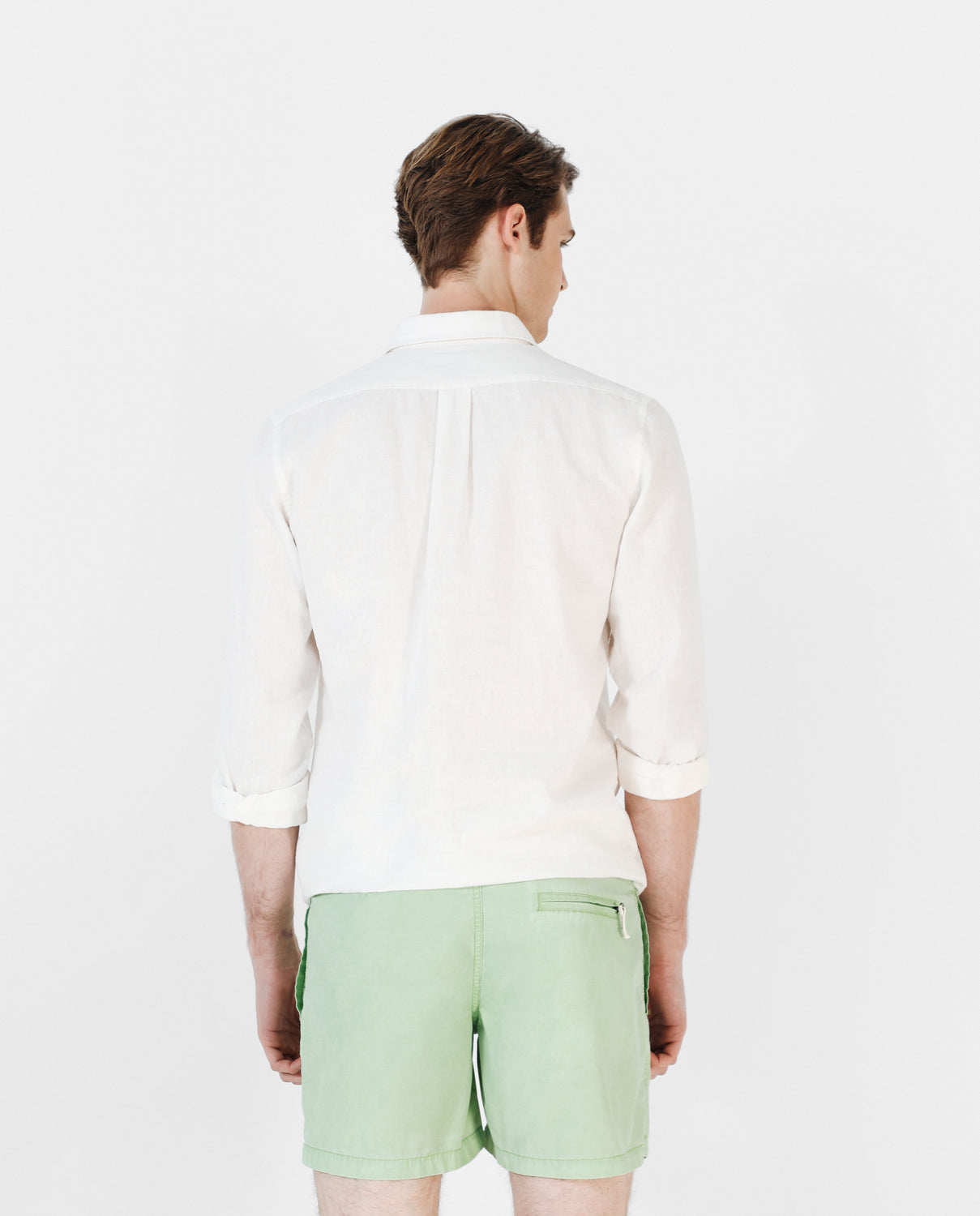 Bañador confeccionado en tejido liso de efecto delavé. Corte surfero, cierre con cordón ajustable y dos bolsillos laterales. Como detalle tiene un parche bordado en el bajo izquierdo. Disponible en cuatro colores.