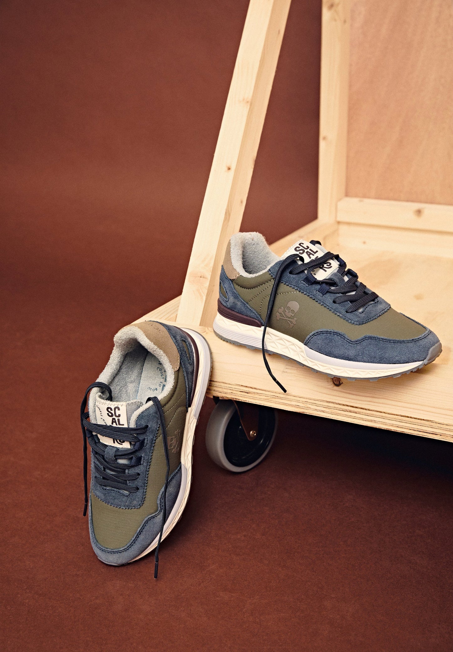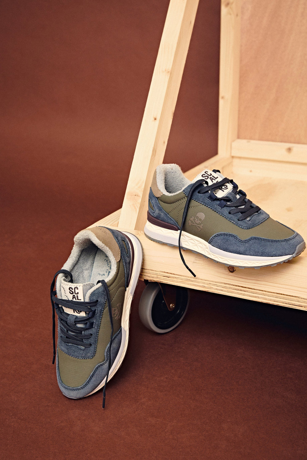 Sneakers confeccionadas en nylon con detalles en serraje. Cierre con cordones a tono, suela especial de goma dentada y calavera lateral.