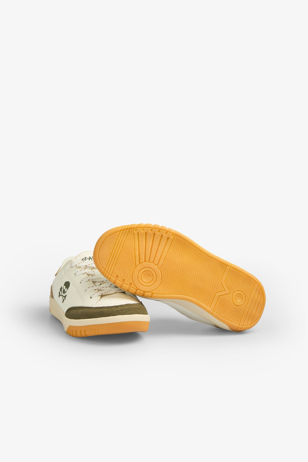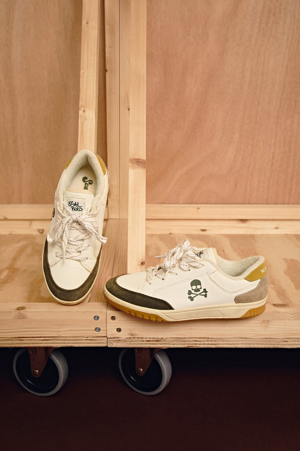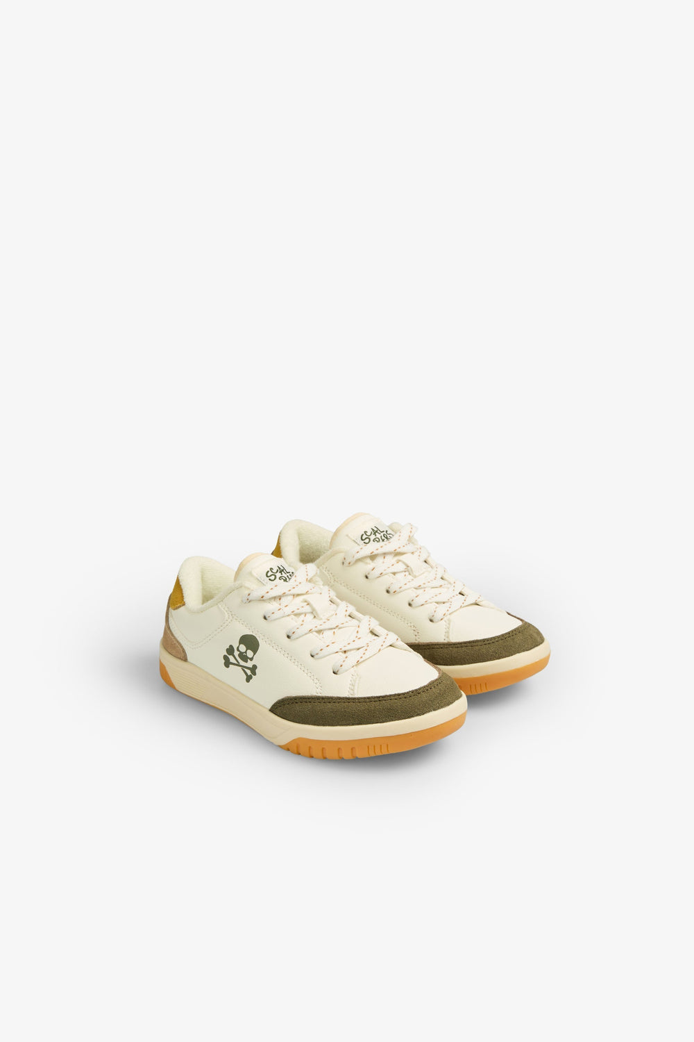 Sneakers confeccionadas en piel con detalles en serraje. Cierre con cordones a tono, suela de goma y talón a contraste. Calavera lateral.