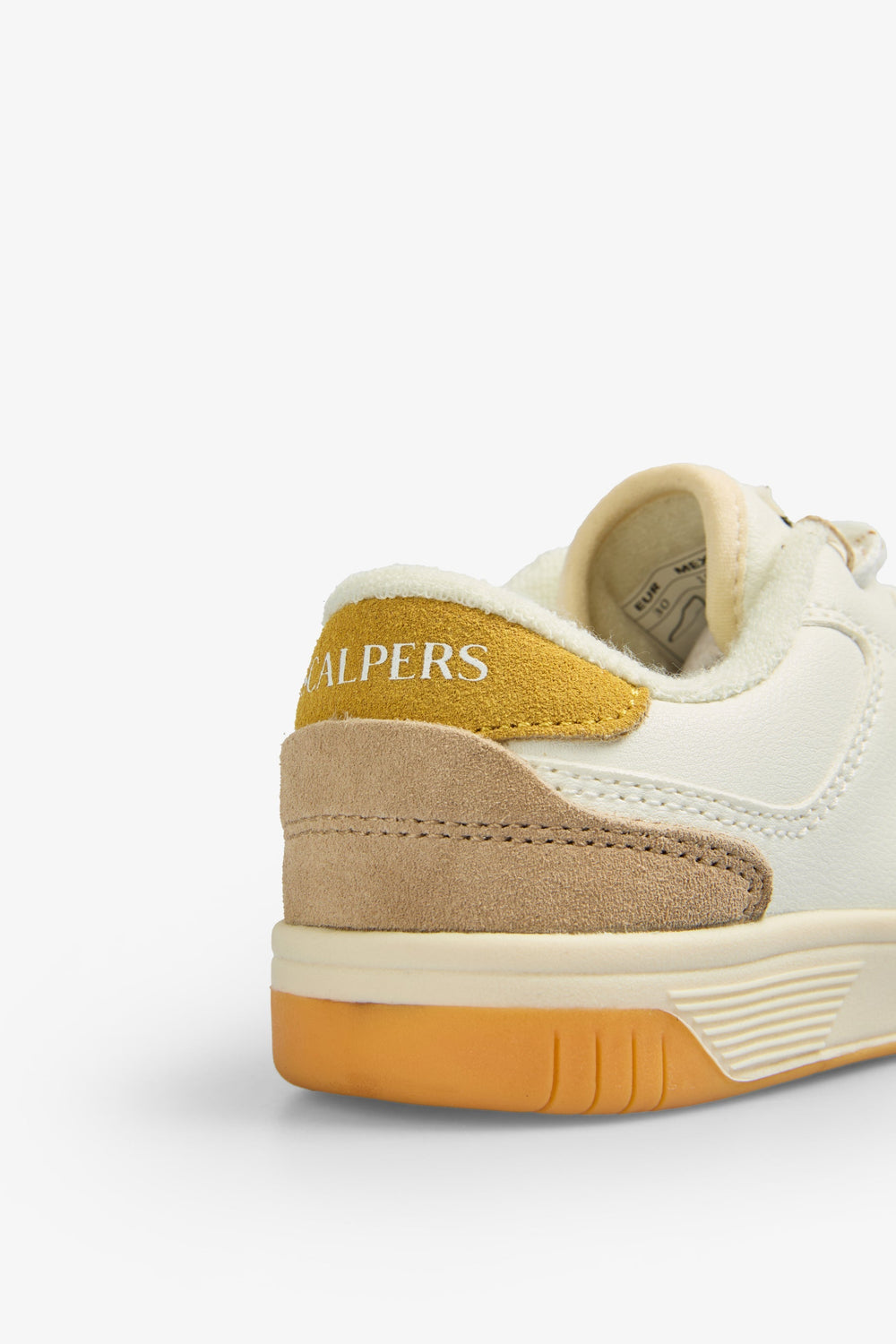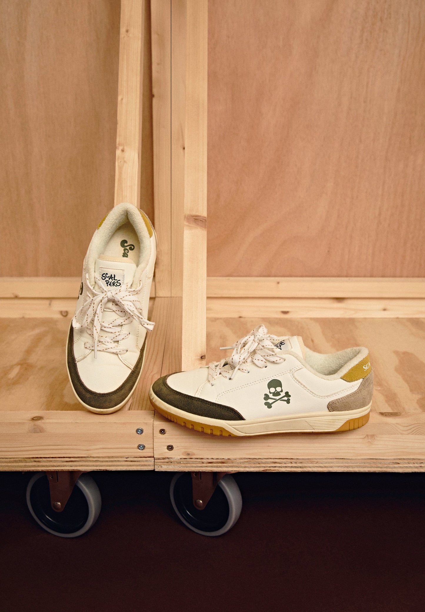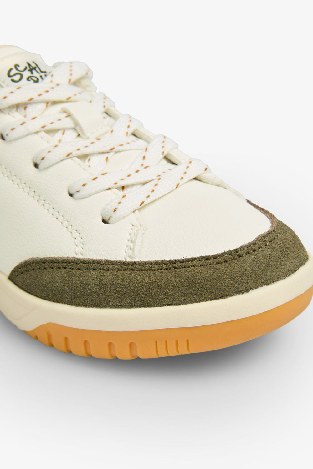 Sneakers confeccionadas en piel con detalles en serraje. Cierre con cordones a tono, suela de goma y talón a contraste. Calavera lateral.