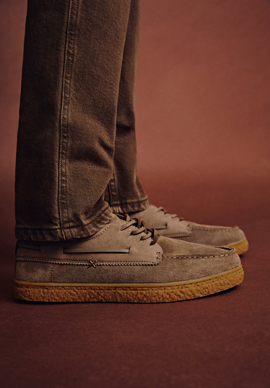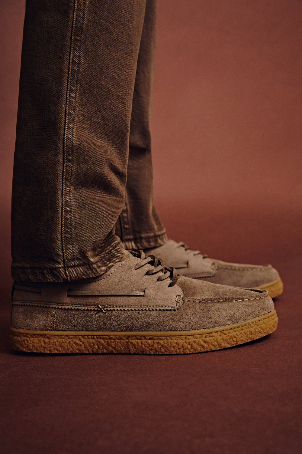 Zapatos tipo náuticos confeccionados en piel. Cierre con cordones a tono, suela de goma y detalles de costuras marcadas.