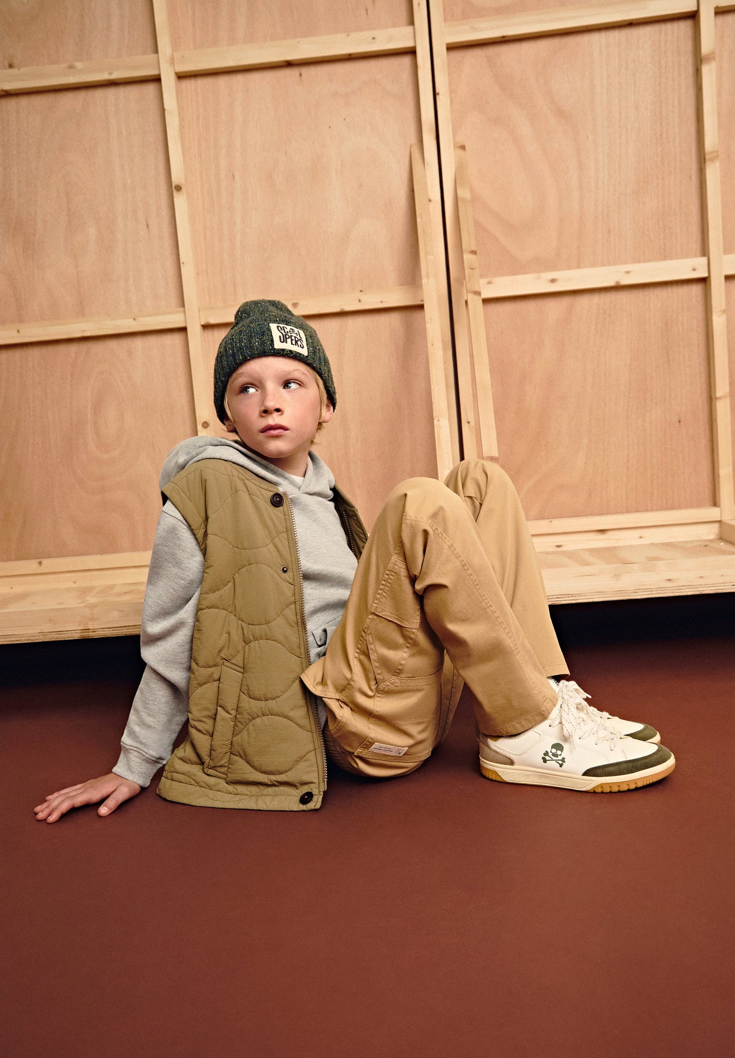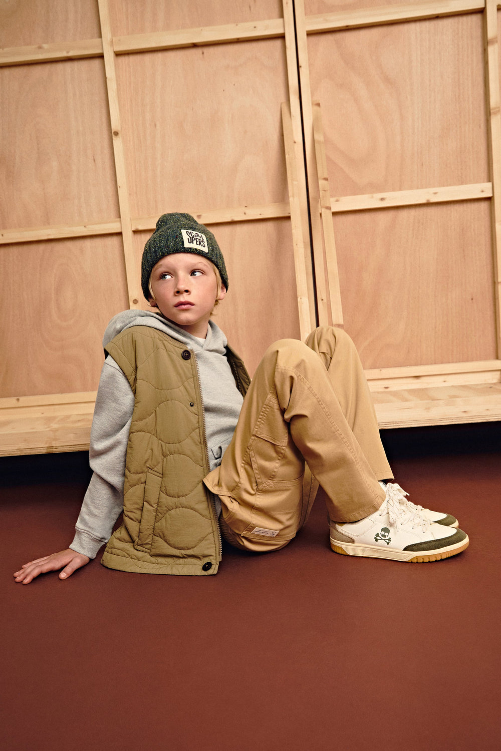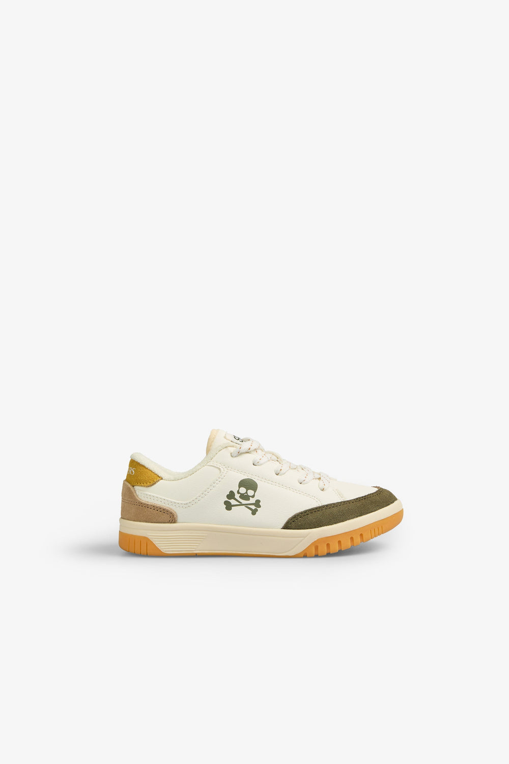Sneakers confeccionadas en piel con detalles en serraje. Cierre con cordones a tono, suela de goma y talón a contraste. Calavera lateral.