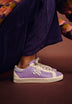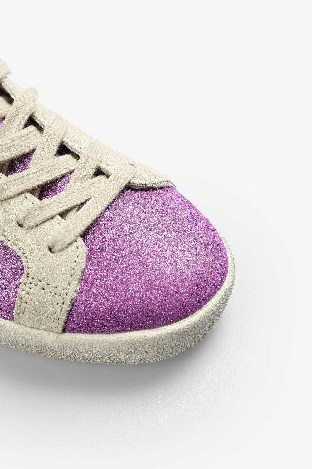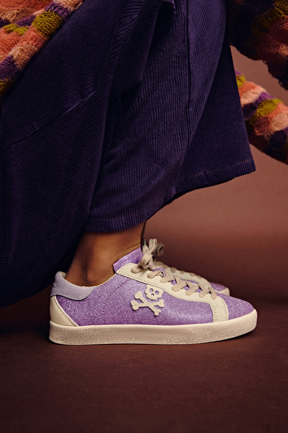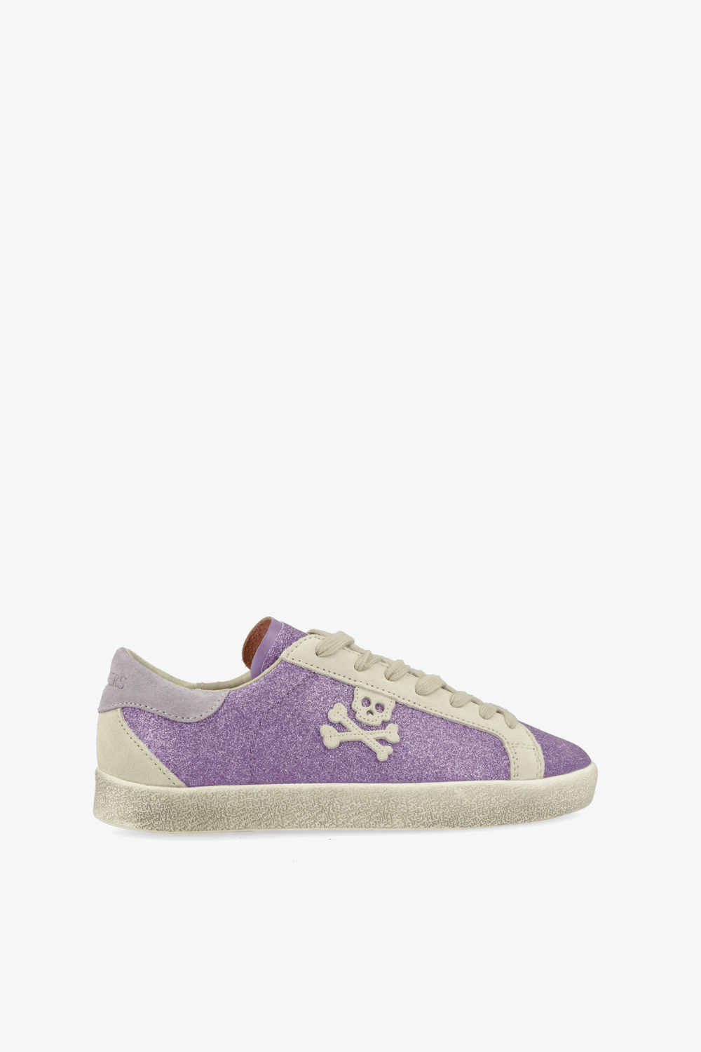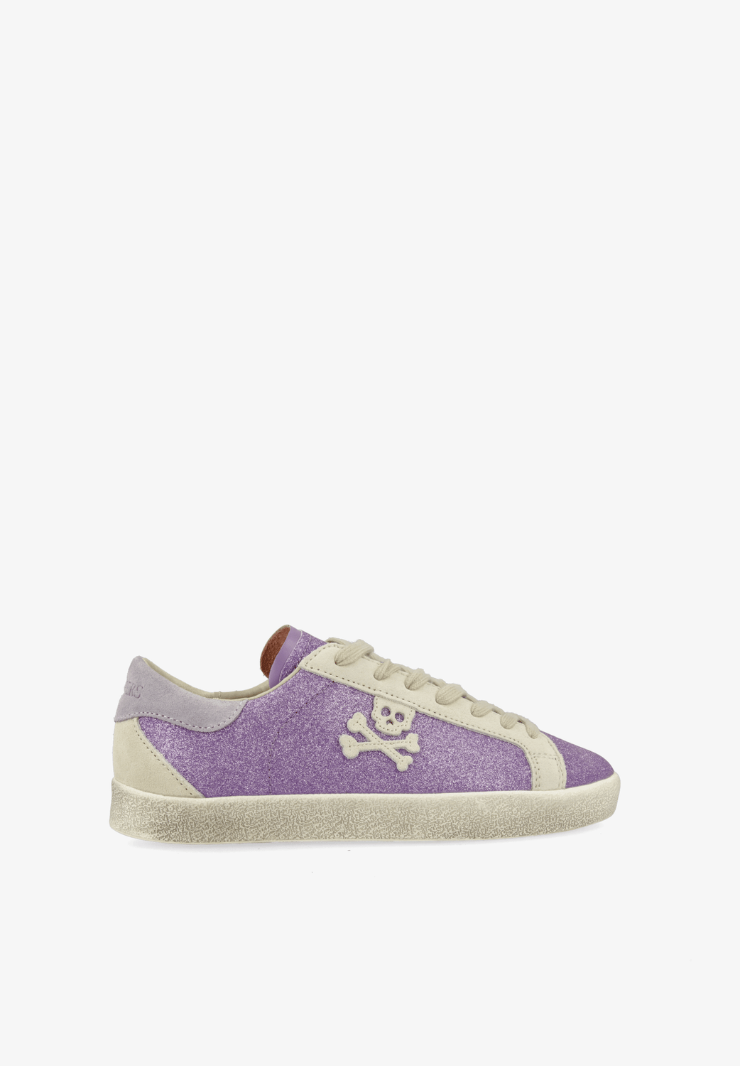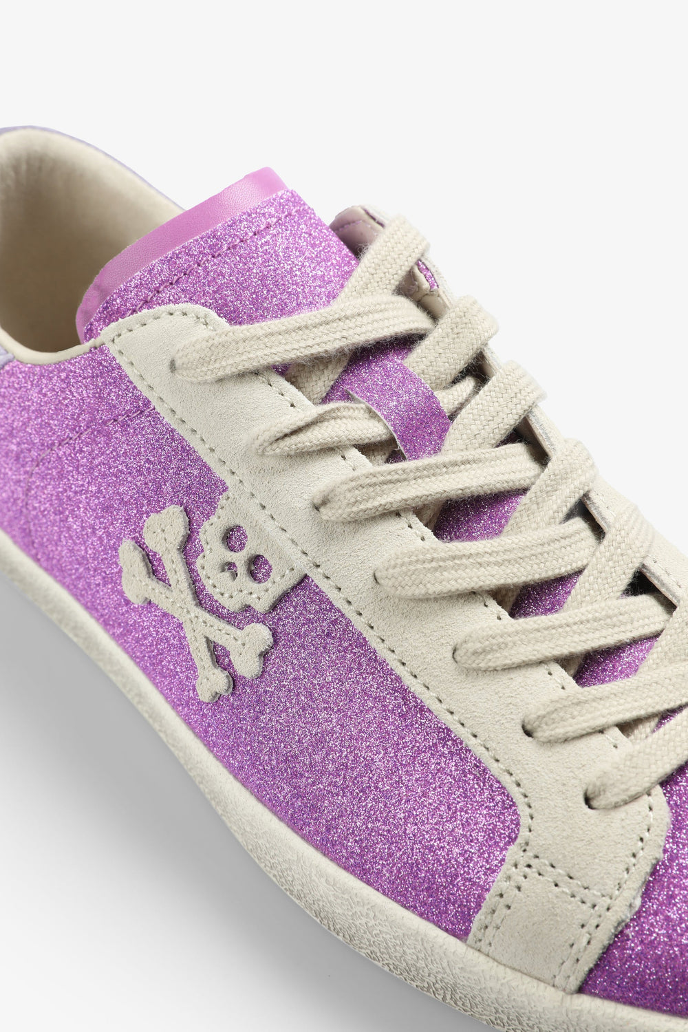 Sneakers bajas glitter con calavera lateral en ante. Cierre con cordones a contraste. Suela de caucho. Detalles de ante a contraste.