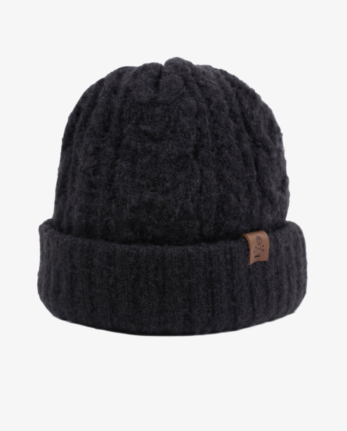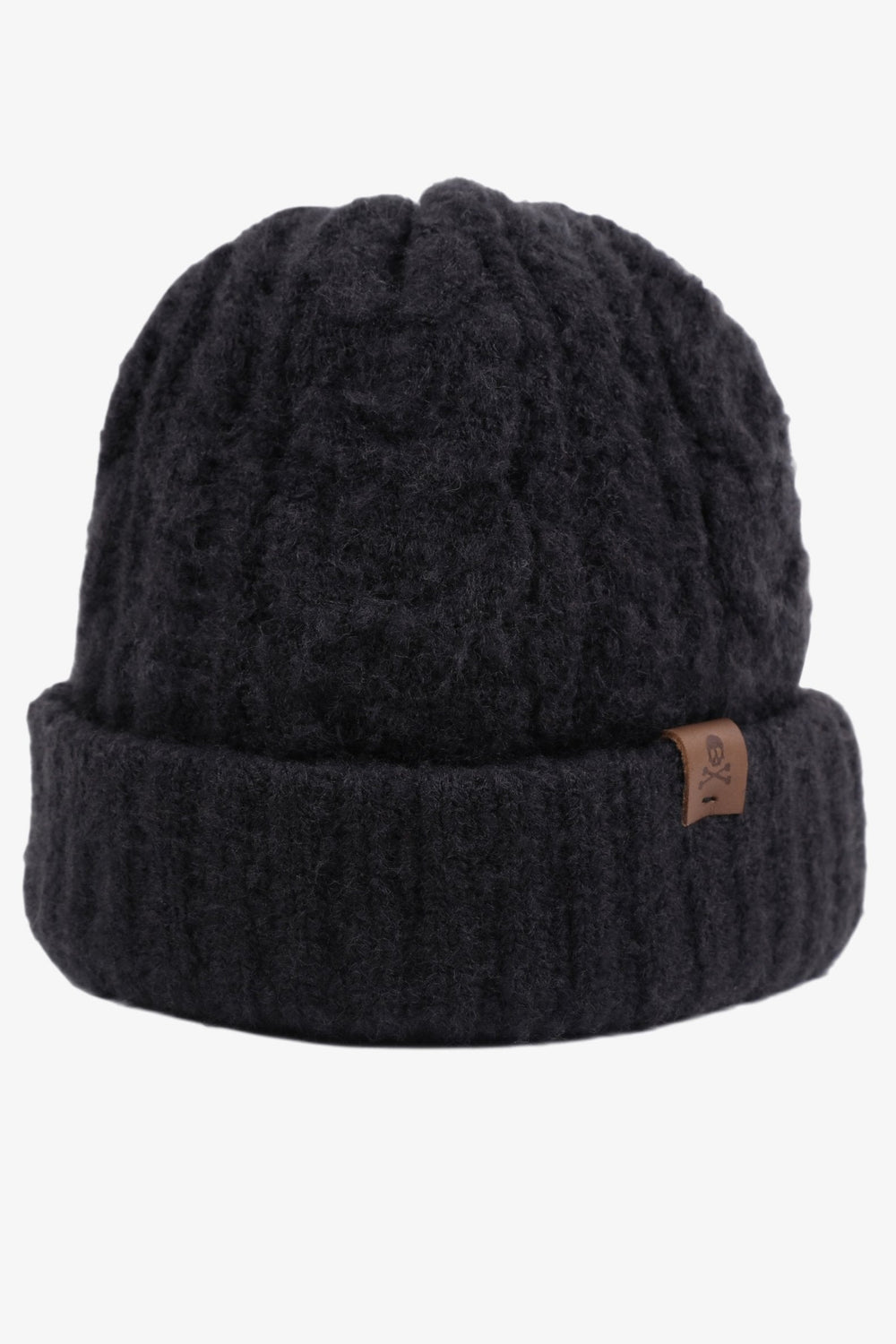 Gorro confeccionado en tejido de lana. Detalle de etiqueta de piel bordada.