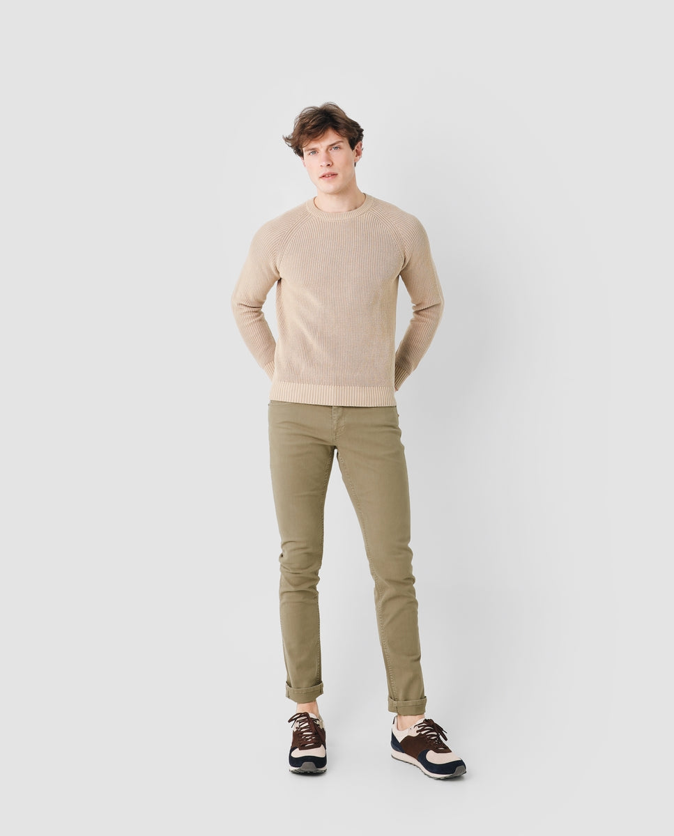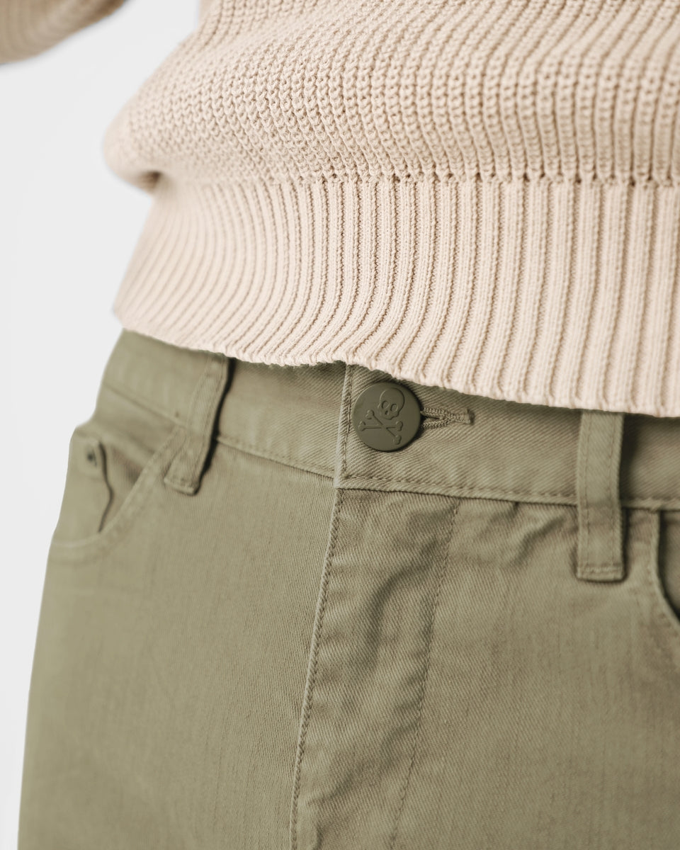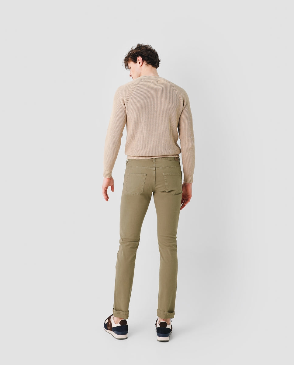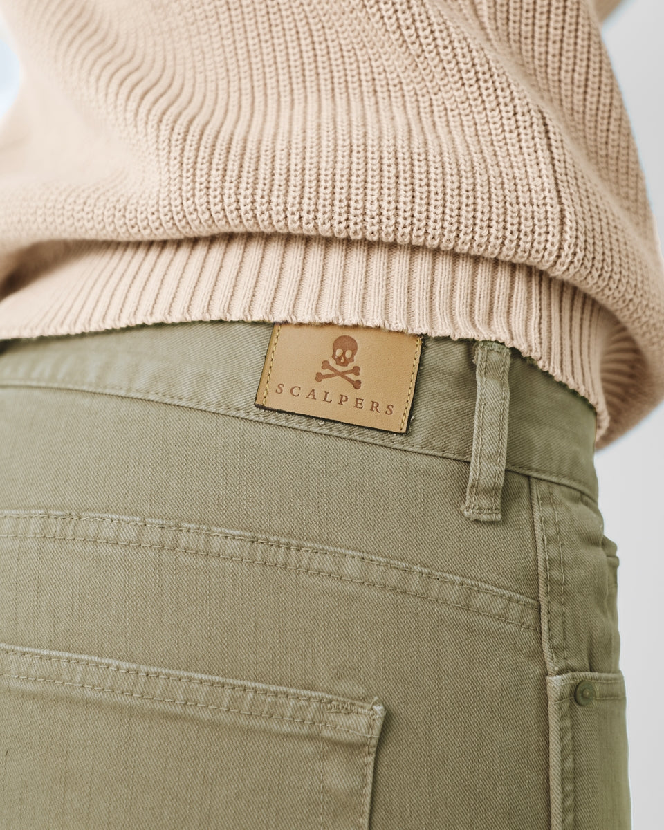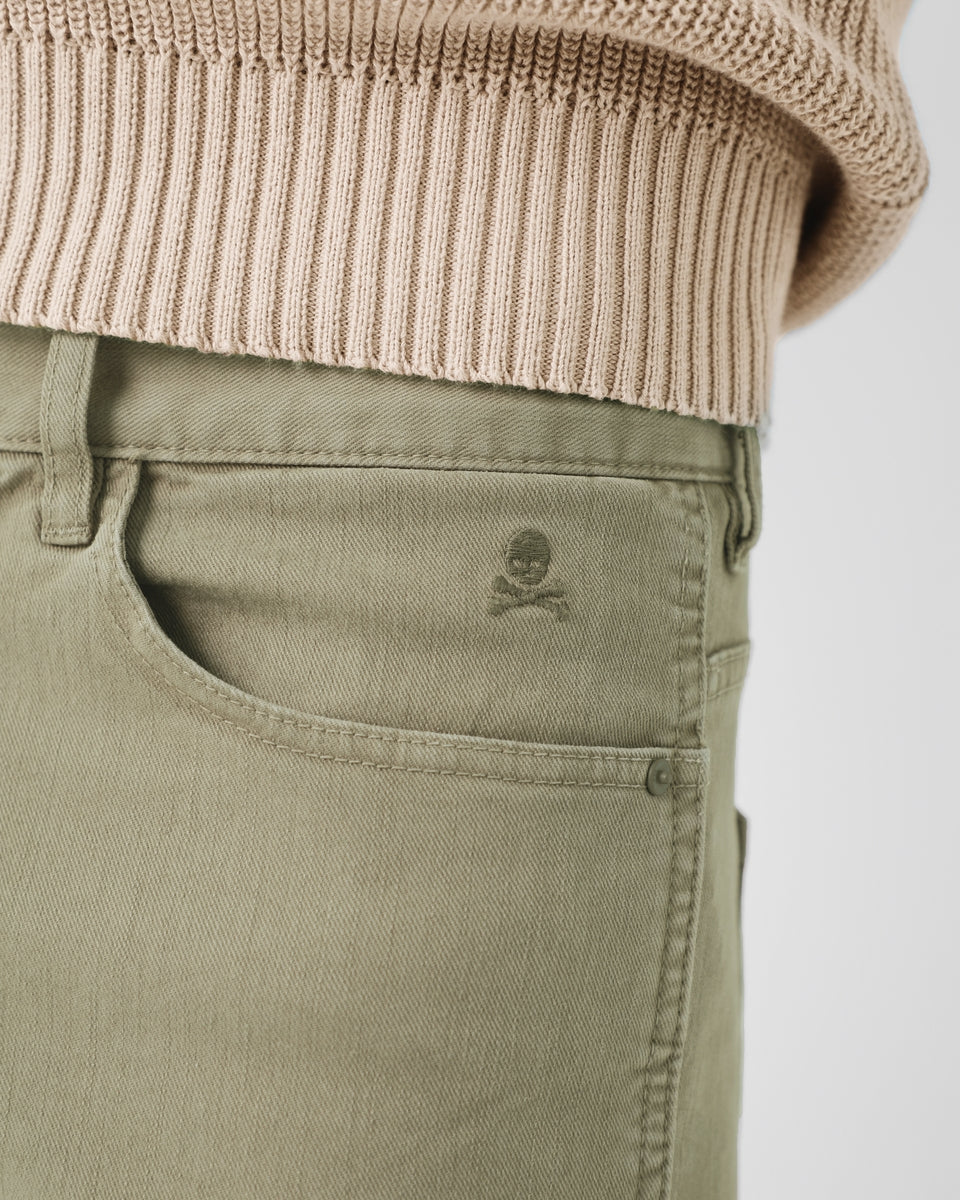 Pantalón garment dyed. Corte recto, cierre con botón y cremallera oculta por tapeta. El botón y los remaches tienen el acabado engomado. Dos bolsillos frontales, dos traseros y uno cerillero. Tiene trabillas y presenta como detalles el logo bordado en el bolsillo y los hilos a contraste en el interior. Disponible en cuatro colores.