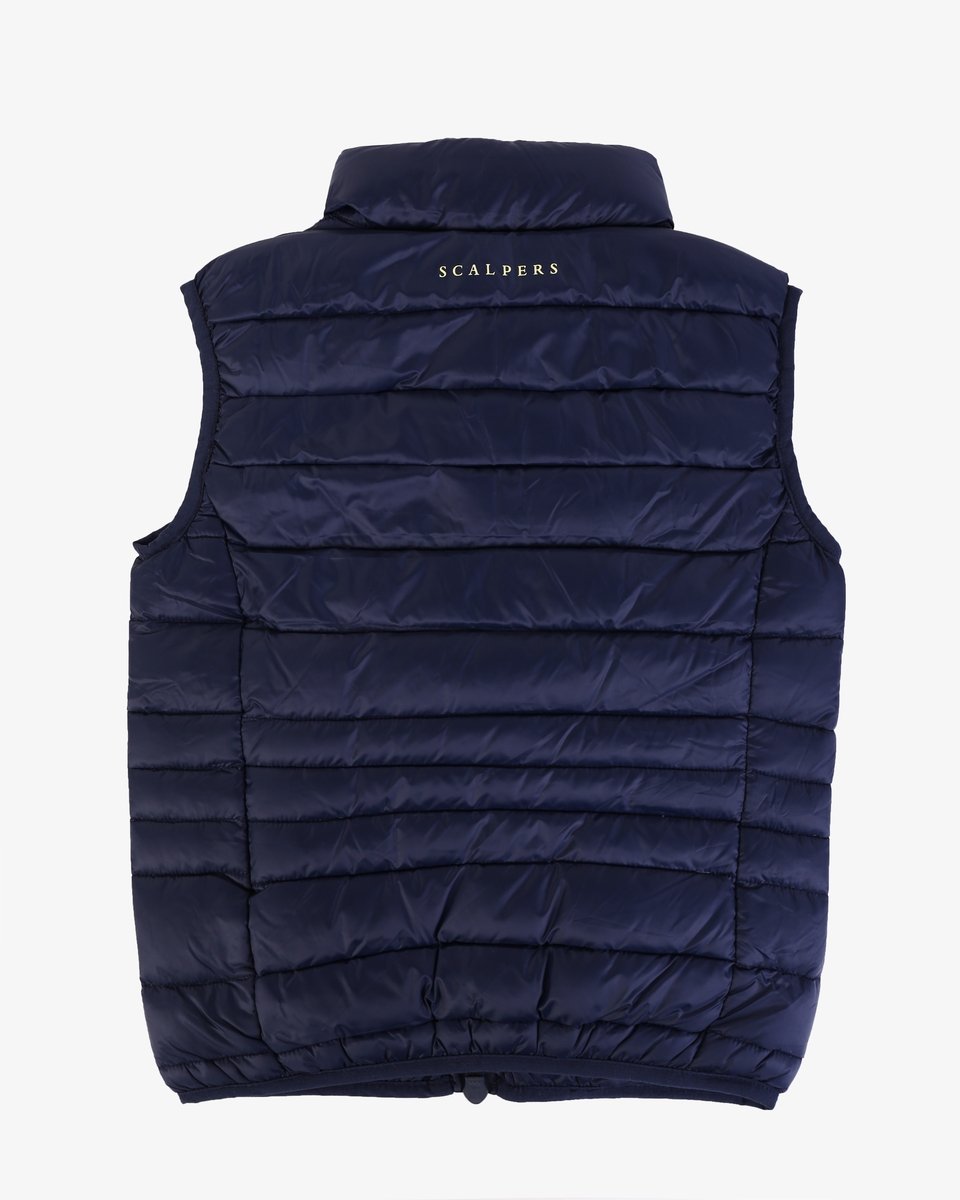 Plumífero sin mangas, confeccionado en nylon. Corte recto, cuello subido y cierre con cremallera de doble carro. Tiene bolsillos con cremallera laterales y presenta como detalle la calavera de goma bordada a tono en el pecho. Disponible en dos colores.