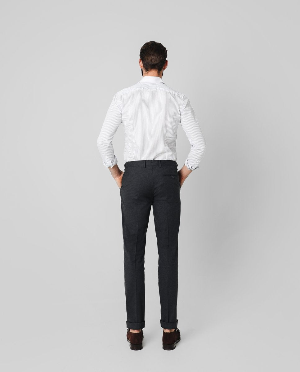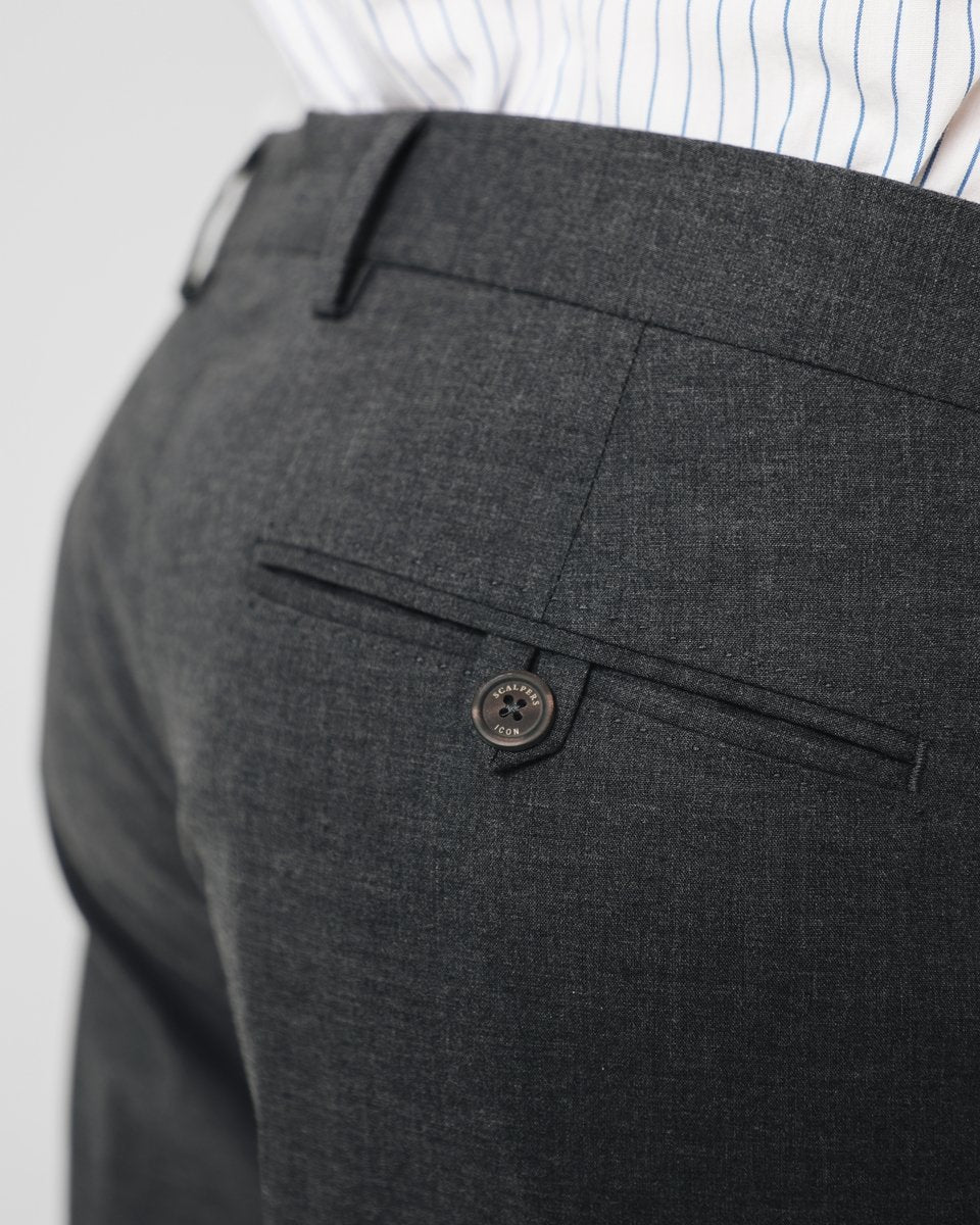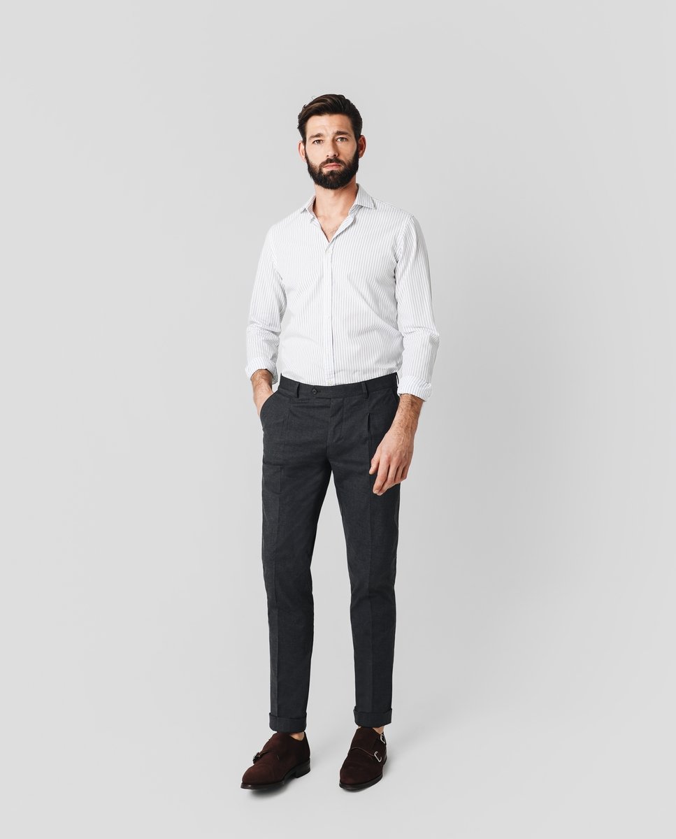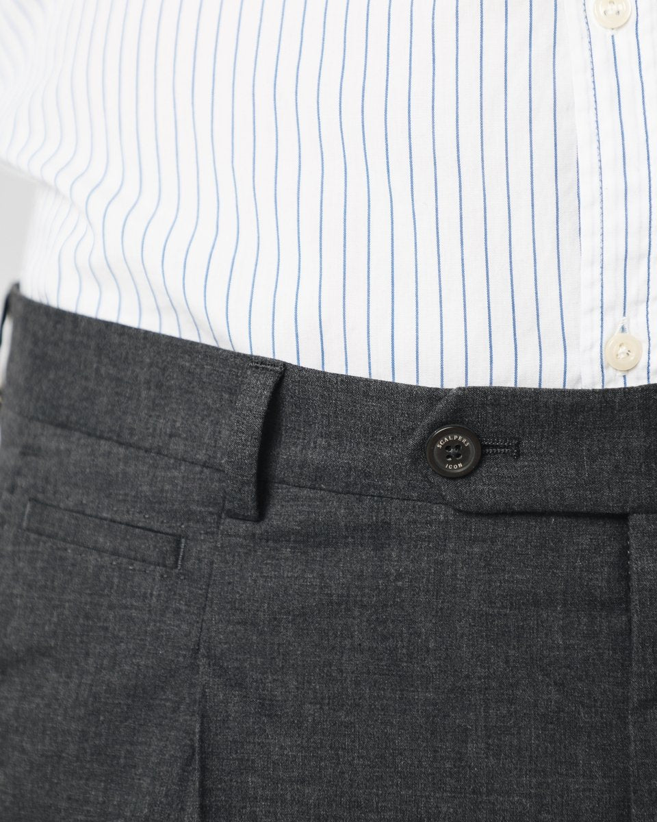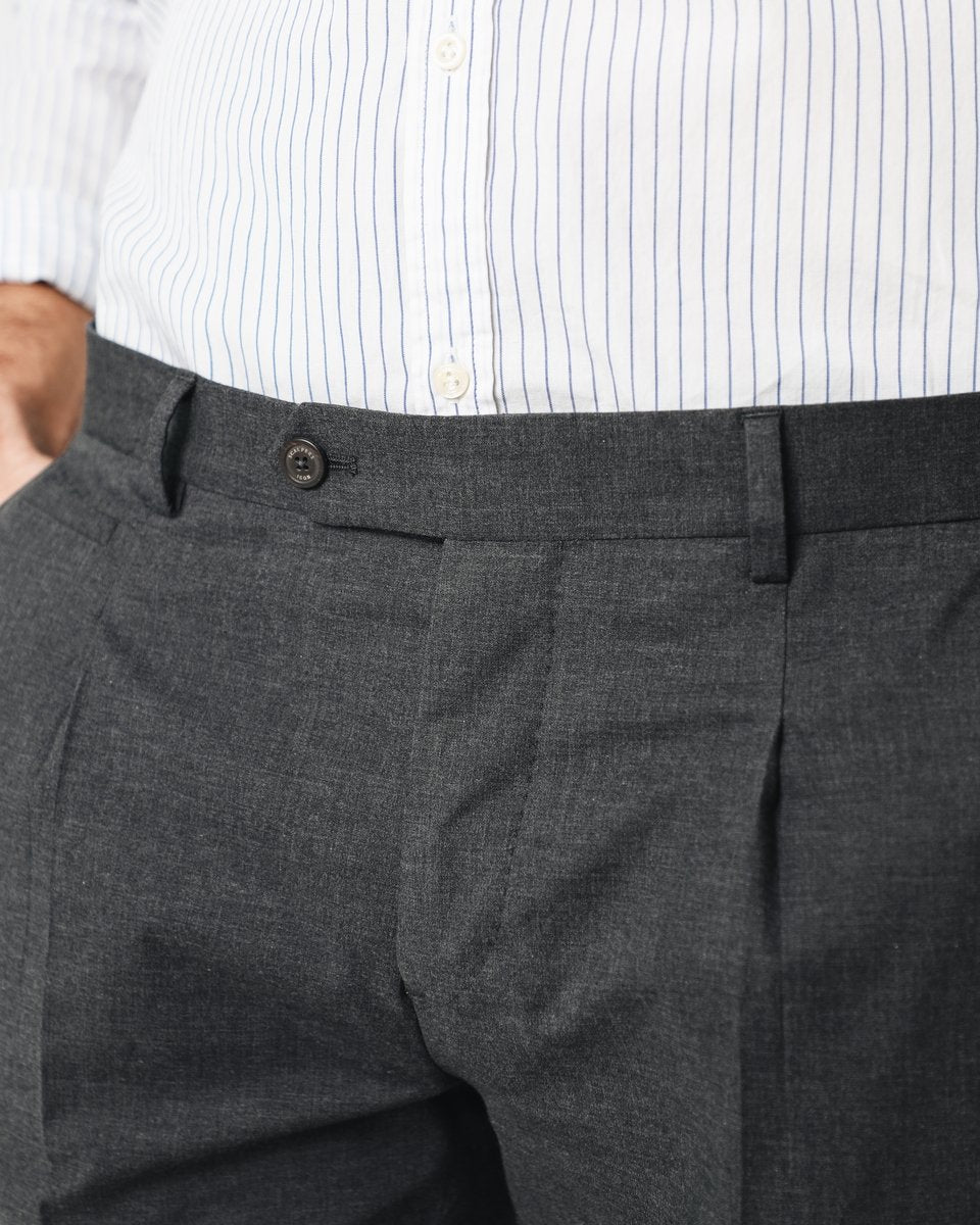 Pantalón formal confeccionado en tejido Di Sondrio. Construcción sartorial con pinza, cierre con botones y la cinturilla prolonga con botón visto. Bolsillos monederos y bajo terminado en vuelta.