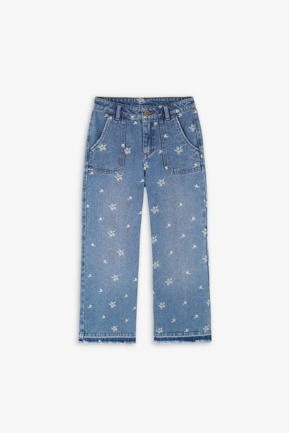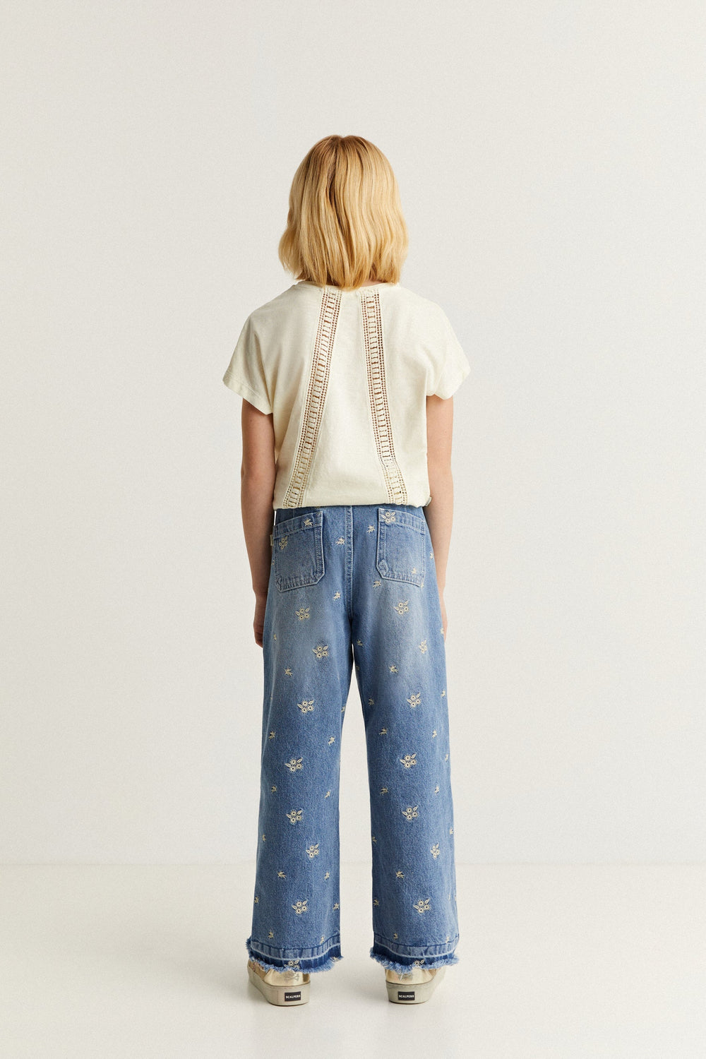 Pantalón vaquero wide leg con detalles bordados a contraste.