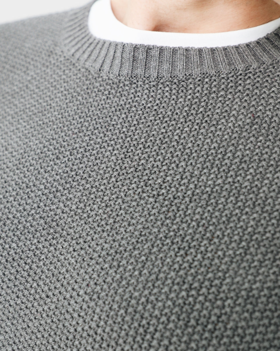 Jersey confeccionado en punto grueso. Corte recto, cuello redondo y manga larga. Puño y bajo terminado en ribs.