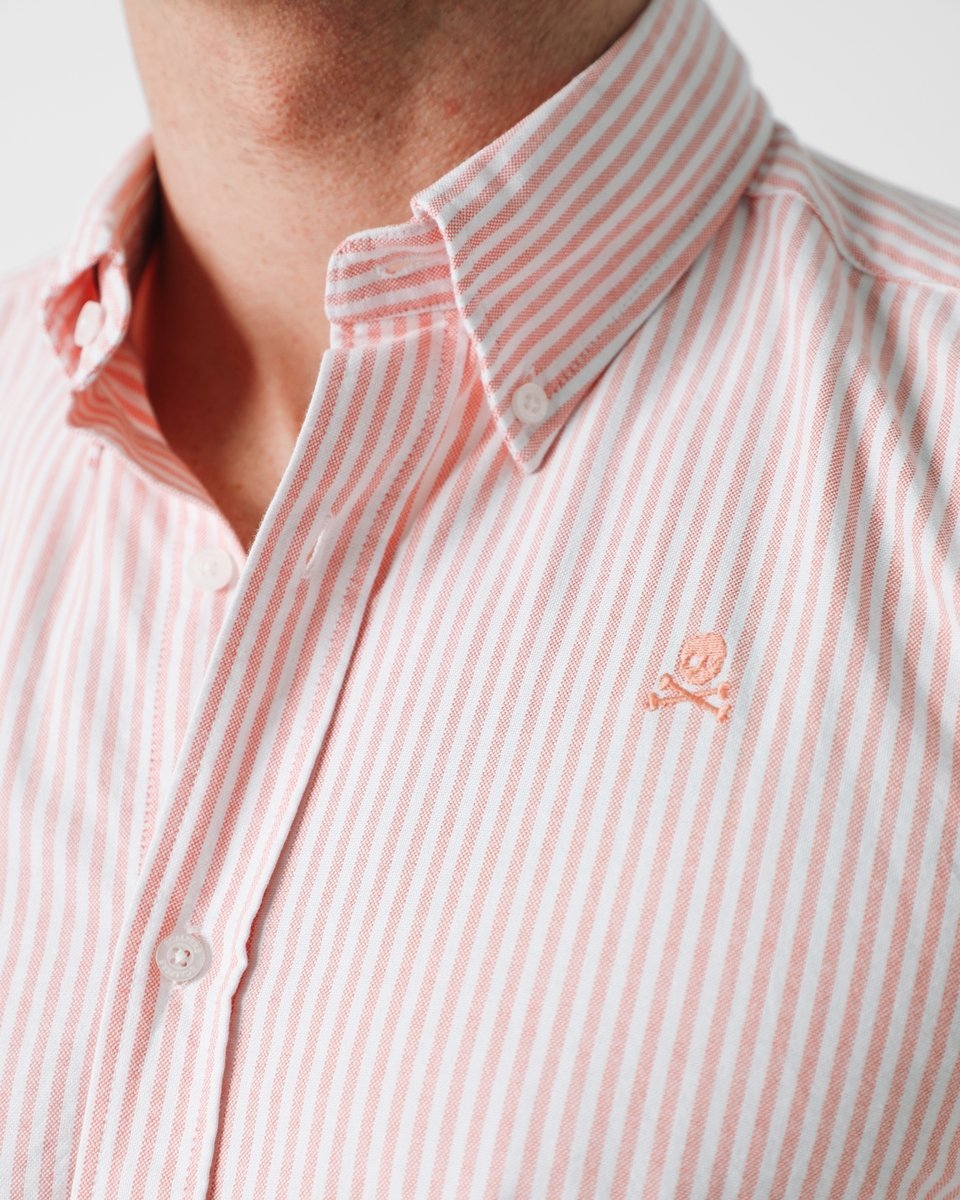 Camisa confeccionada en tejido 100% algodón. Corte Regular Fit, cuello button down y cierre con botones. Manga larga con puño simple y detalle de calavera bordada a tono en el pecho.