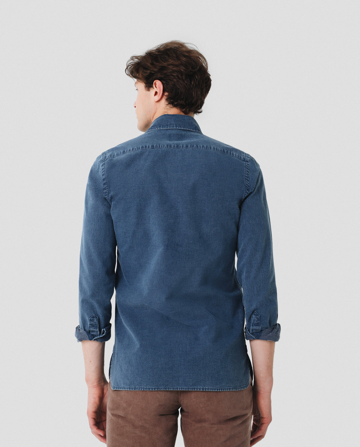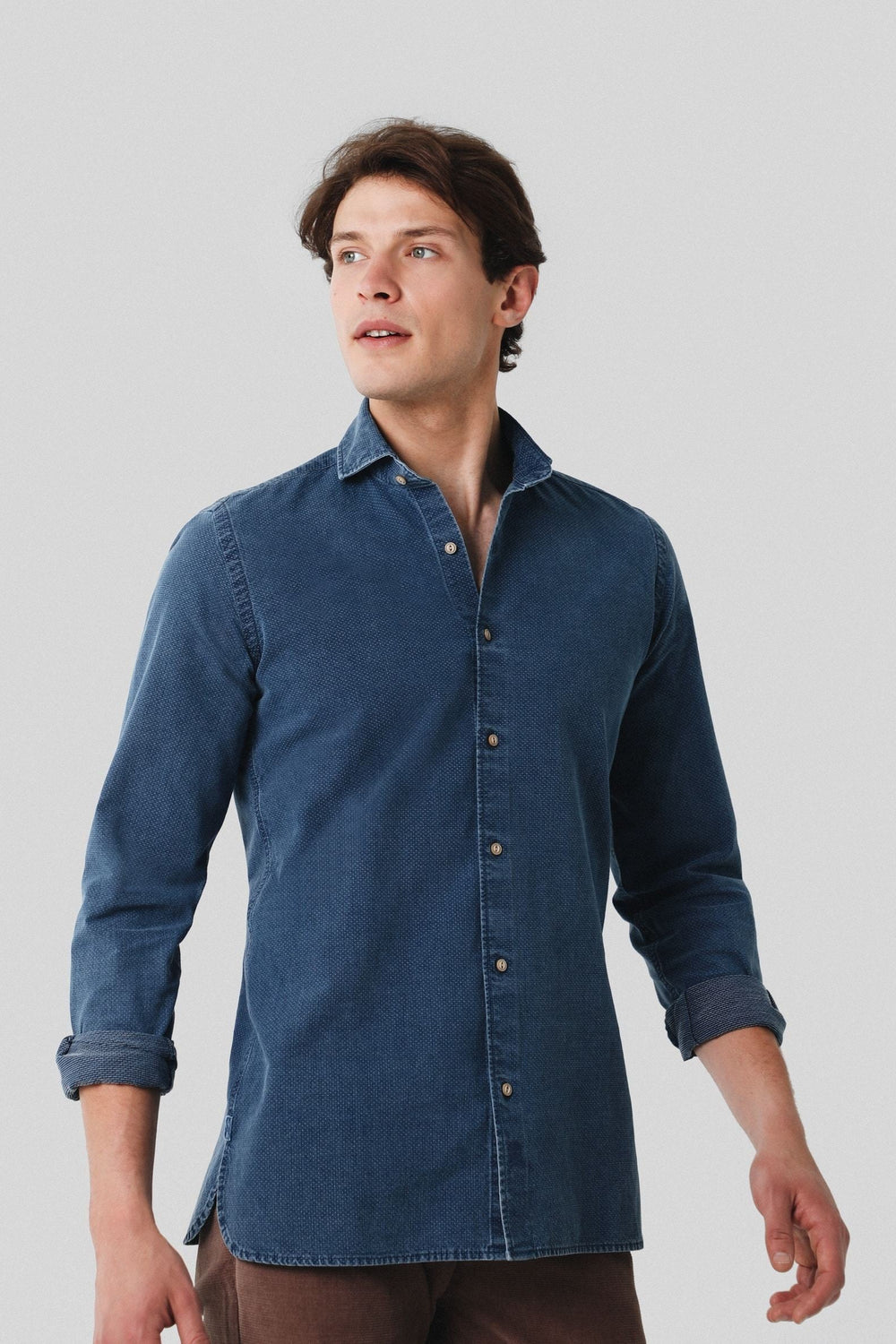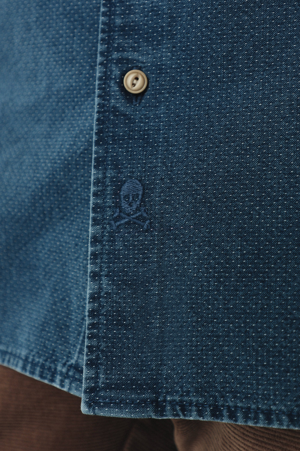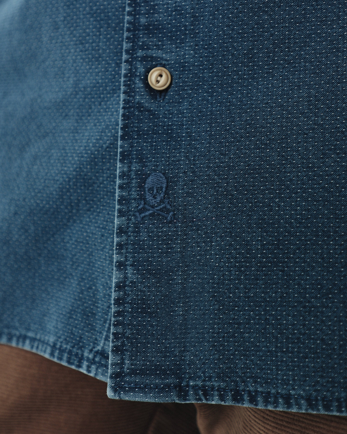 Camisa confeccionada en tejido denim. Corte Regular Fit, cuello Sport Elisée con ballenas y cierre con botones sin tapeta. Manga larga terminada en puño simple. Bajo redondeado. y detalle de calavera bordada en el bajo.