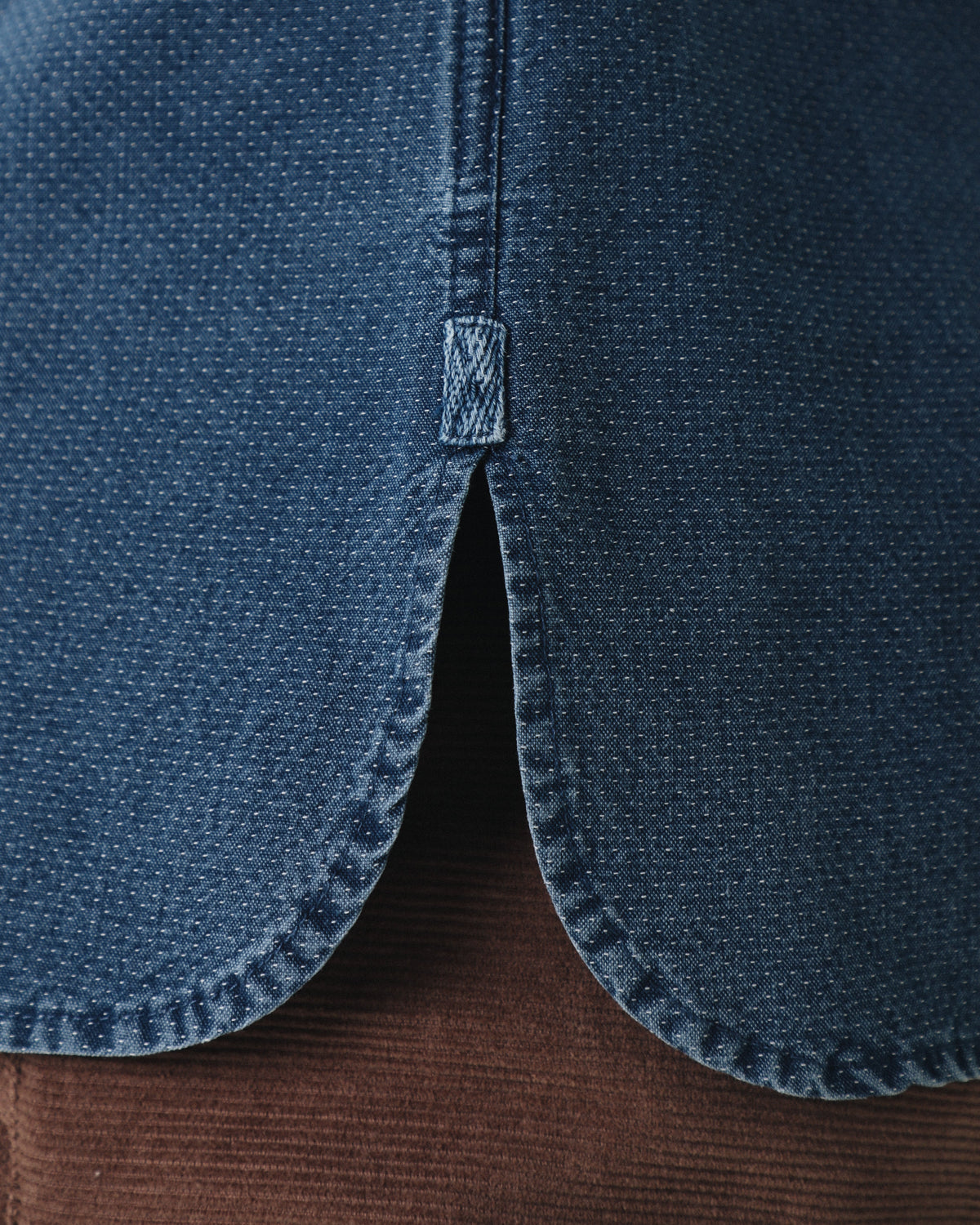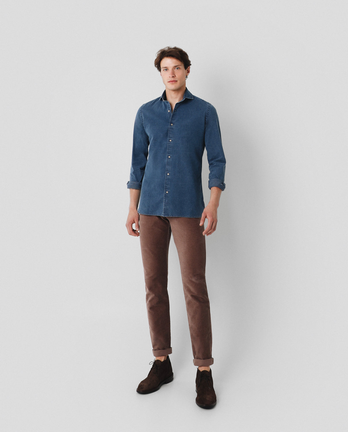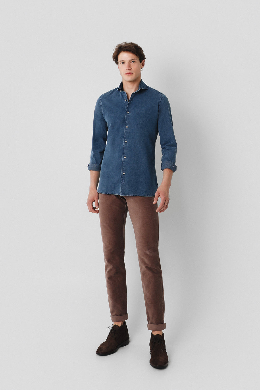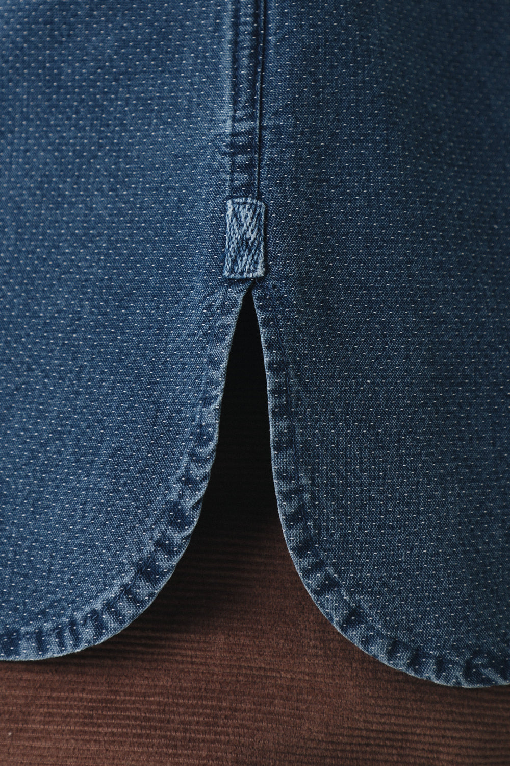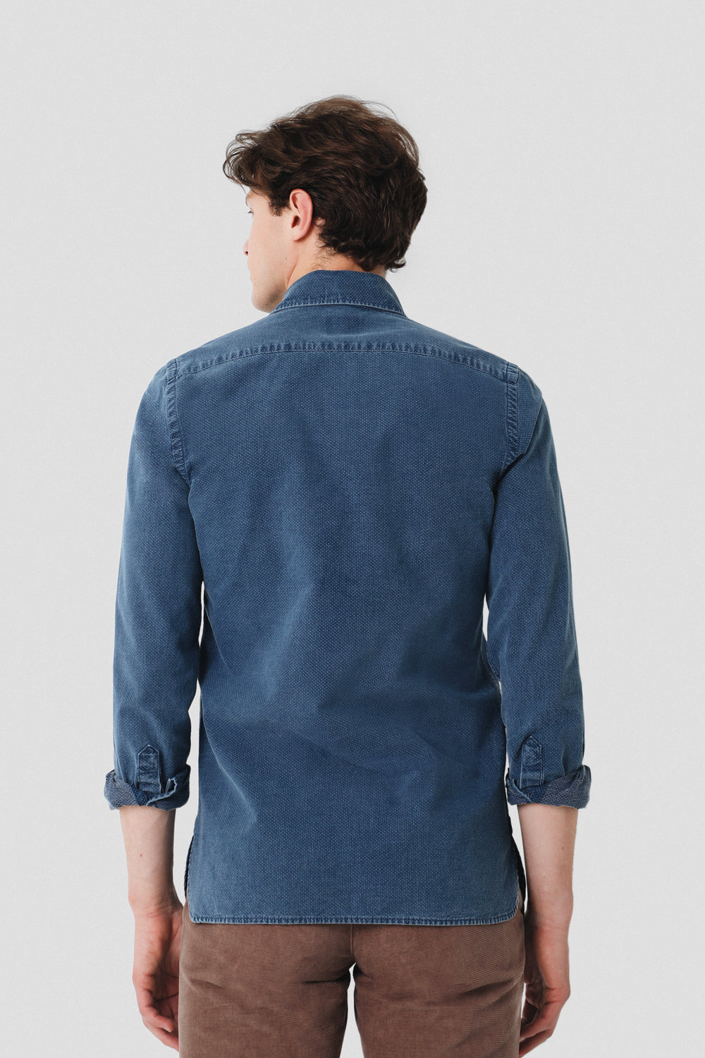 Camisa confeccionada en tejido denim. Corte Regular Fit, cuello Sport Elisée con ballenas y cierre con botones sin tapeta. Manga larga terminada en puño simple. Bajo redondeado. y detalle de calavera bordada en el bajo.