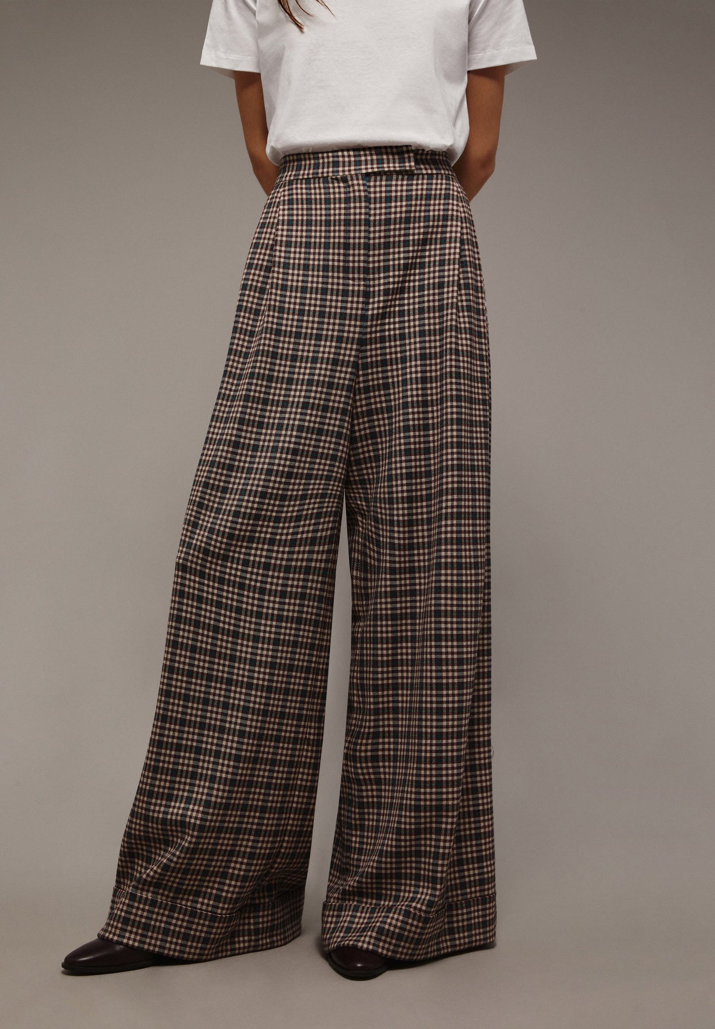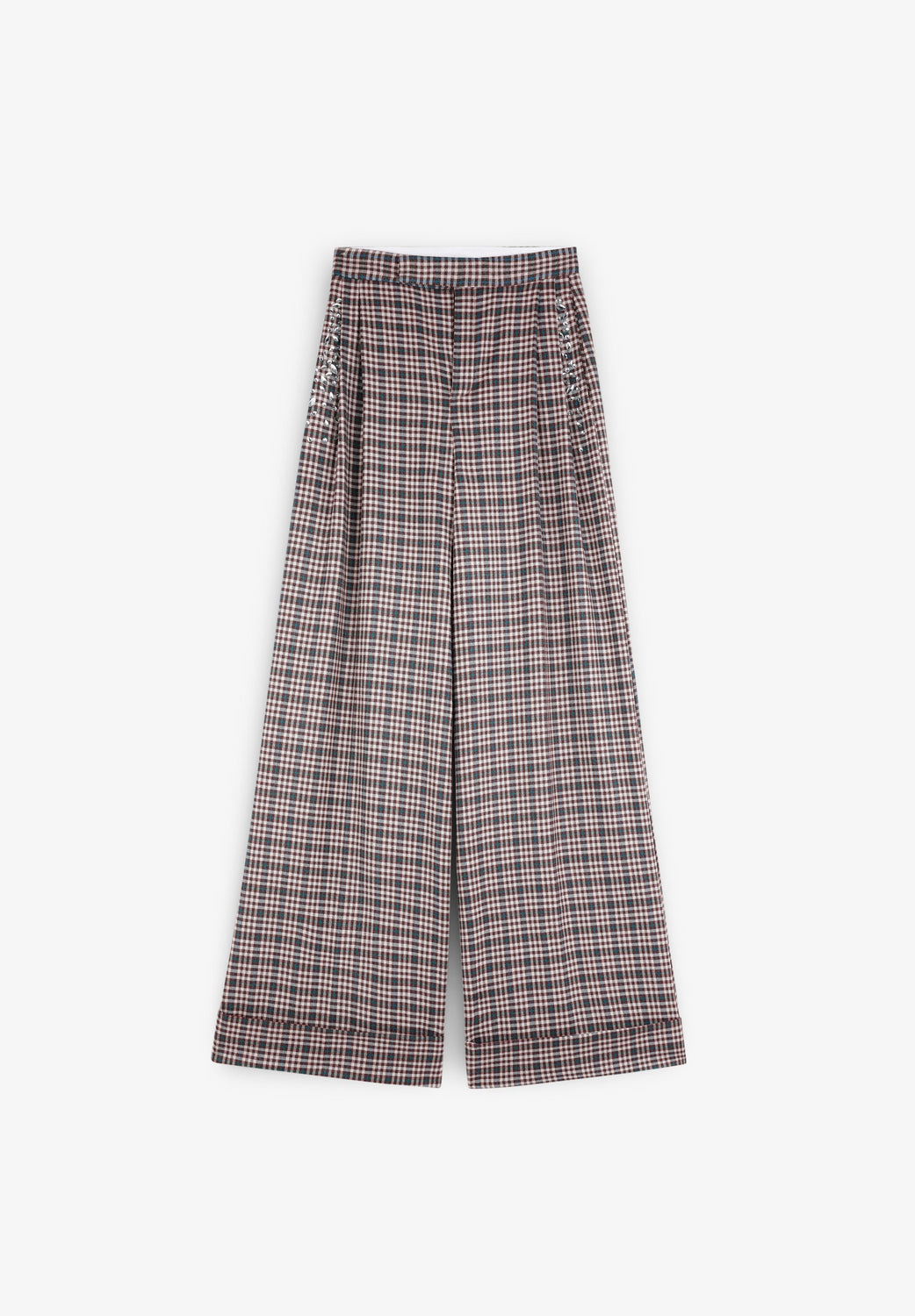 Pantalón de cuadros con pinzas y detalle de cristales.