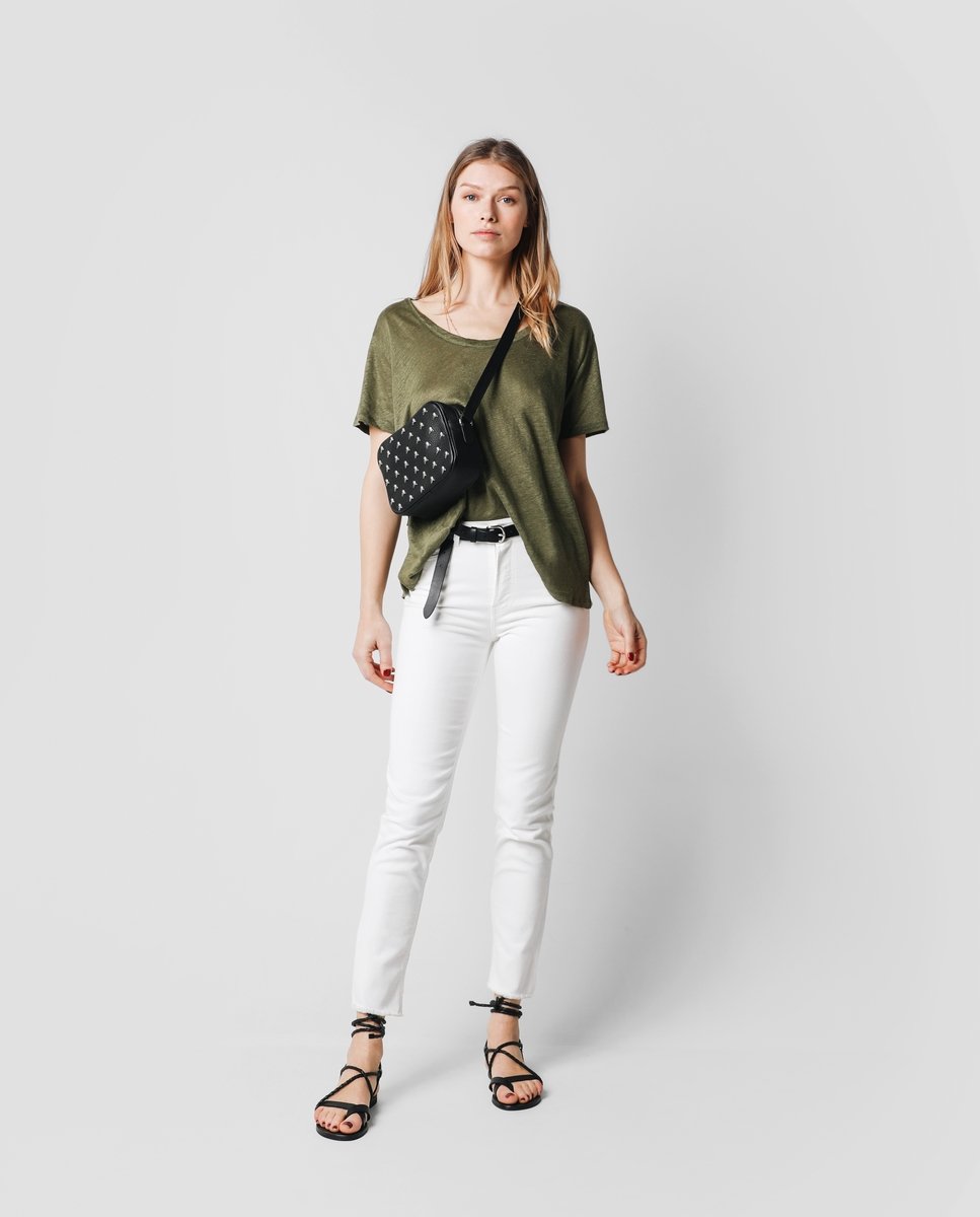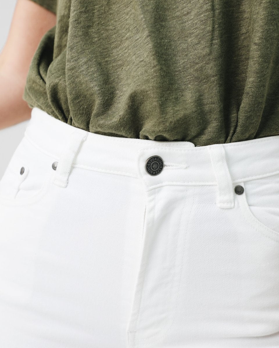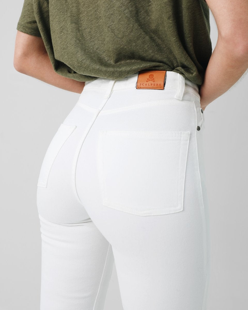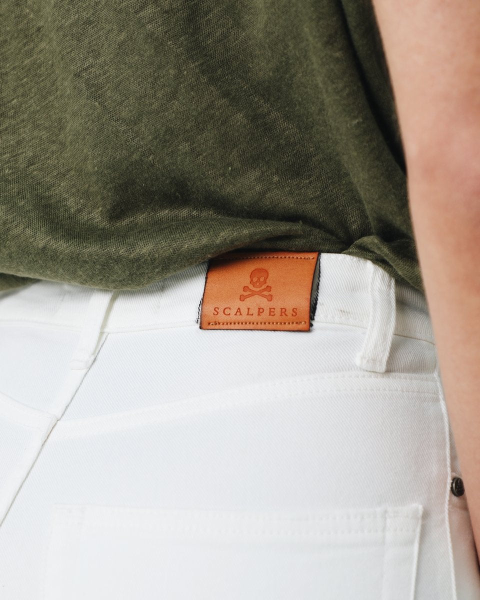 Pantalón confeccionado en tejido de sarga. Corte recto con tiro alto, cierre con botón y cremallera oculta por tapeta. Cinco bolsillos, bajo flecado y trabillas. Presenta como detalle la etiqueta de piel y el logo bordado en el bolsillo trasero. Disponible en dos colores.