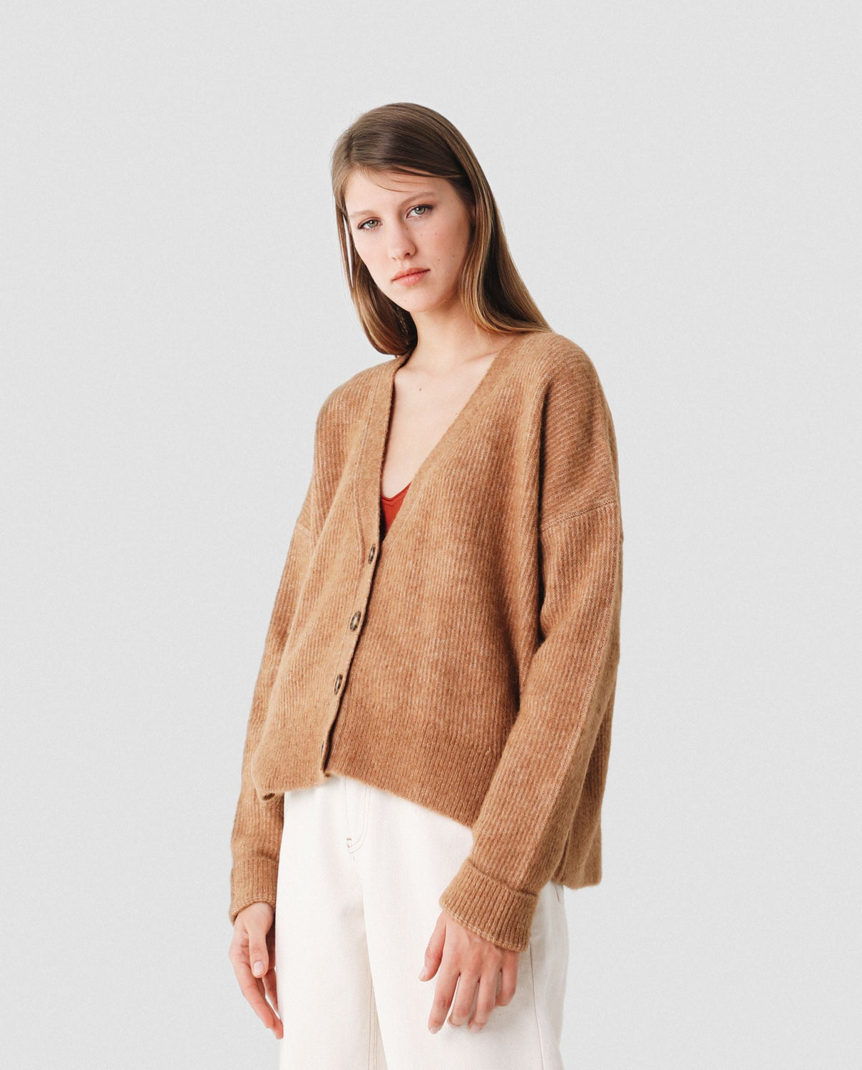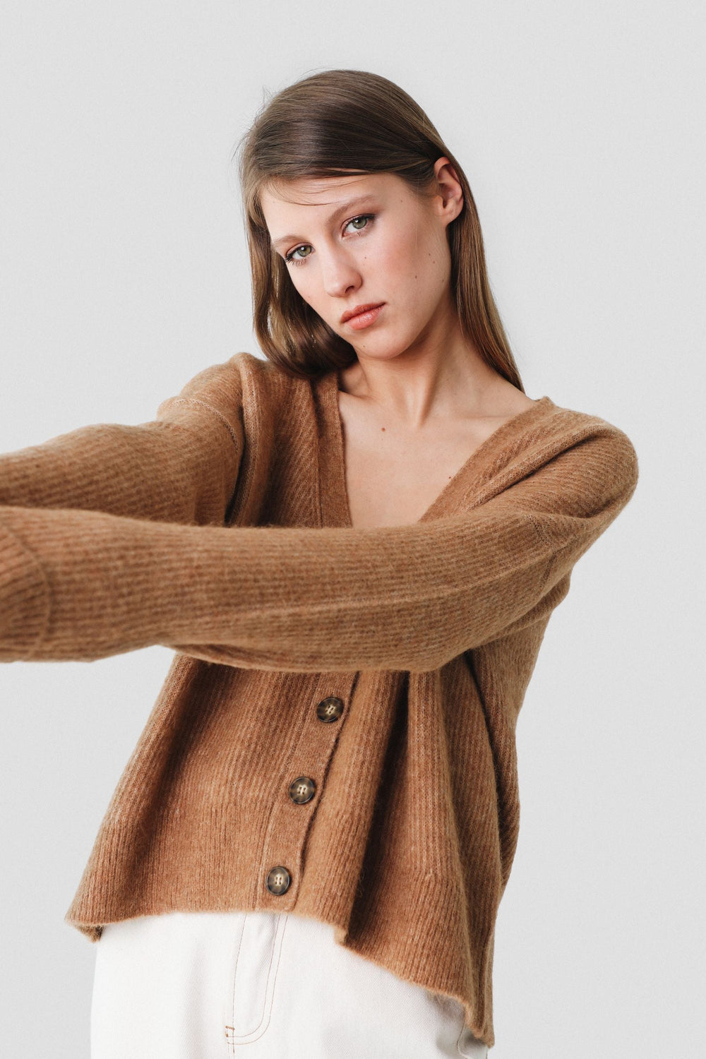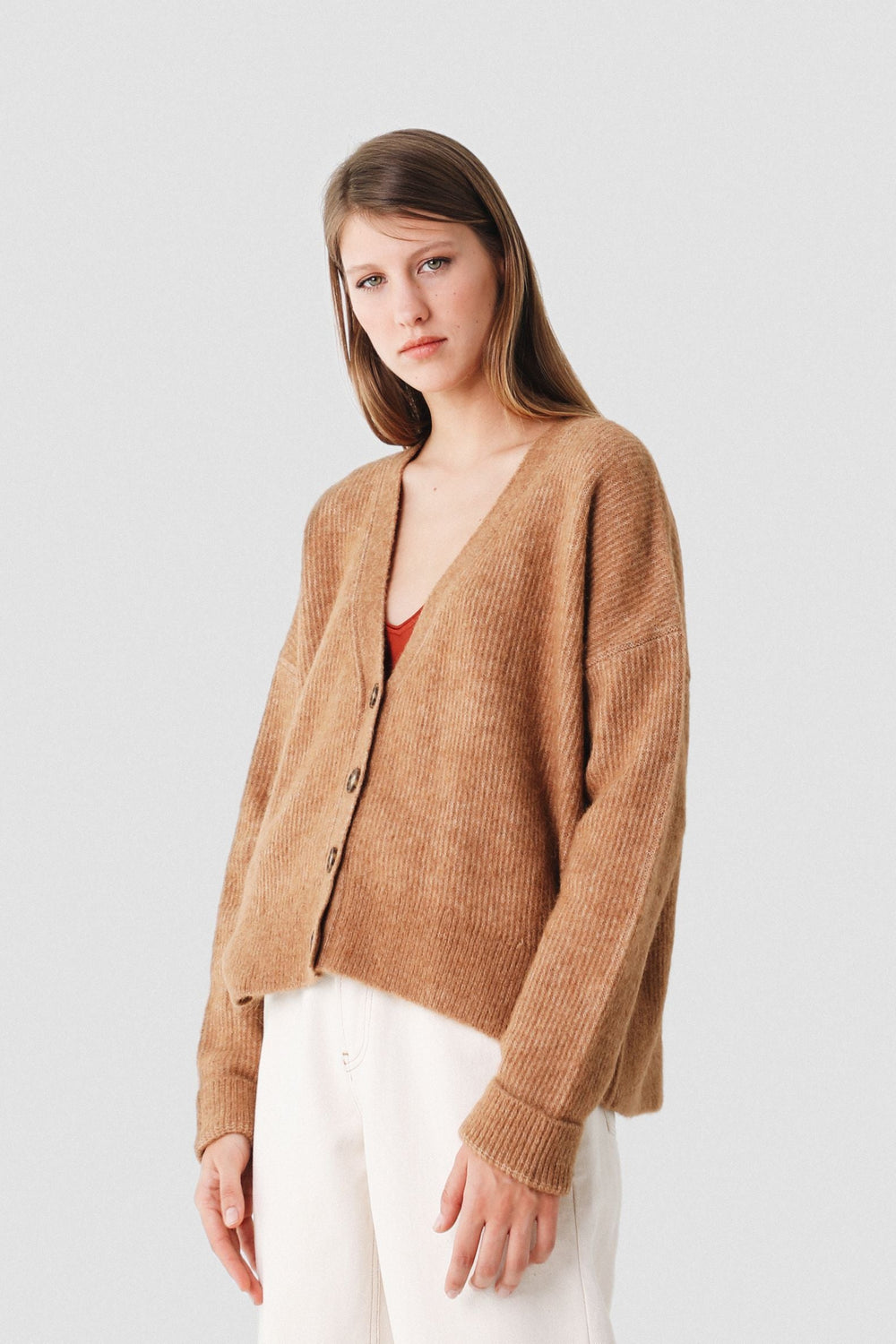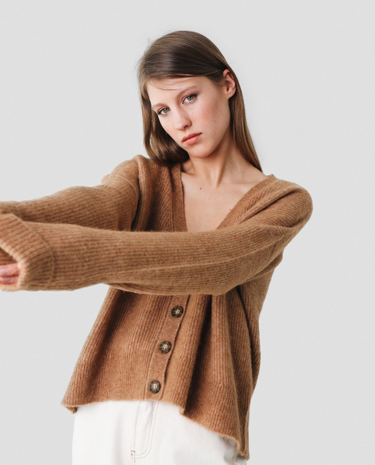 Cárdigan corto confeccionado en tejido de punto. Corte oversize, cuello de pico y cierre con botones de carey.